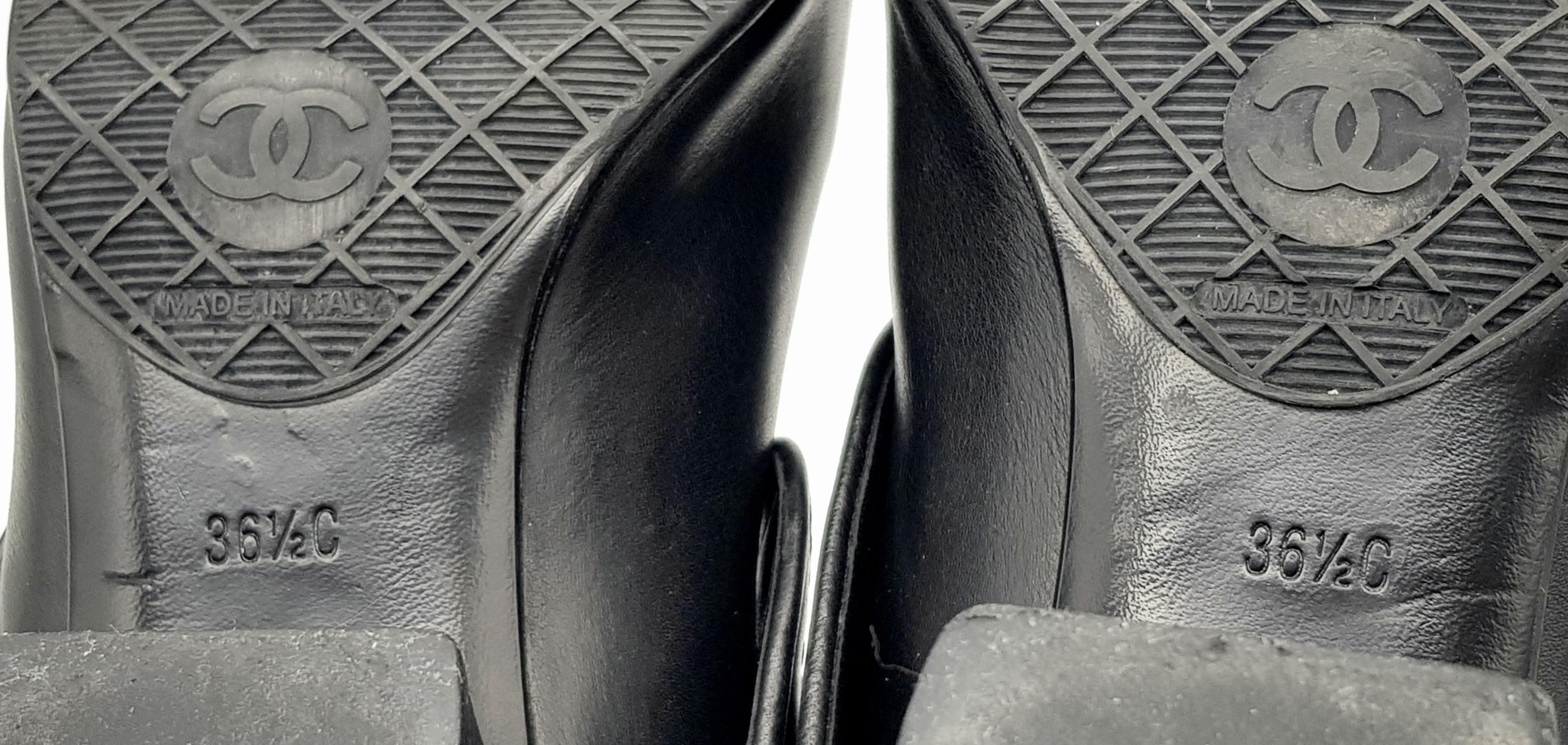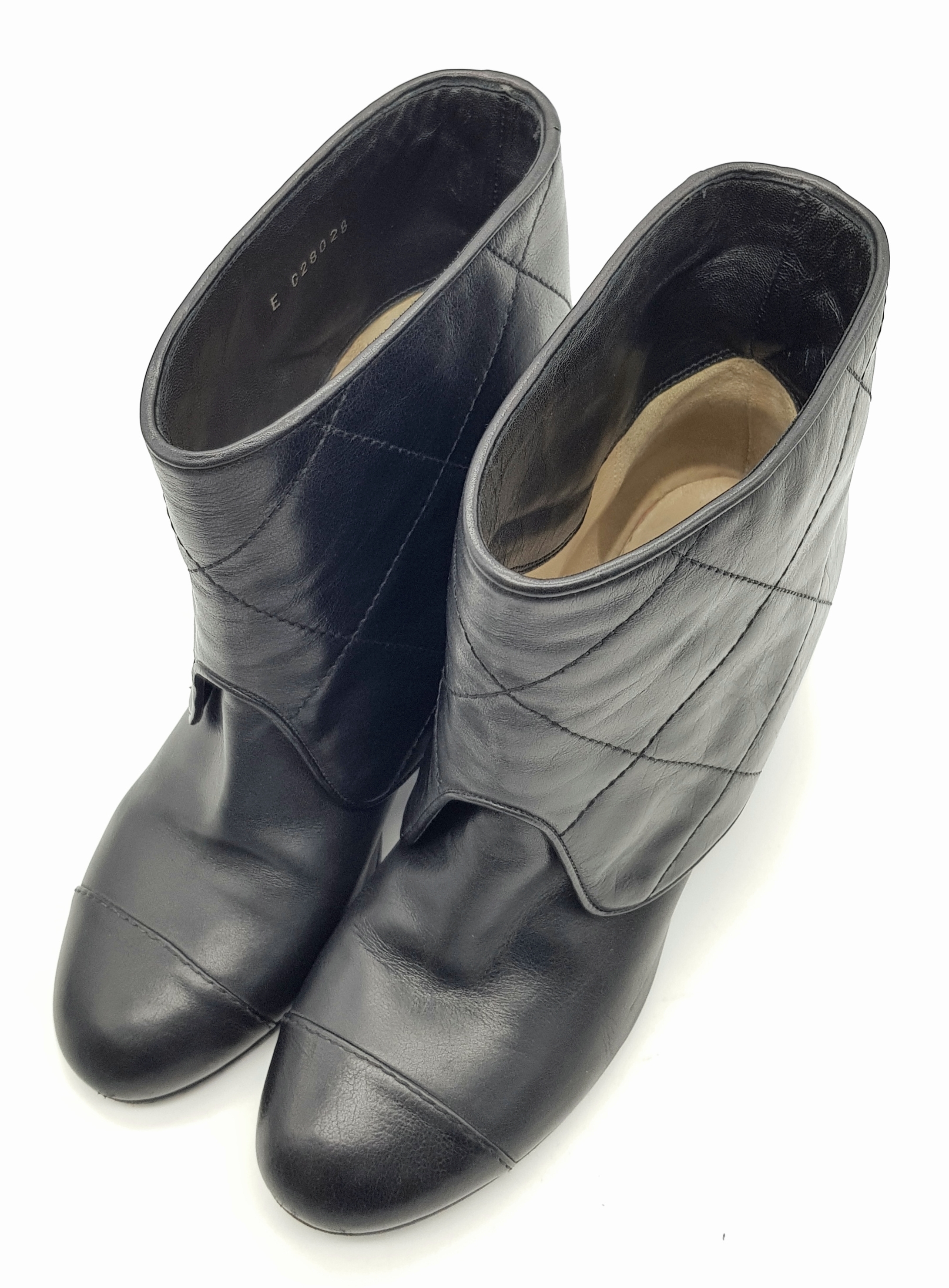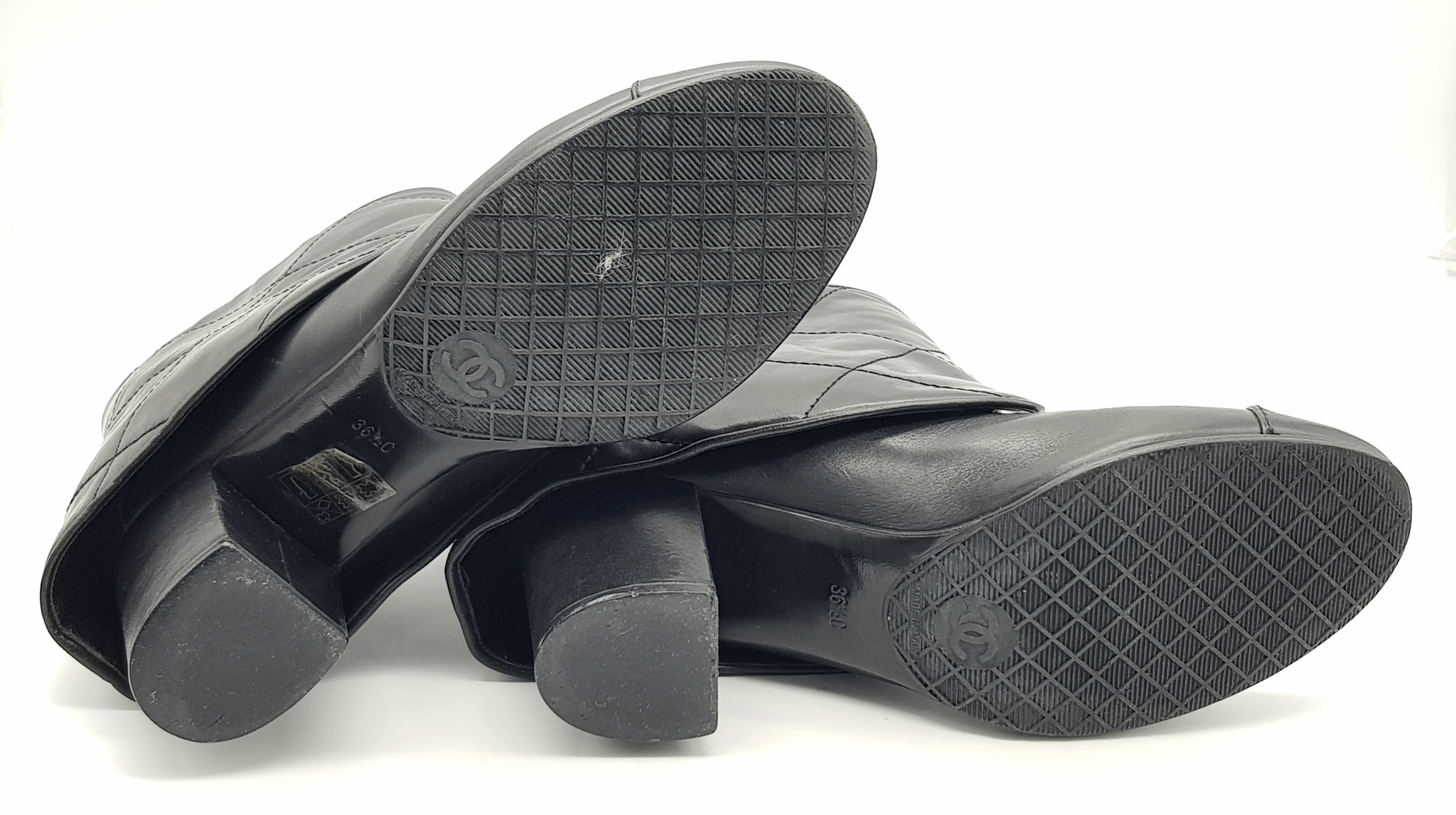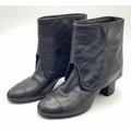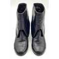A Pair of Chanel Black Quilted Leather Ankle Boots. Black leather featuring a fold-over cuff design, 7cm block heels adorned with silver-tone CC logo hardware at the back, and leather soles stamped “Made in Italy.” The total height of the boots are approximately 19cm. Size 36½ EU (UK 3.5). Some signs of wear to soles and slight creasing to the uppers. Please see photos or request a condition report. Ref: JJ539.