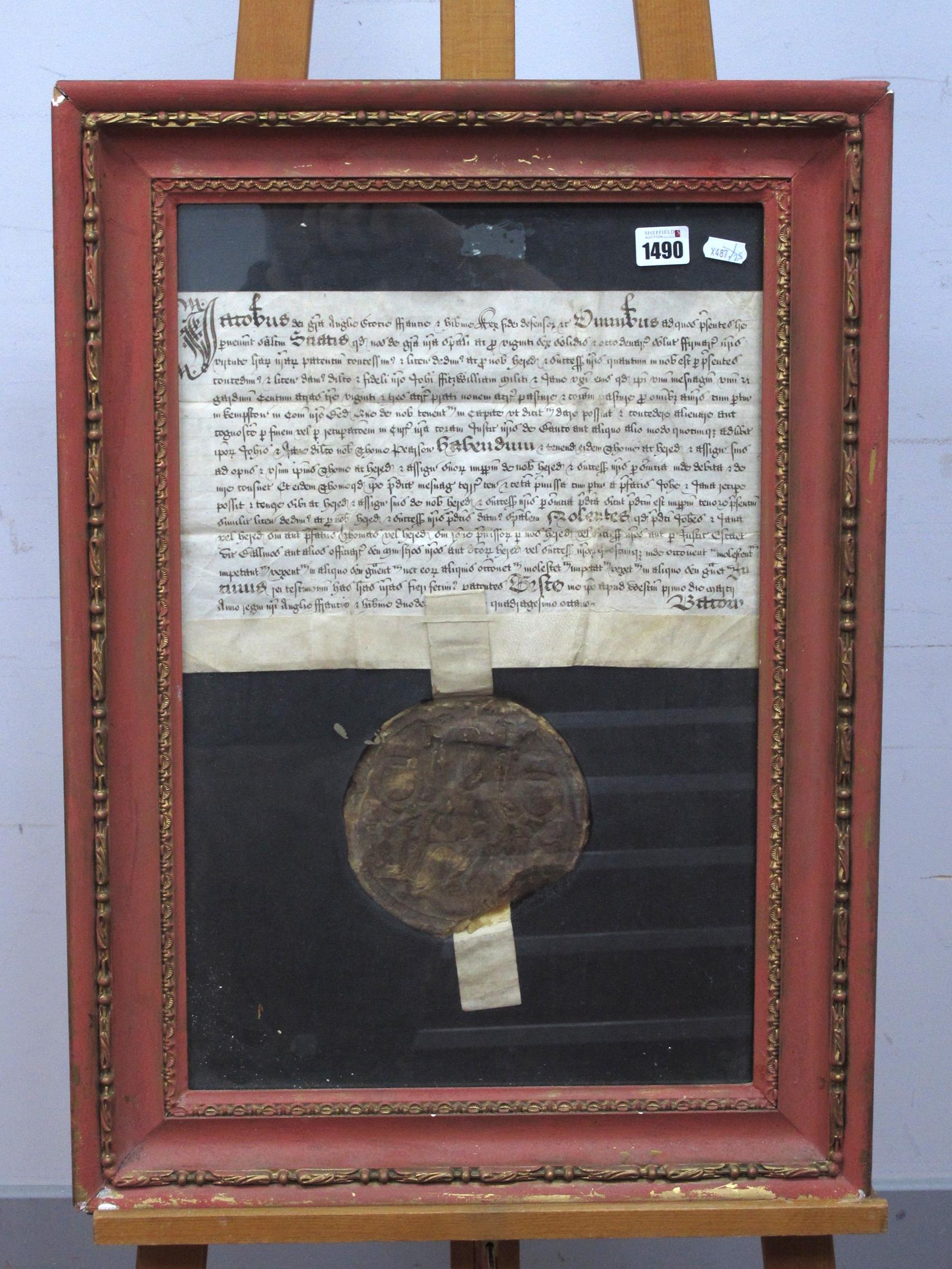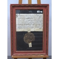 An Interesting James I Wax Seal, with thread through vellum ribbon and attached document, framed and glazed.