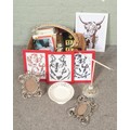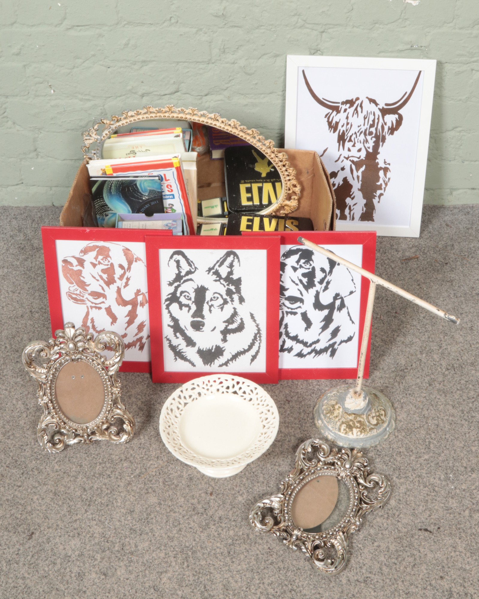 A box of mixed collectables including creamware style cake stand, necklace stand, mirror and decorative frames with a small selection of books including antique reference books, prints etc