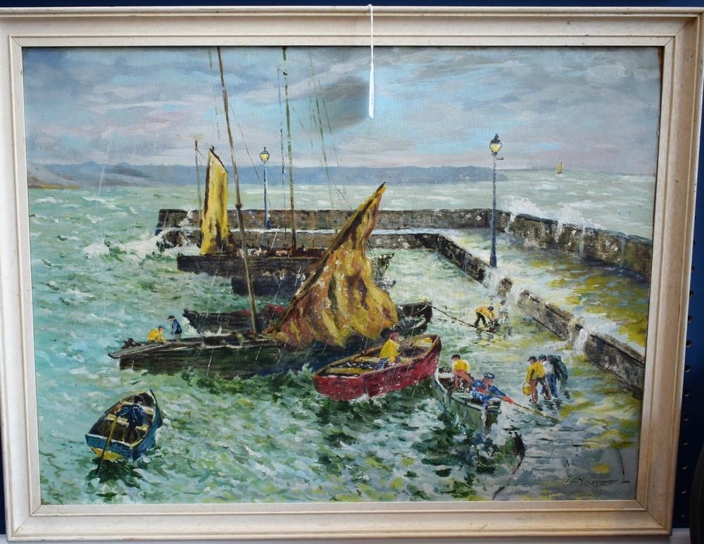 W Snow Fishermen Returning to Harbour signed, oil on board, 45cm x 60cm