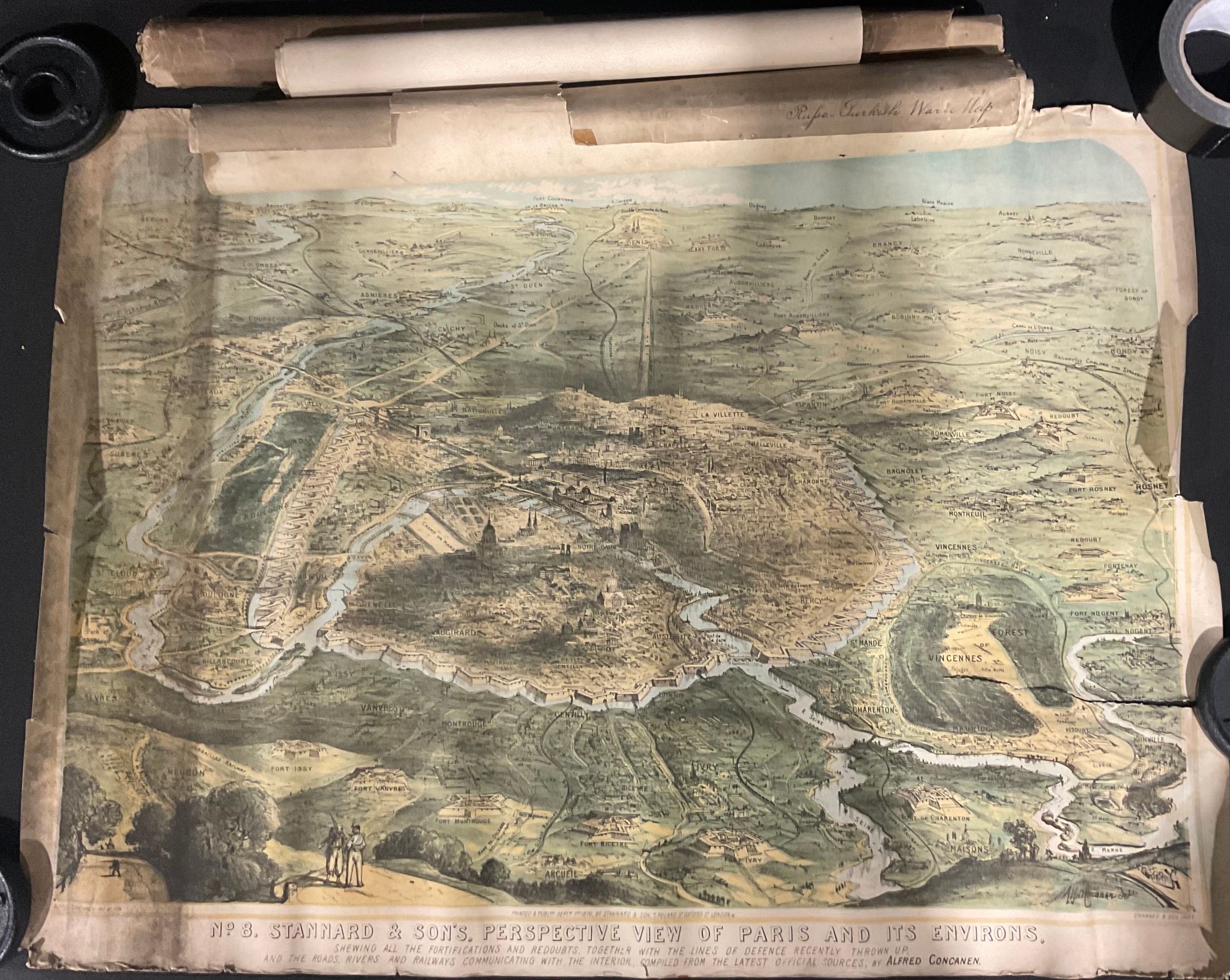 Cartography, historical maps – Stannard’s perspective View of Paris and its Environs, 1870, colour lithographic elevated panorama, engraved Alfred Concanen (1835-1886), illustrating the Franco-Prussian War of 1870 and the subsequent siege of Paris, showing the fortifications, some horizontal tears to east edge; Jankowski’s lithographic map illustrating the course of the Russo-Turkish war of 1877, 52cm wide; Lloyd’s map of Palestine and Syria (tour)19th century, with several traced copies; (qty)