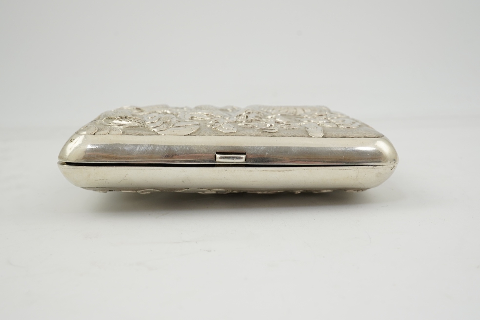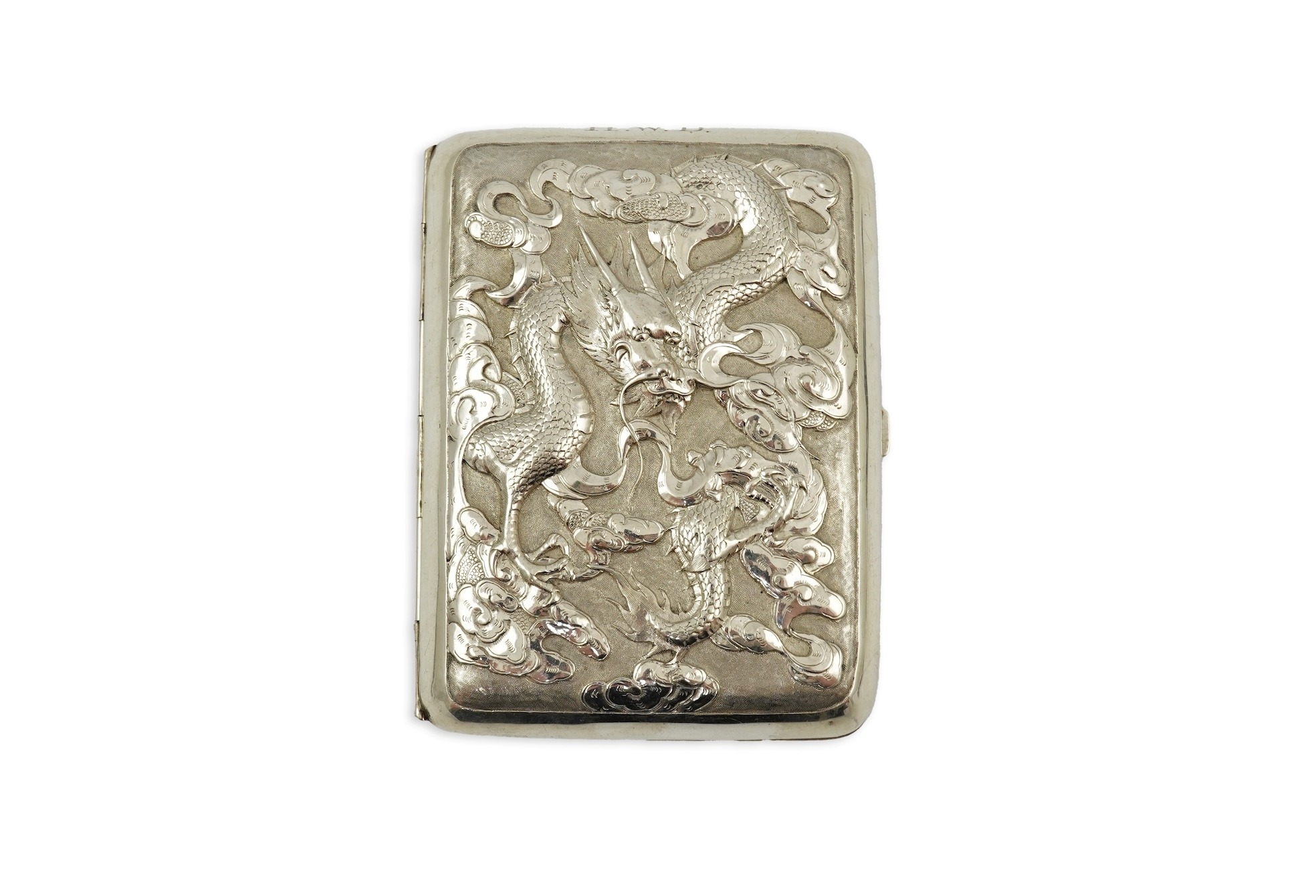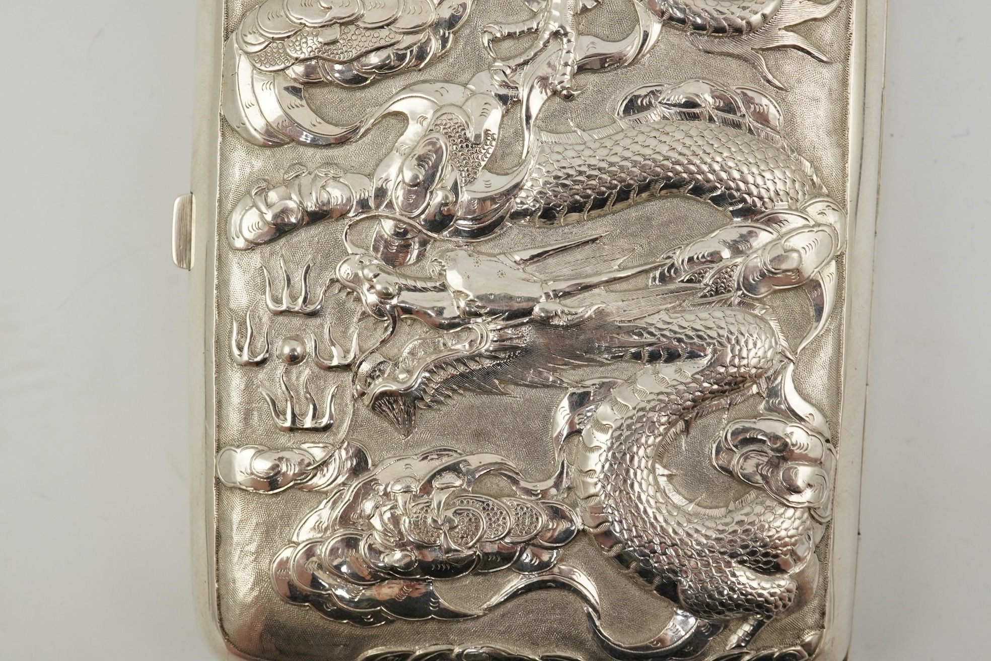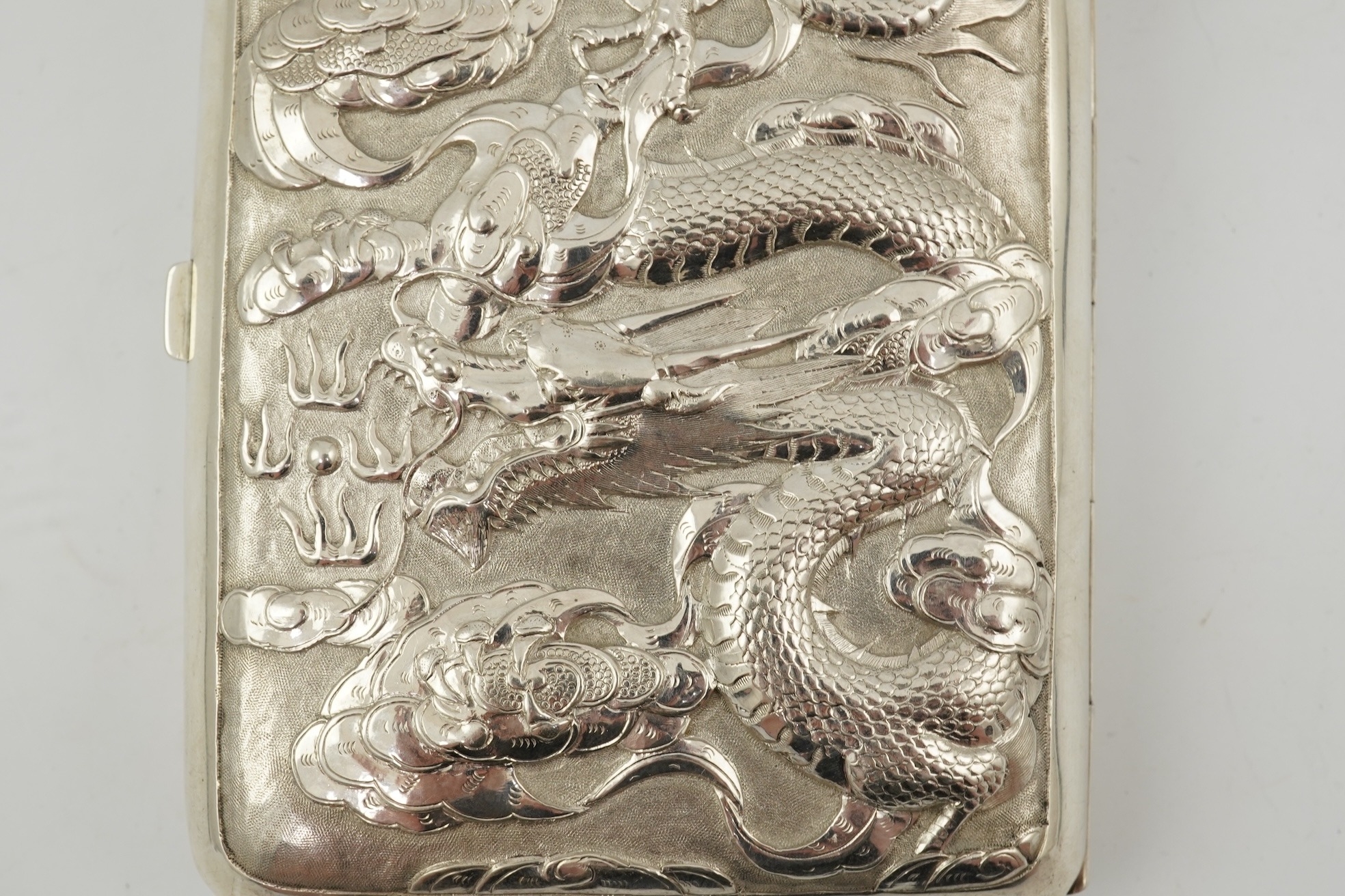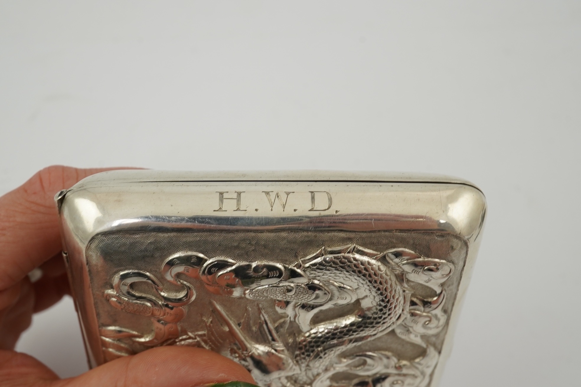 A late 19th/early 20th century Chinese Export silver rectangular cigarette case, with engraved initials and embossed with dragons, on a matt ground, unmarked, 11.6cm, 5.2oz.
