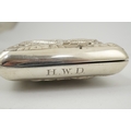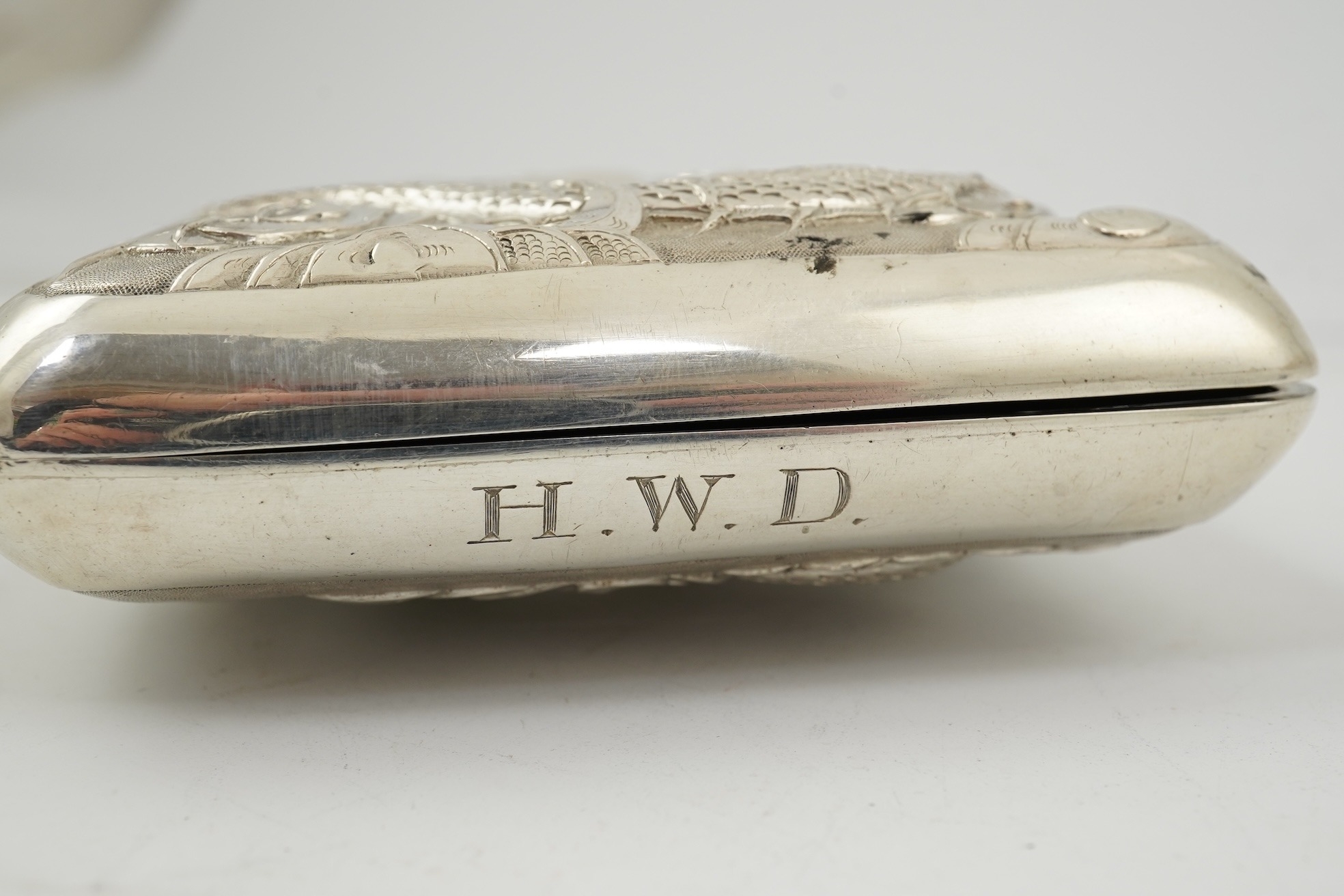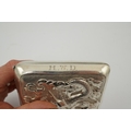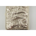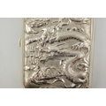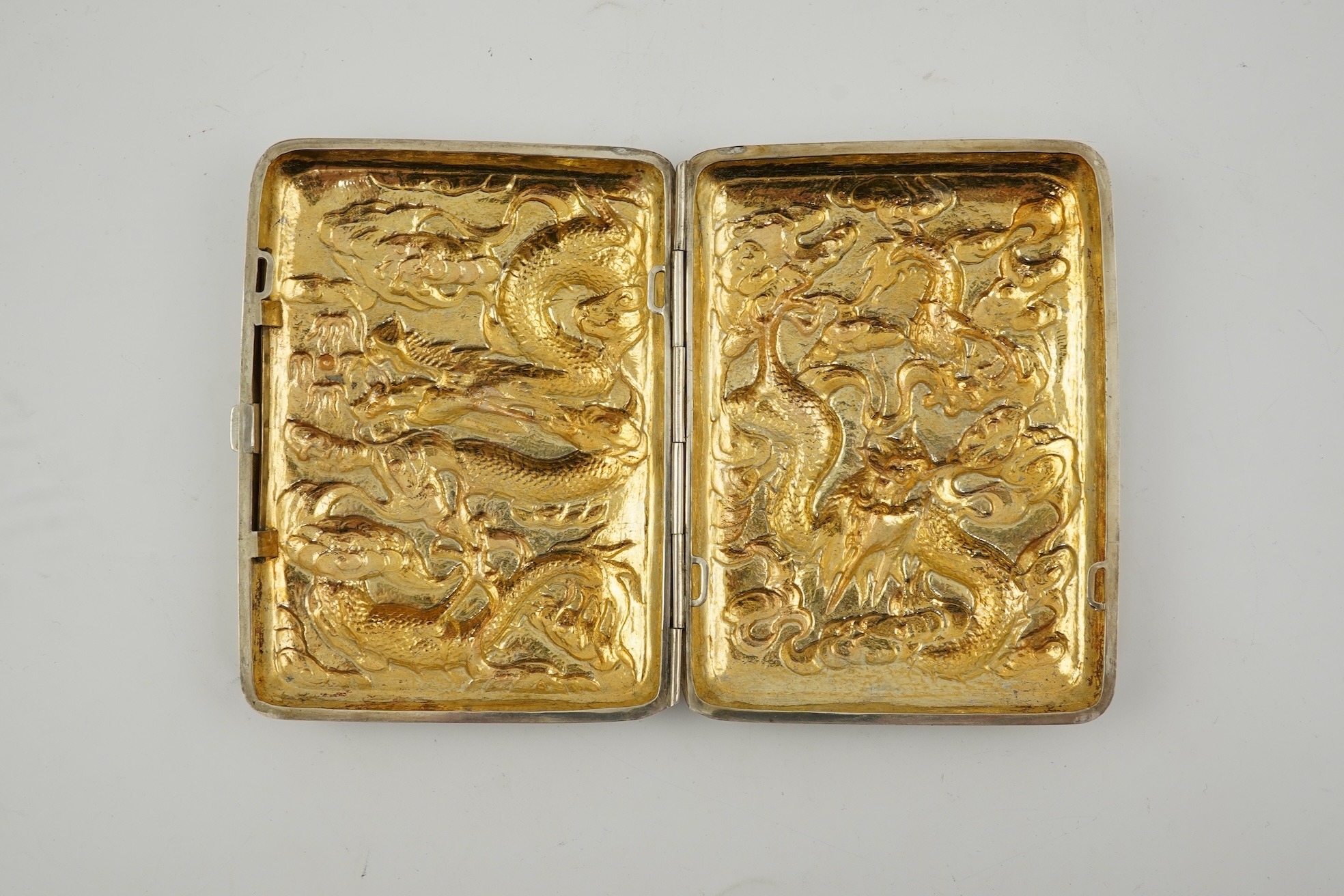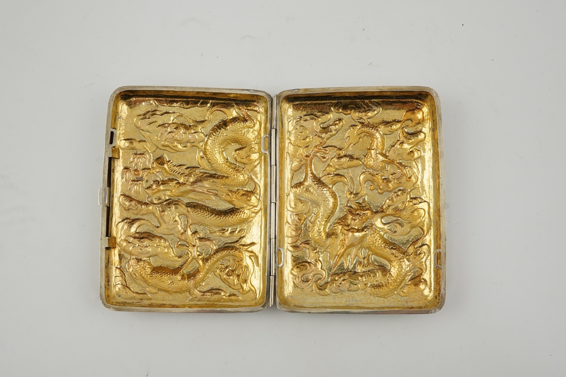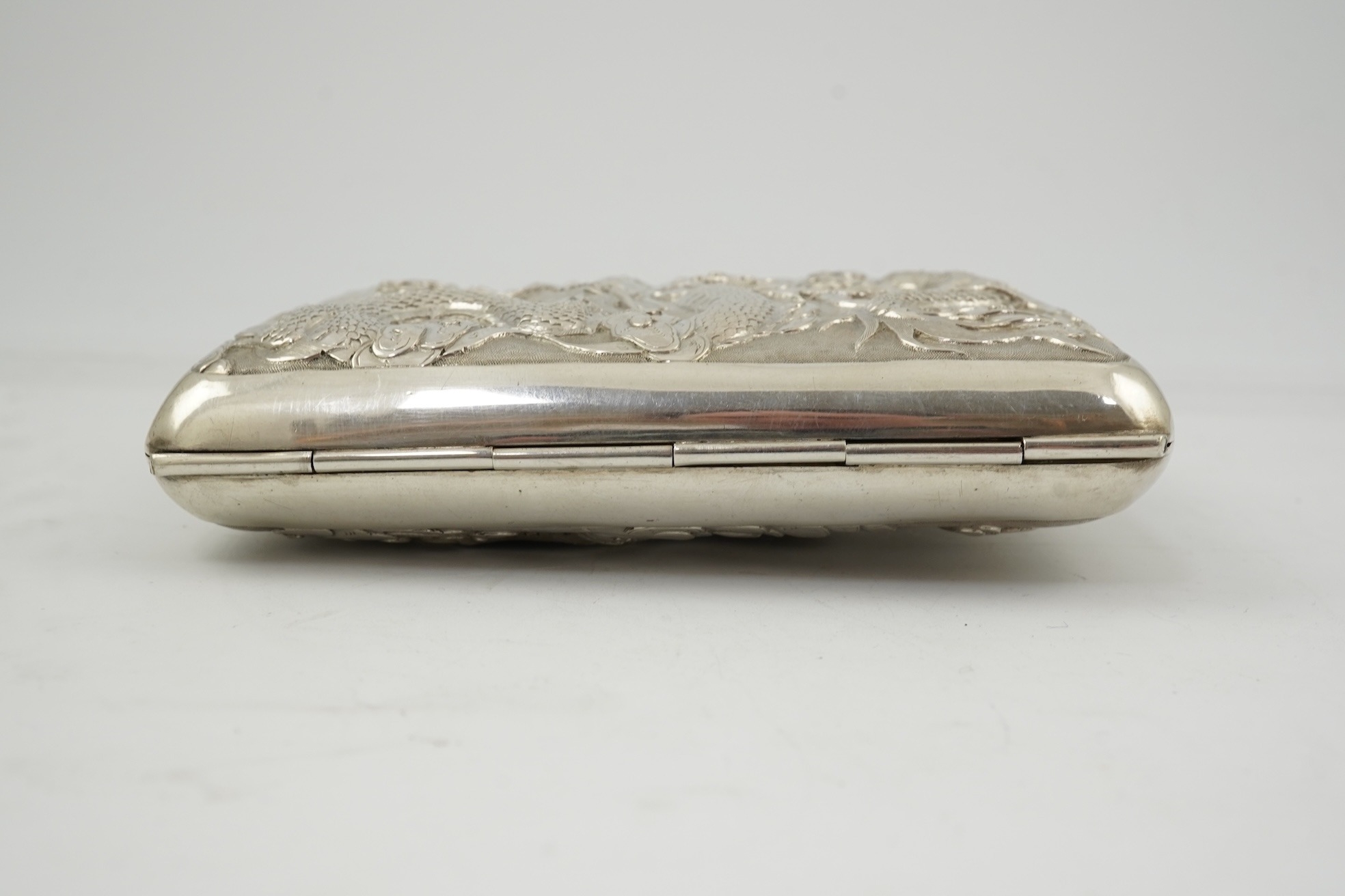 A late 19th/early 20th century Chinese Export silver rectangular cigarette case, with engraved initials and embossed with dragons, on a matt ground, unmarked, 11.6cm, 5.2oz.