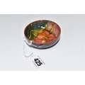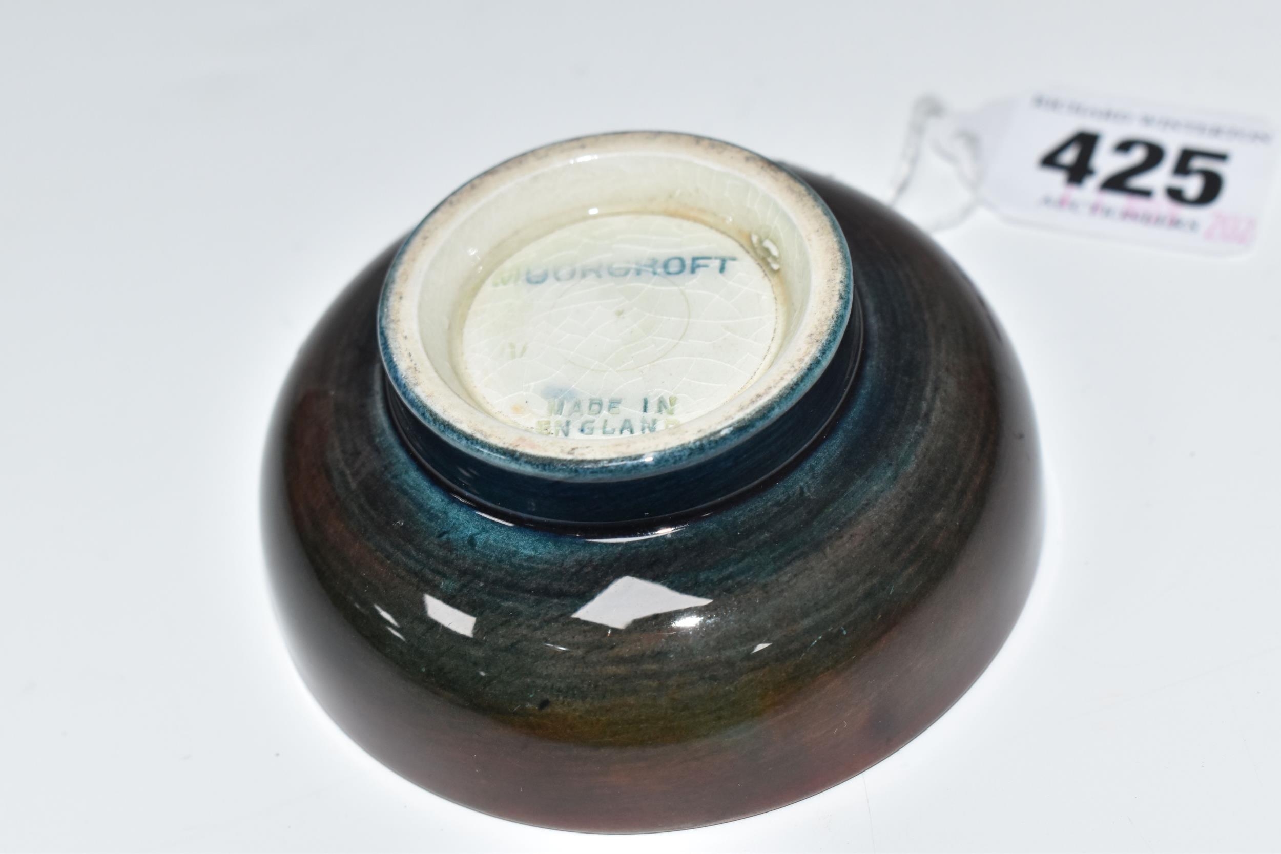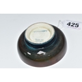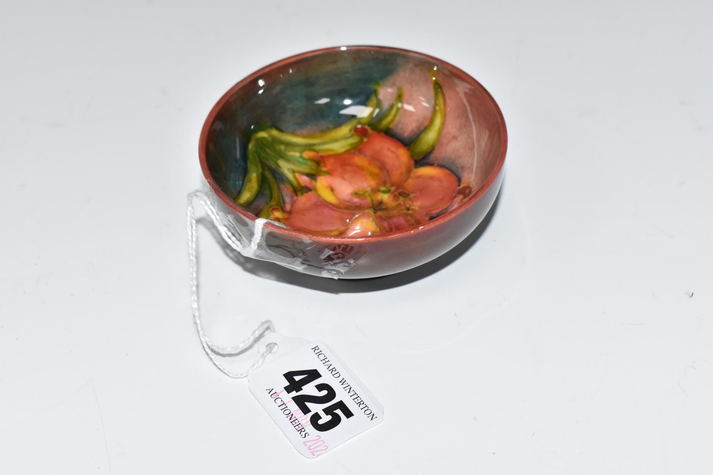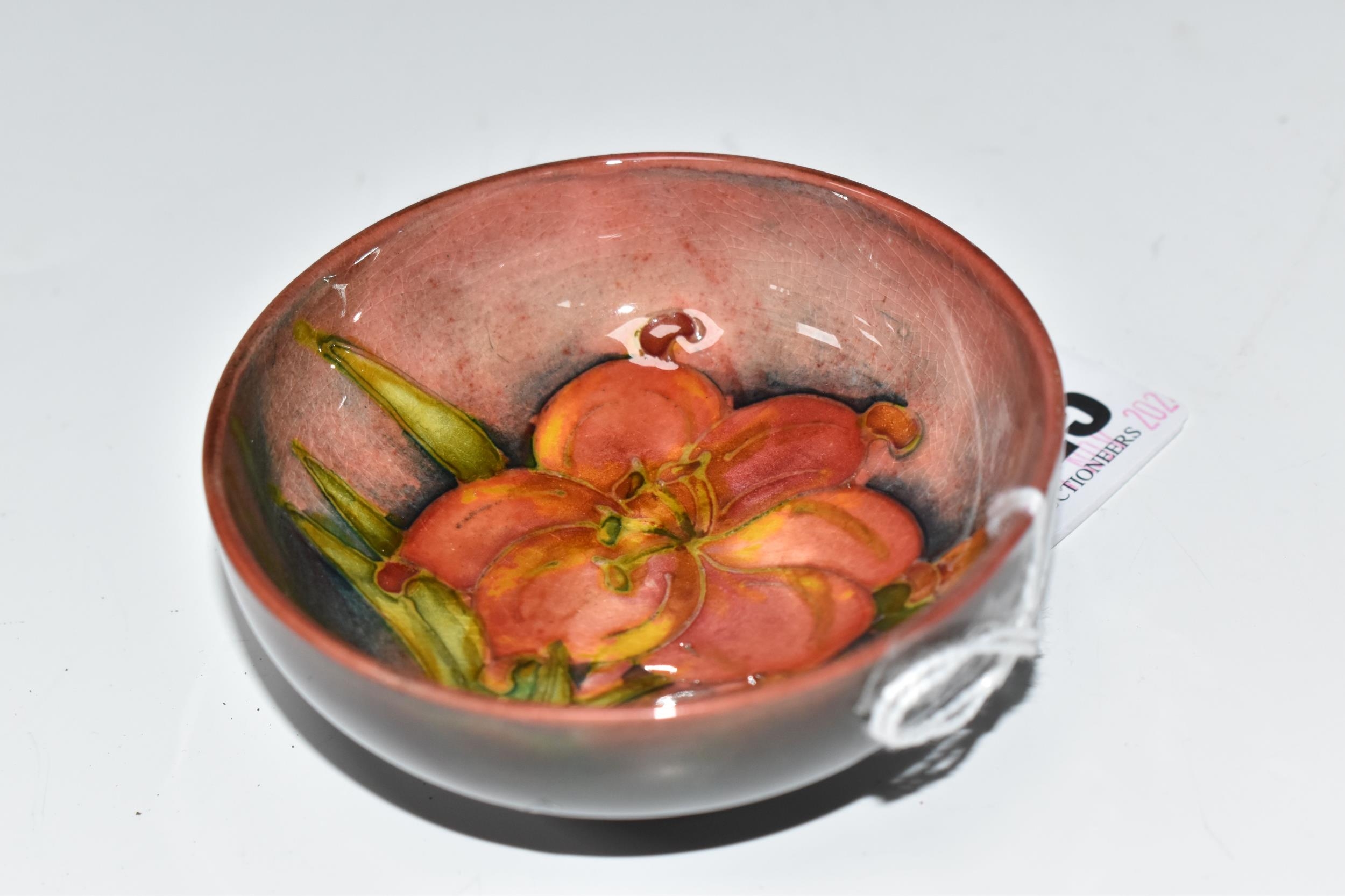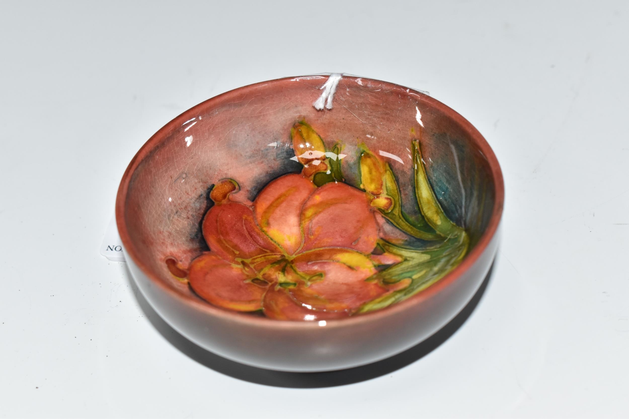 A MOORCROFT POTTERY 'FREESIA' PATTERN FOOTED BOWL, diameter 8cm, a coral and yellow freesia on a mottled blue and coral ground, blue printed marks to the base (1) (Condition Report: crazing throughout, a few nibbles along the rim)