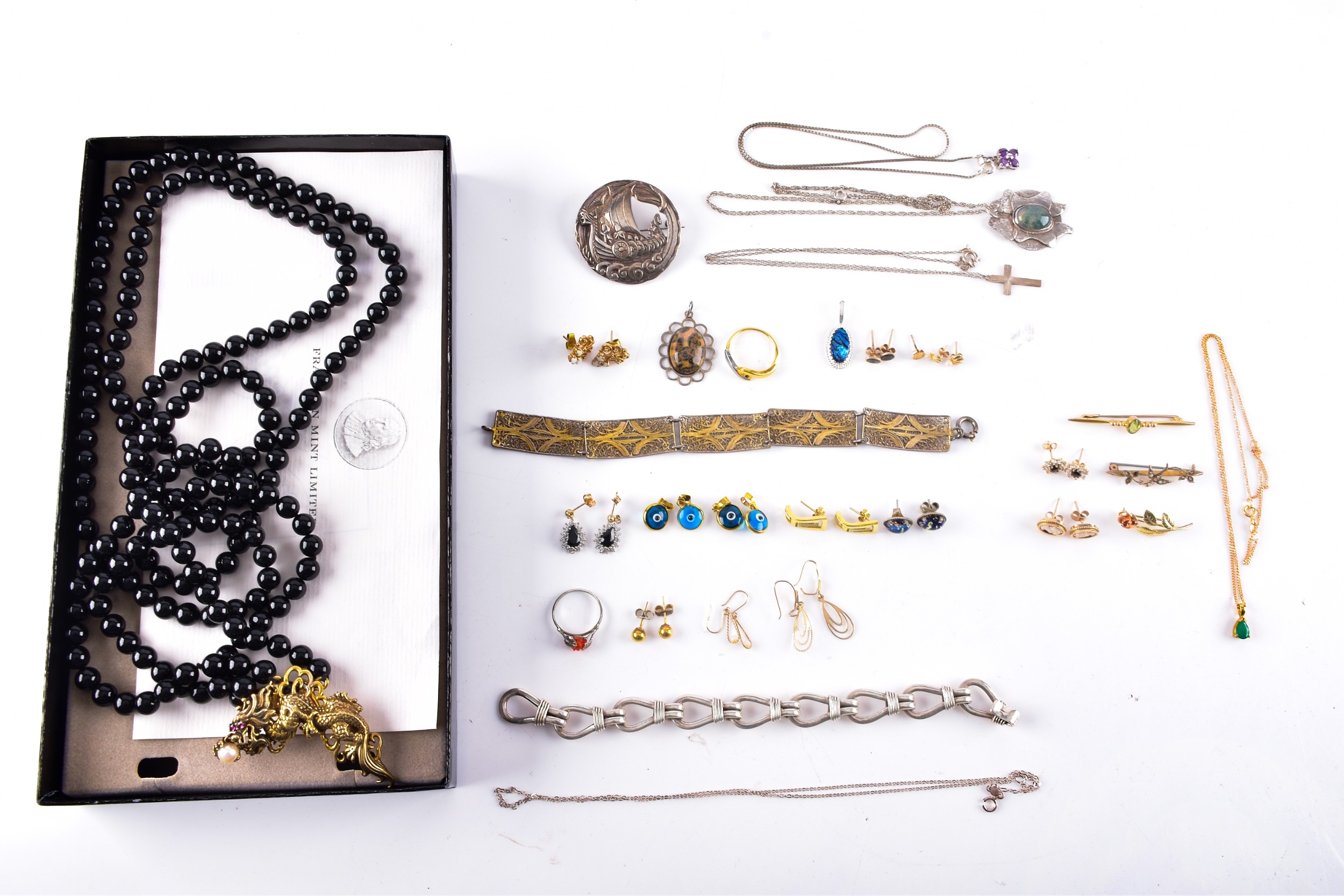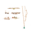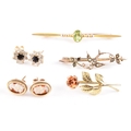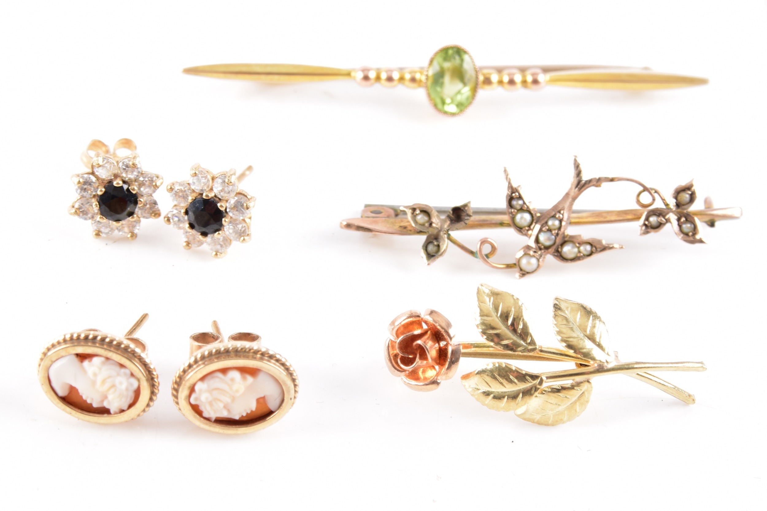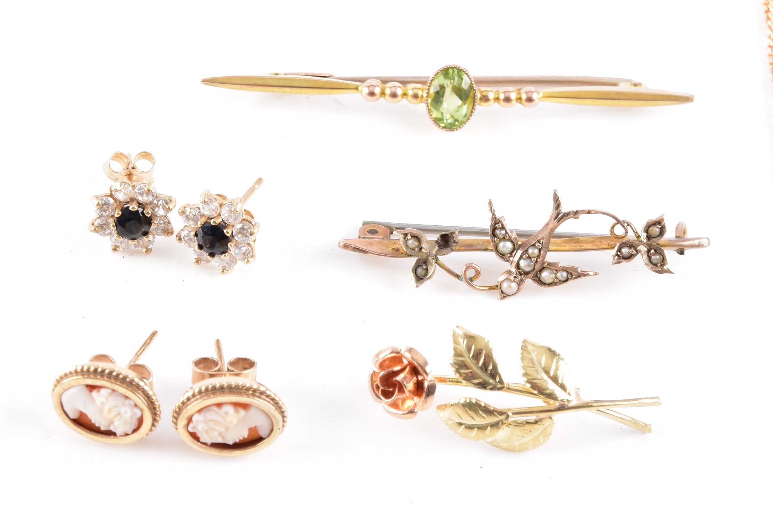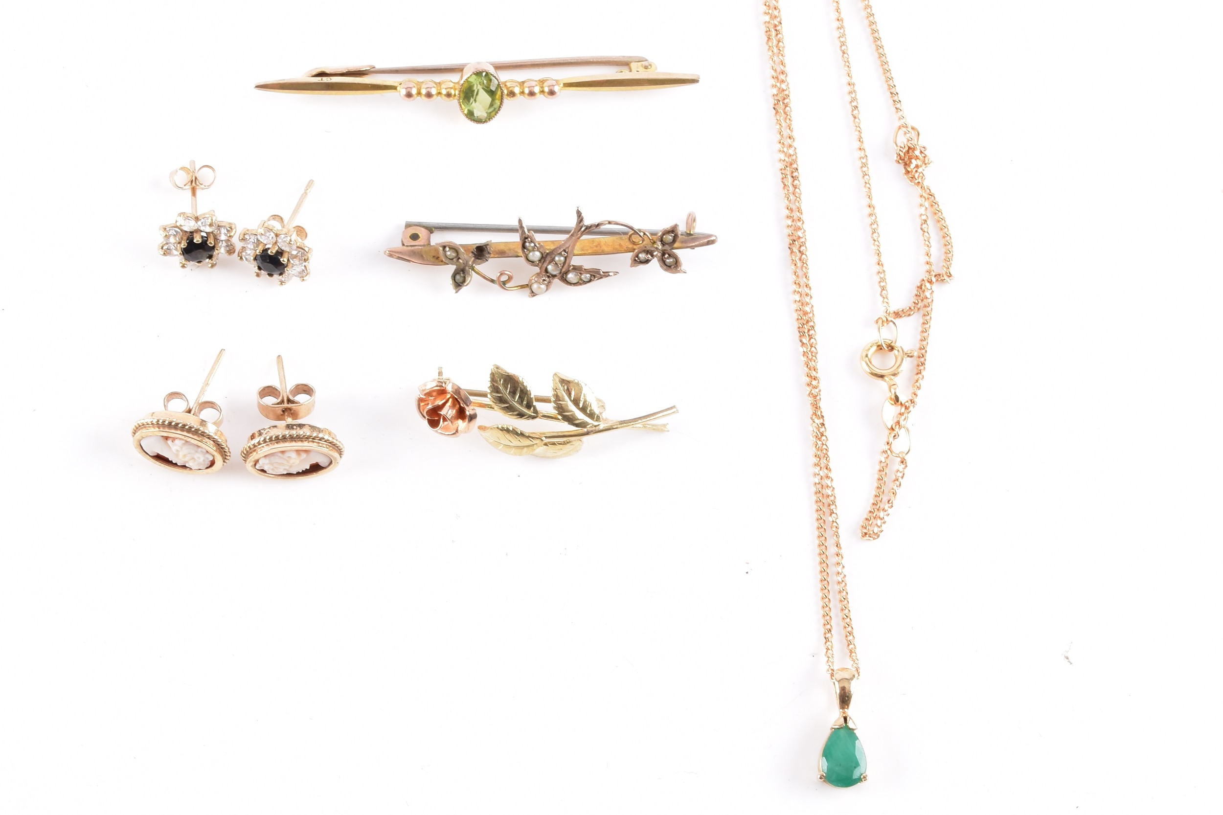 A collection of jewellery, including a Unoaerre 9ct yellow gold chain suspended with a green stone pear shape pendant, a pair of 9ct yellow gold cameo stud earrings, a 9ct yellow and rose gold rose brooch, a pair of 9ct sapphire and paste floral studs, a 9ct yellow gold seed pearl swallow brooch (with base metal pin), a yellow gold peridot bar brooch, together with a collection on unmarked gold earrings, a group of silver jewellery, and a Franklin Mint black onyx beaded necklace with dragon clasp.