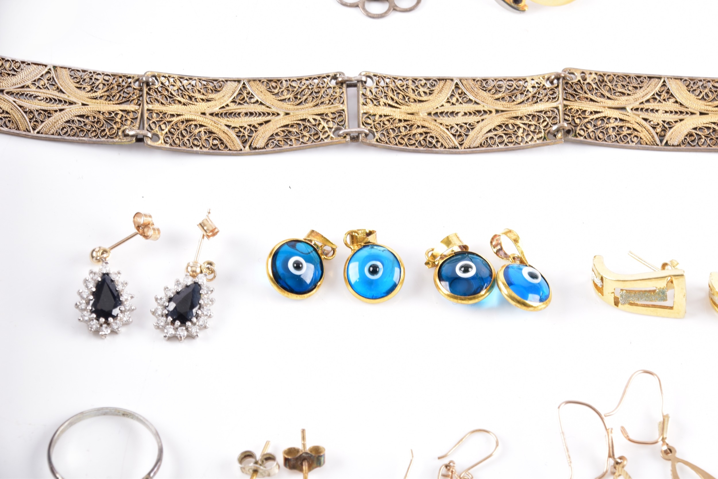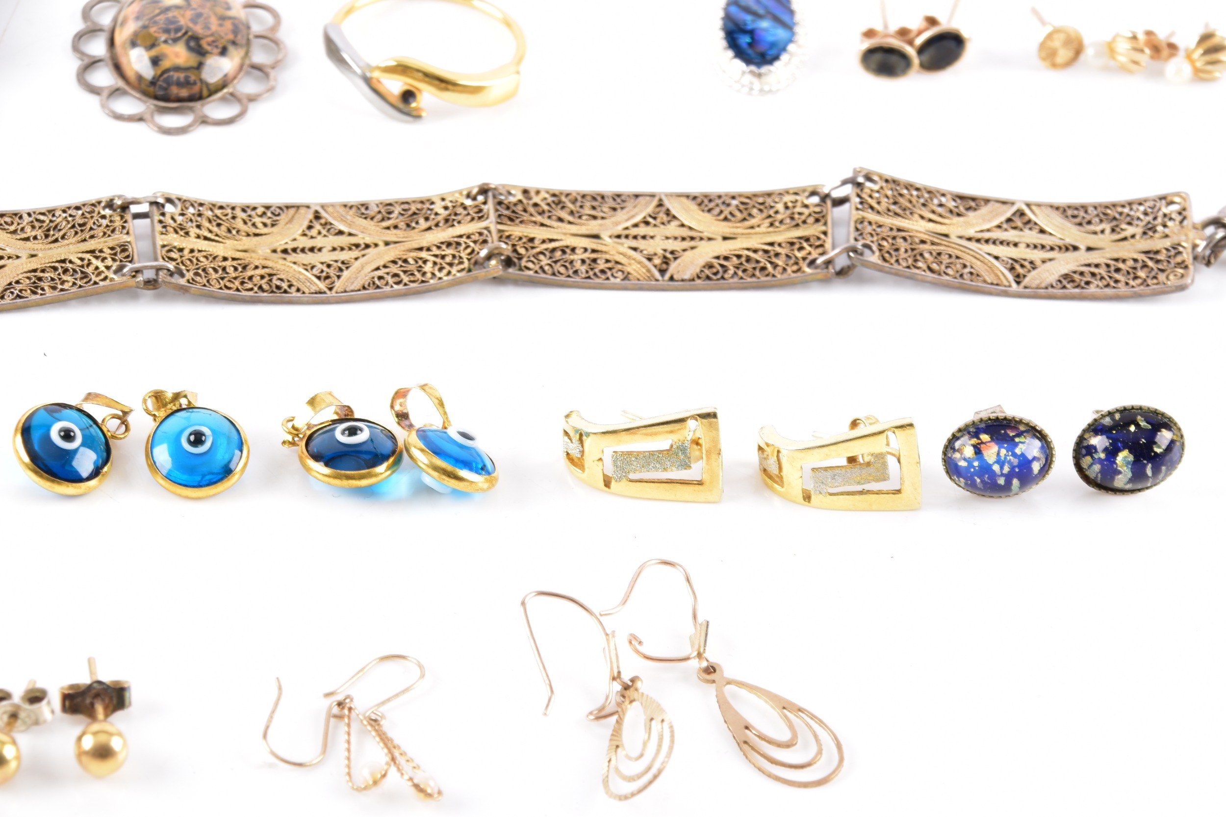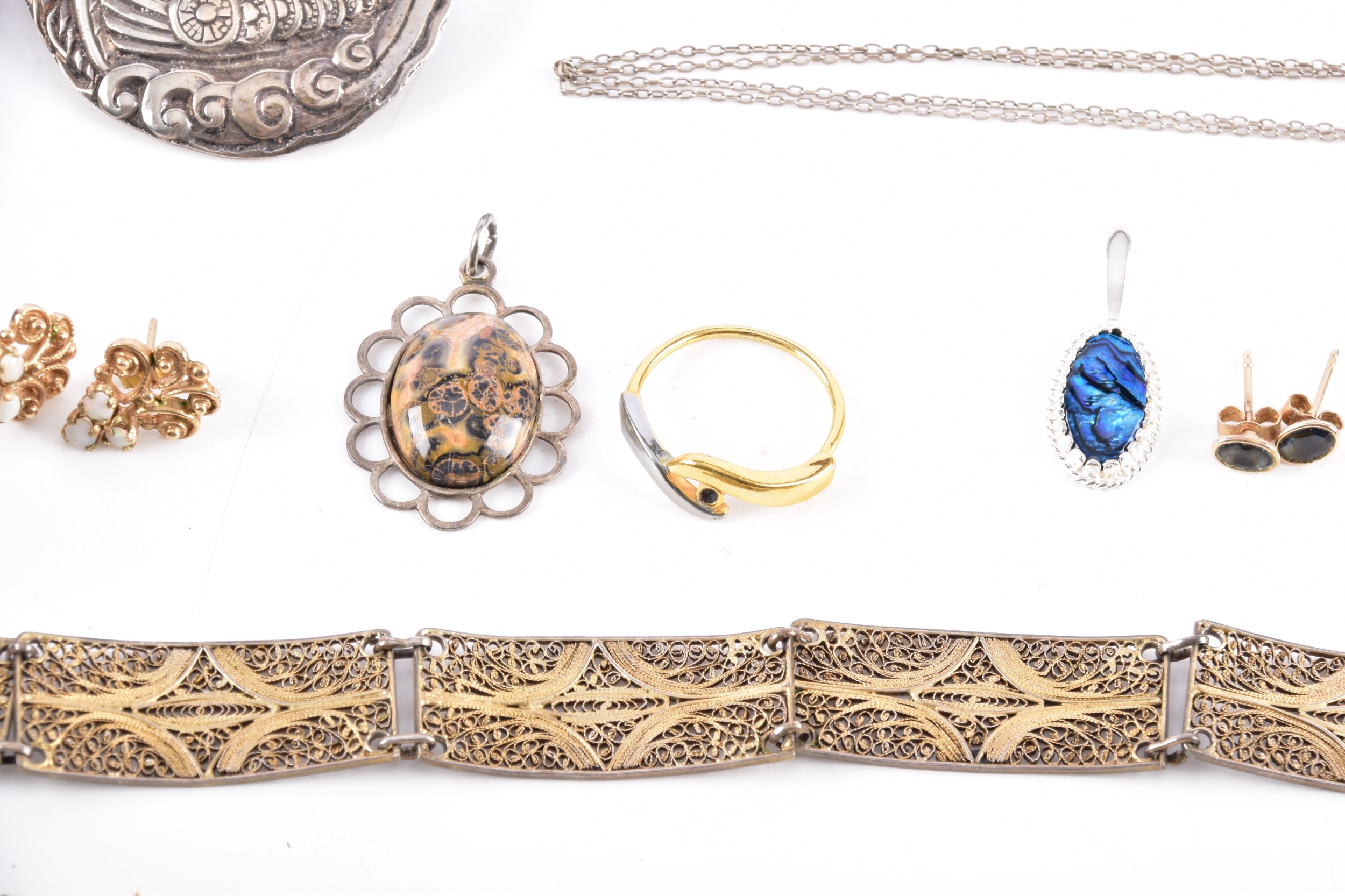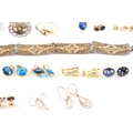 A collection of jewellery, including a Unoaerre 9ct yellow gold chain suspended with a green stone pear shape pendant, a pair of 9ct yellow gold cameo stud earrings, a 9ct yellow and rose gold rose brooch, a pair of 9ct sapphire and paste floral studs, a 9ct yellow gold seed pearl swallow brooch (with base metal pin), a yellow gold peridot bar brooch, together with a collection on unmarked gold earrings, a group of silver jewellery, and a Franklin Mint black onyx beaded necklace with dragon clasp.