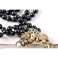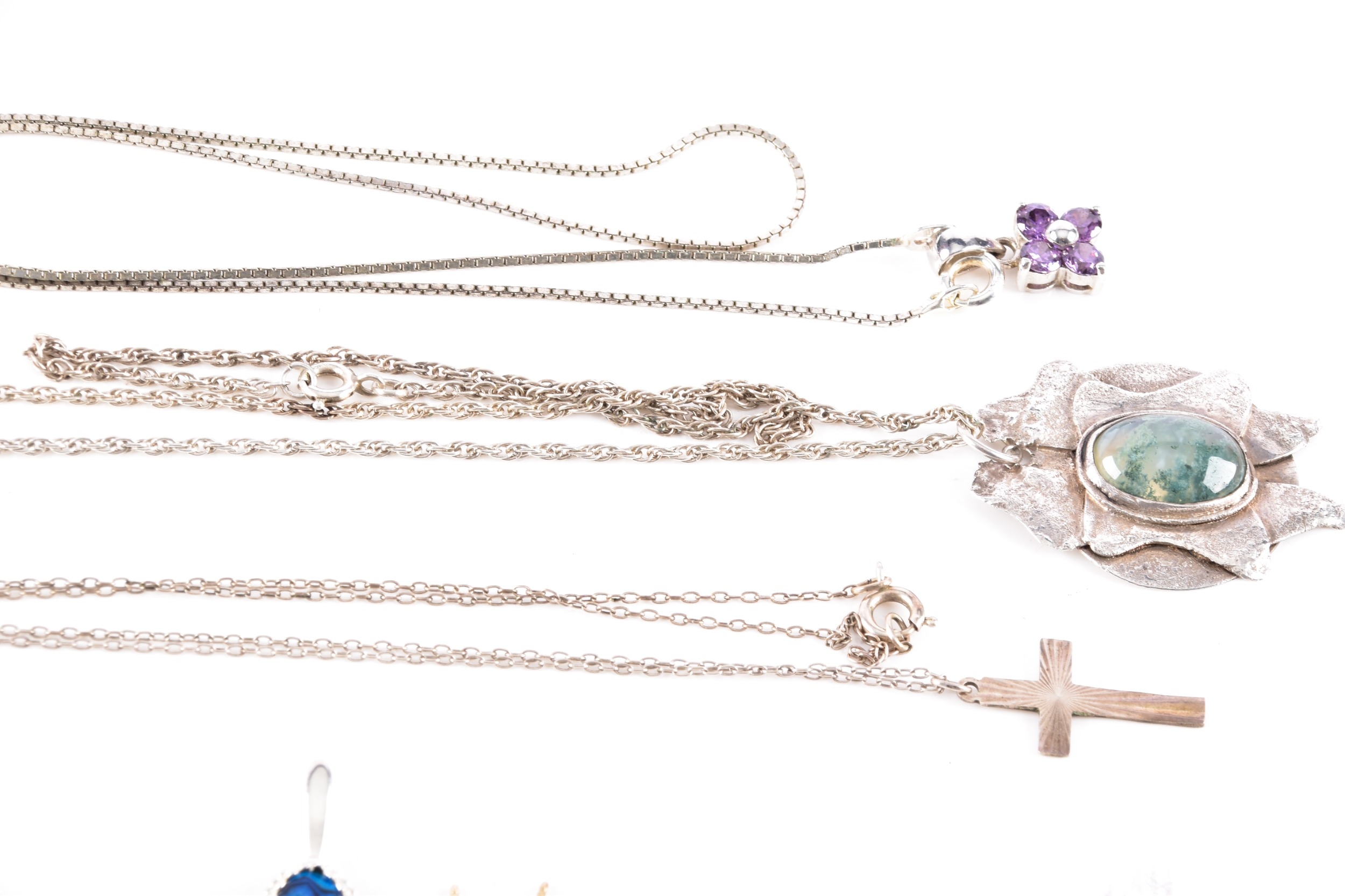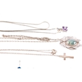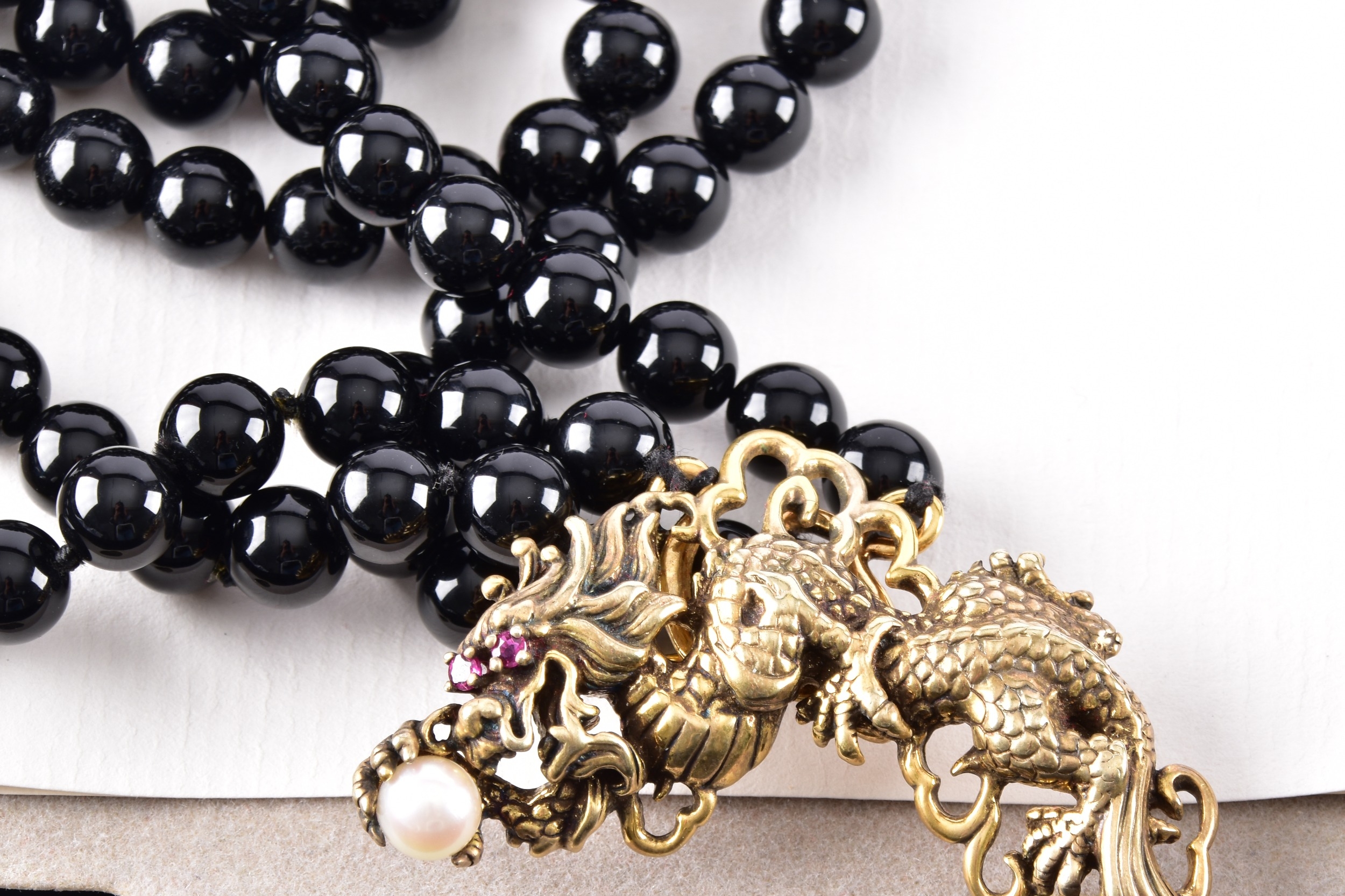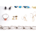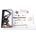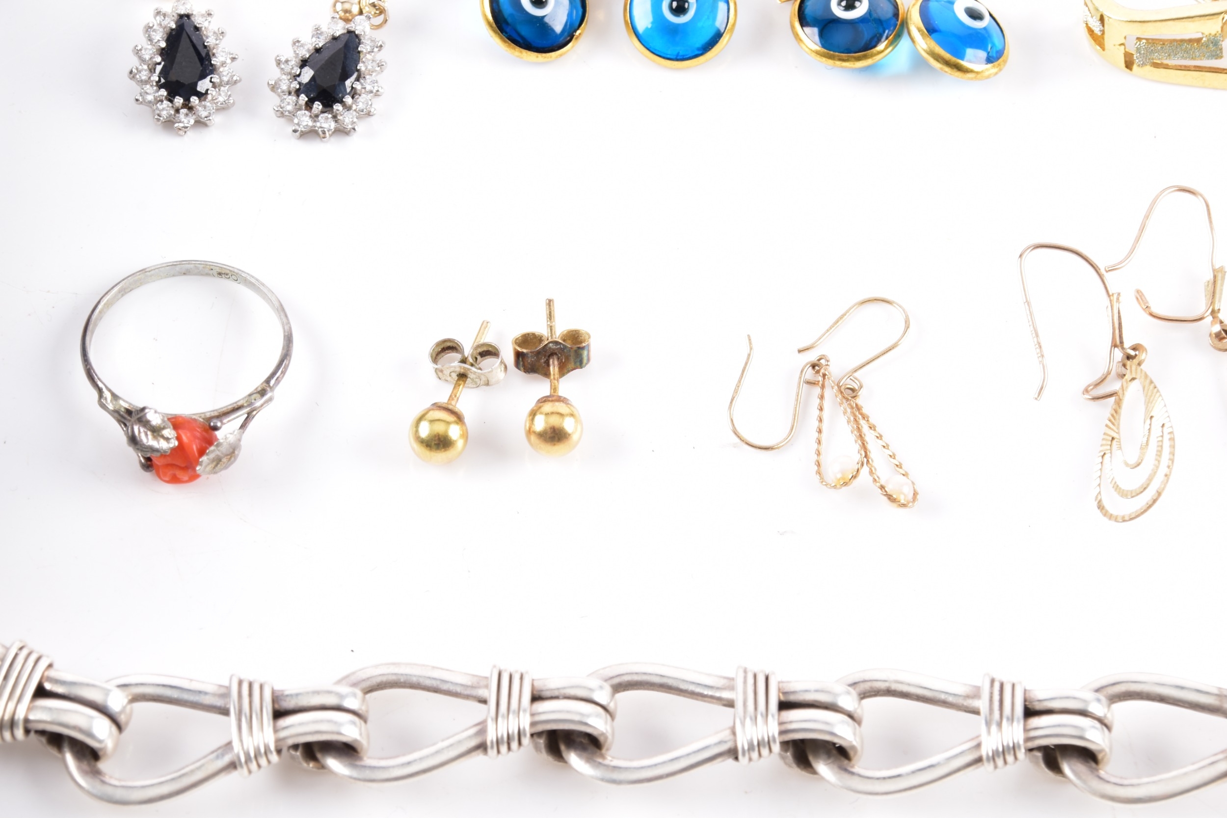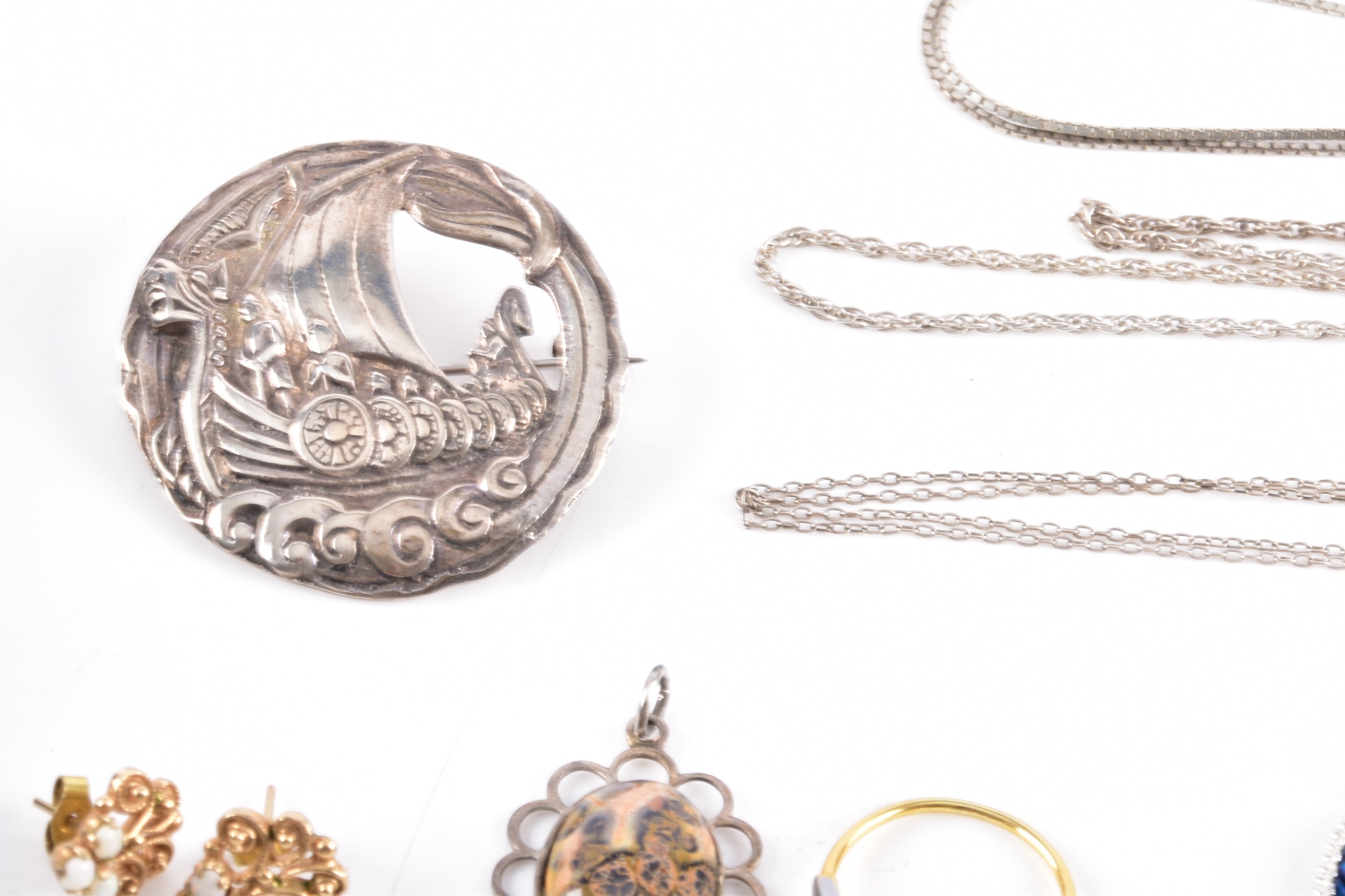 A collection of jewellery, including a Unoaerre 9ct yellow gold chain suspended with a green stone pear shape pendant, a pair of 9ct yellow gold cameo stud earrings, a 9ct yellow and rose gold rose brooch, a pair of 9ct sapphire and paste floral studs, a 9ct yellow gold seed pearl swallow brooch (with base metal pin), a yellow gold peridot bar brooch, together with a collection on unmarked gold earrings, a group of silver jewellery, and a Franklin Mint black onyx beaded necklace with dragon clasp.