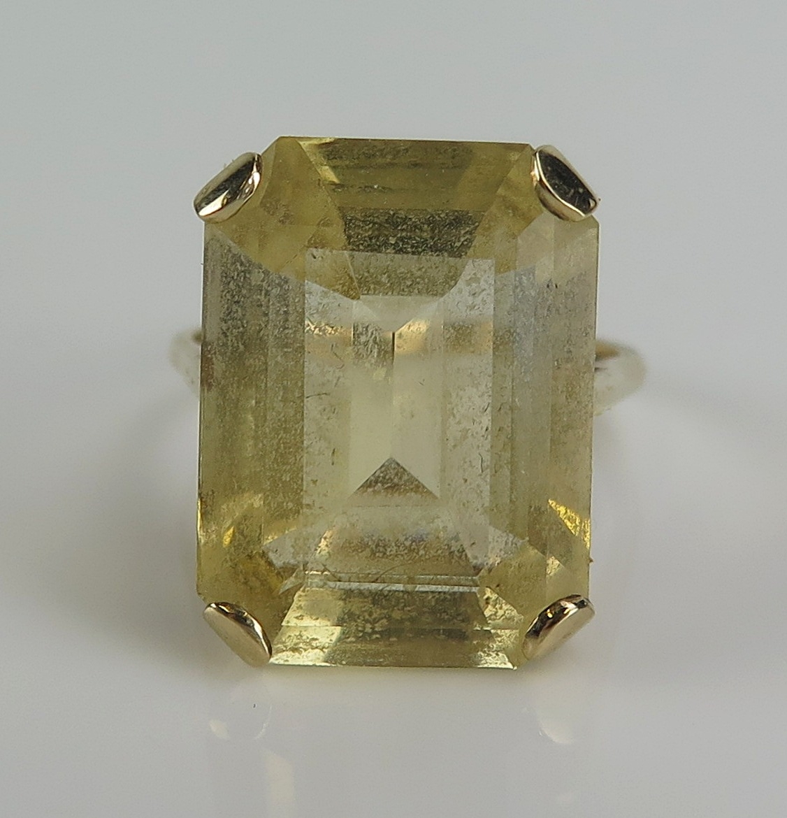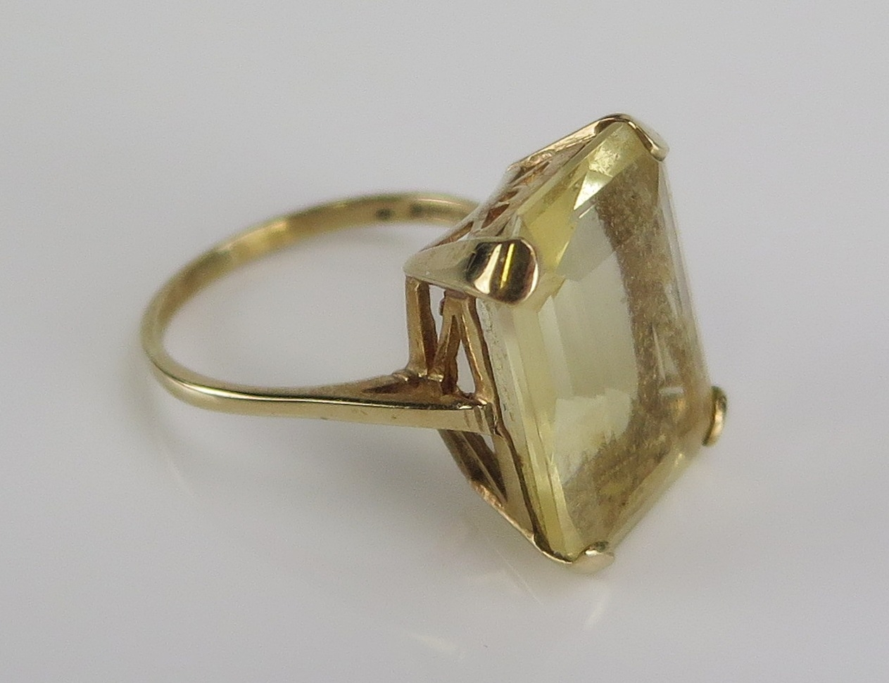 A citrine ring in a 9ct yellow gold setting, 20x15mm stone, size S, hallmarked, 6.7g. Boxed