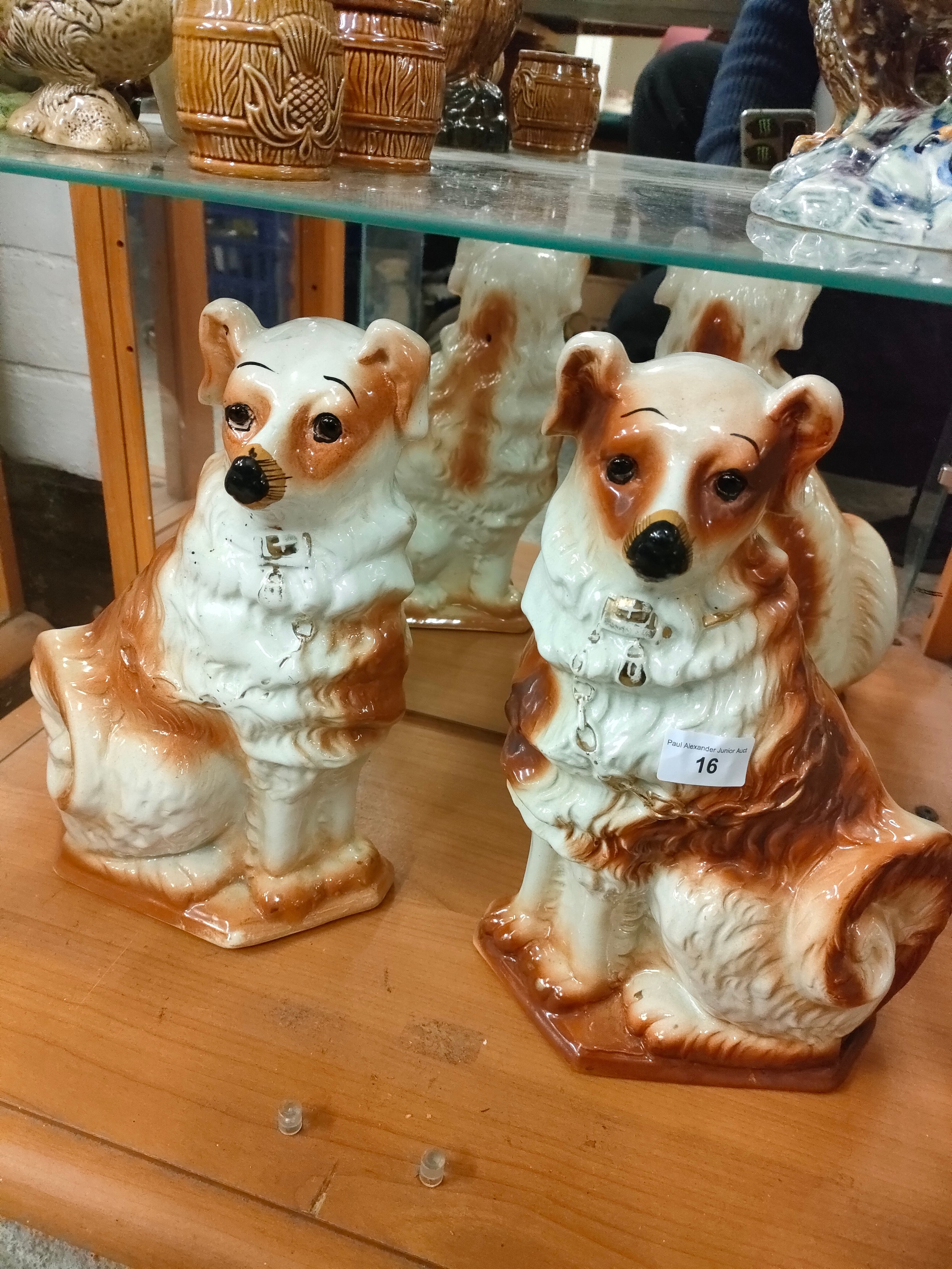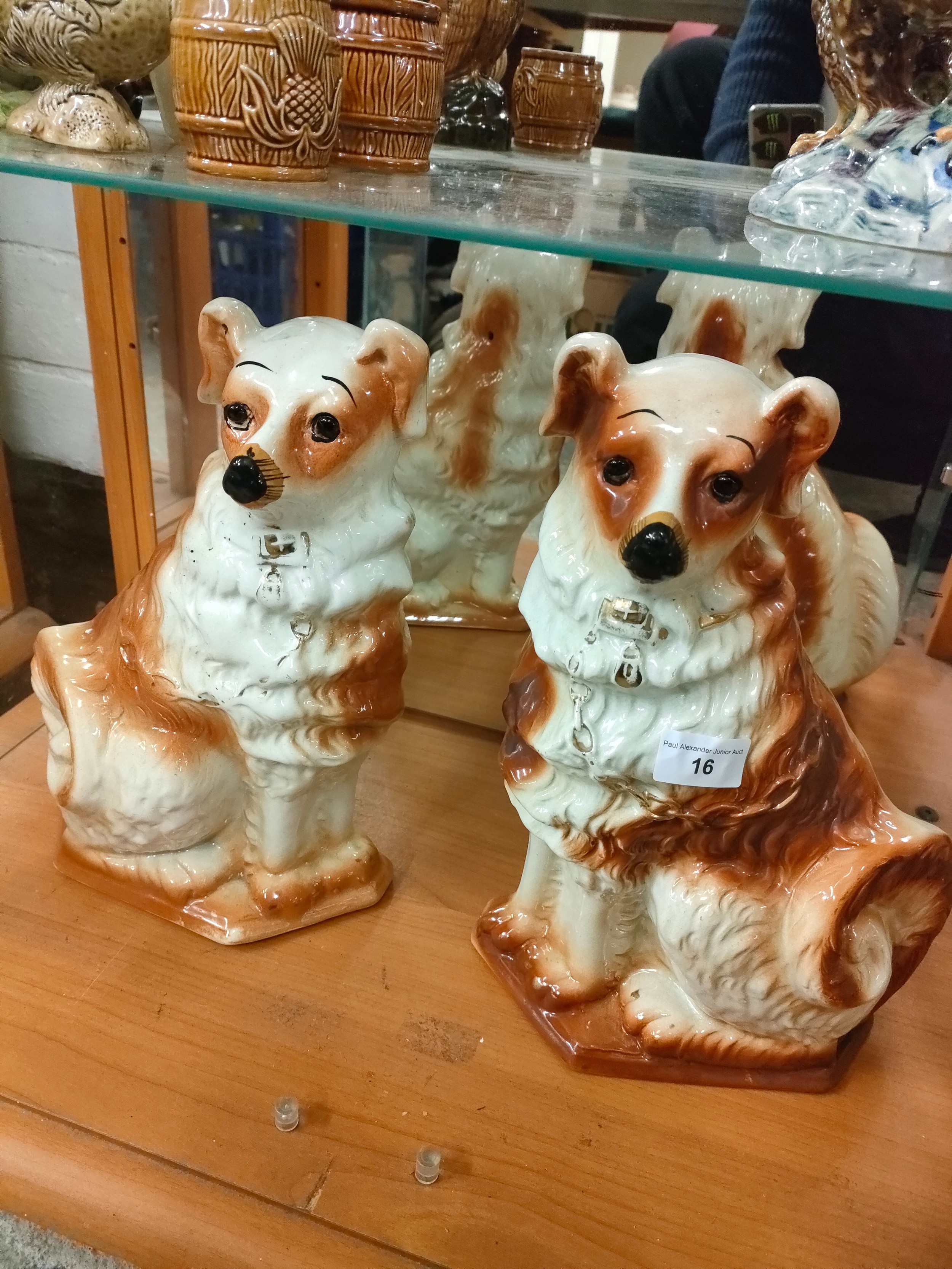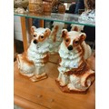 Pair of large boness pottery dog figures with glass eyes .