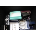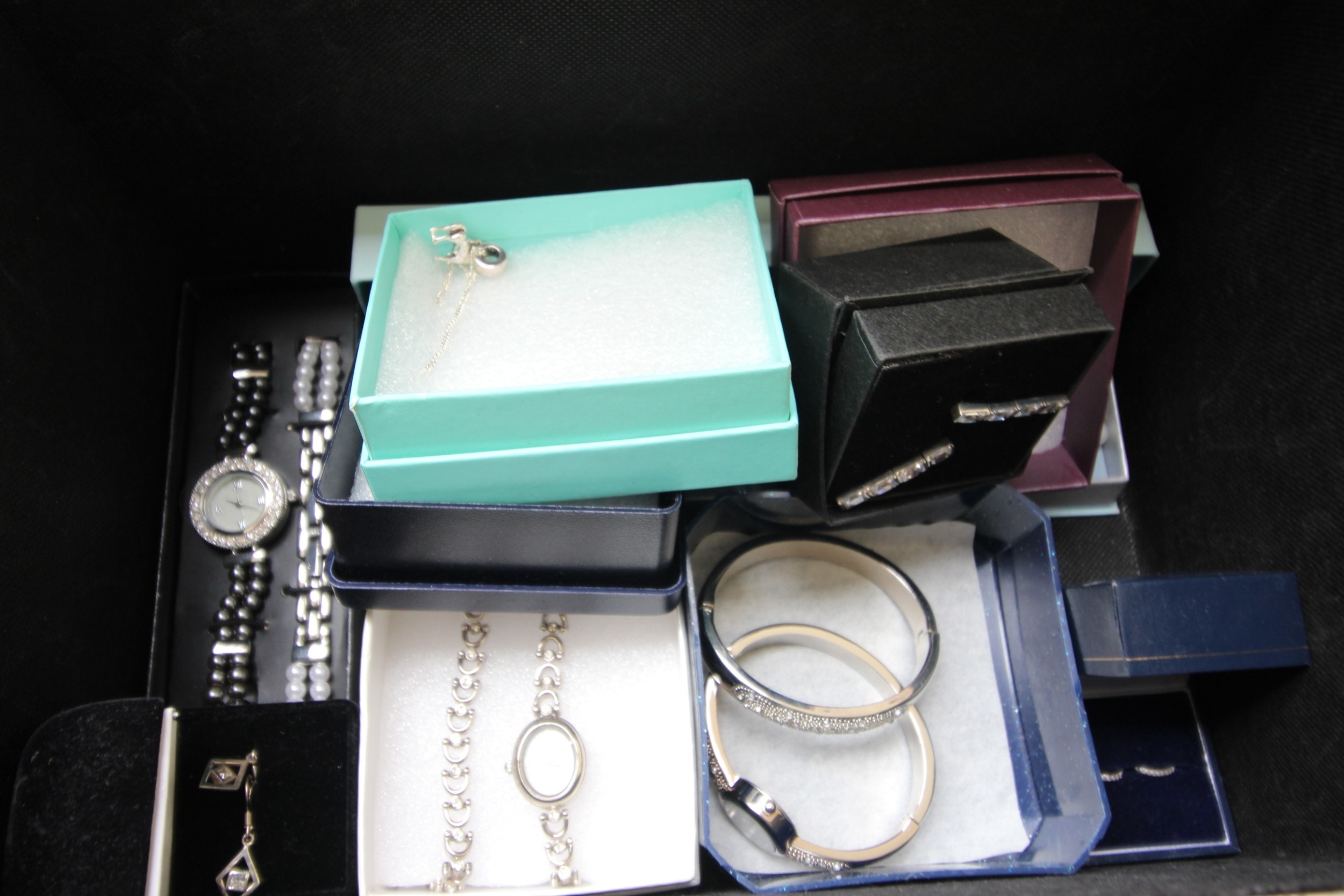 Ladies display casket containing arrangement of modern jewelry, bangles, necklaces, watches etc