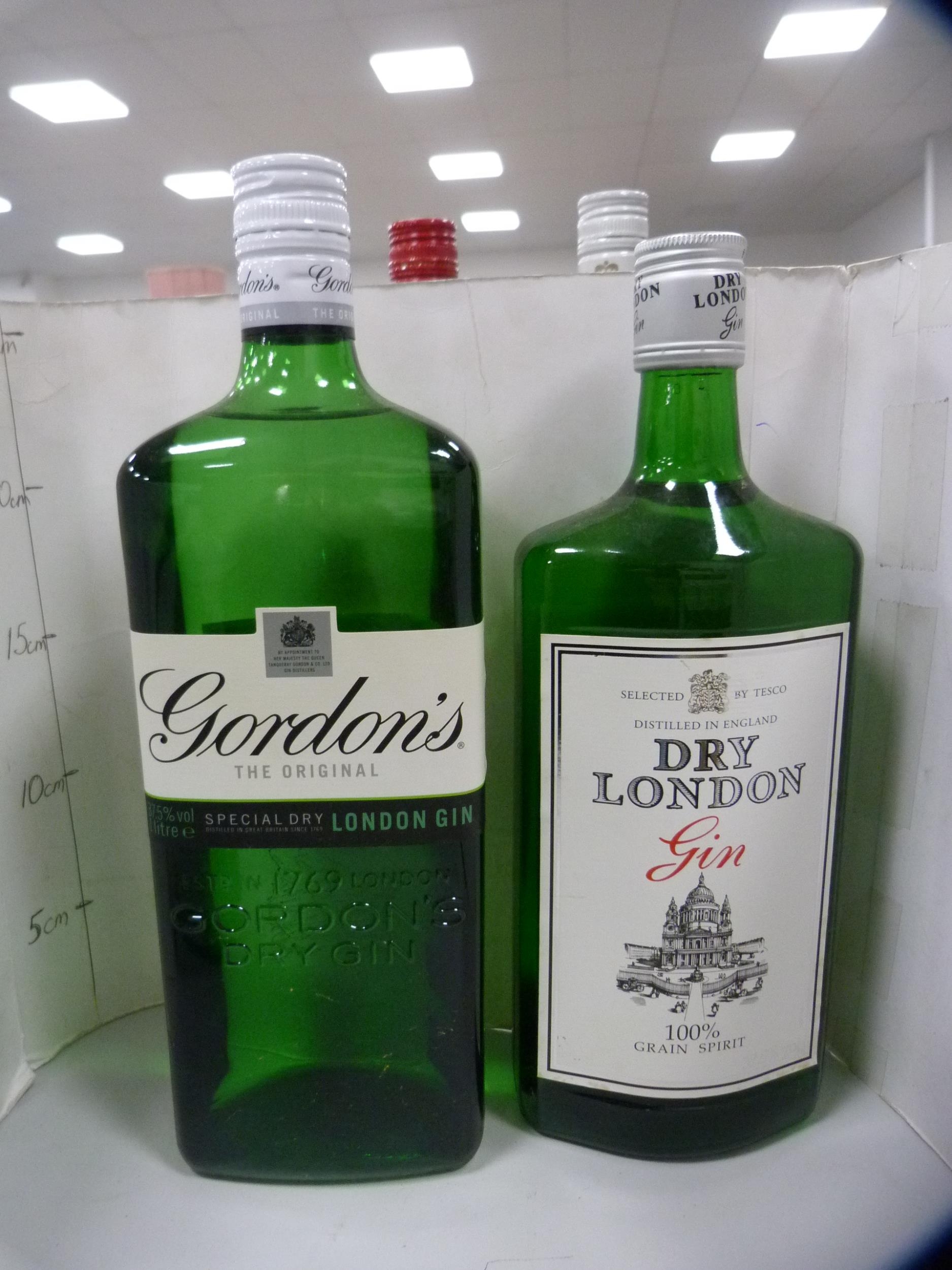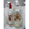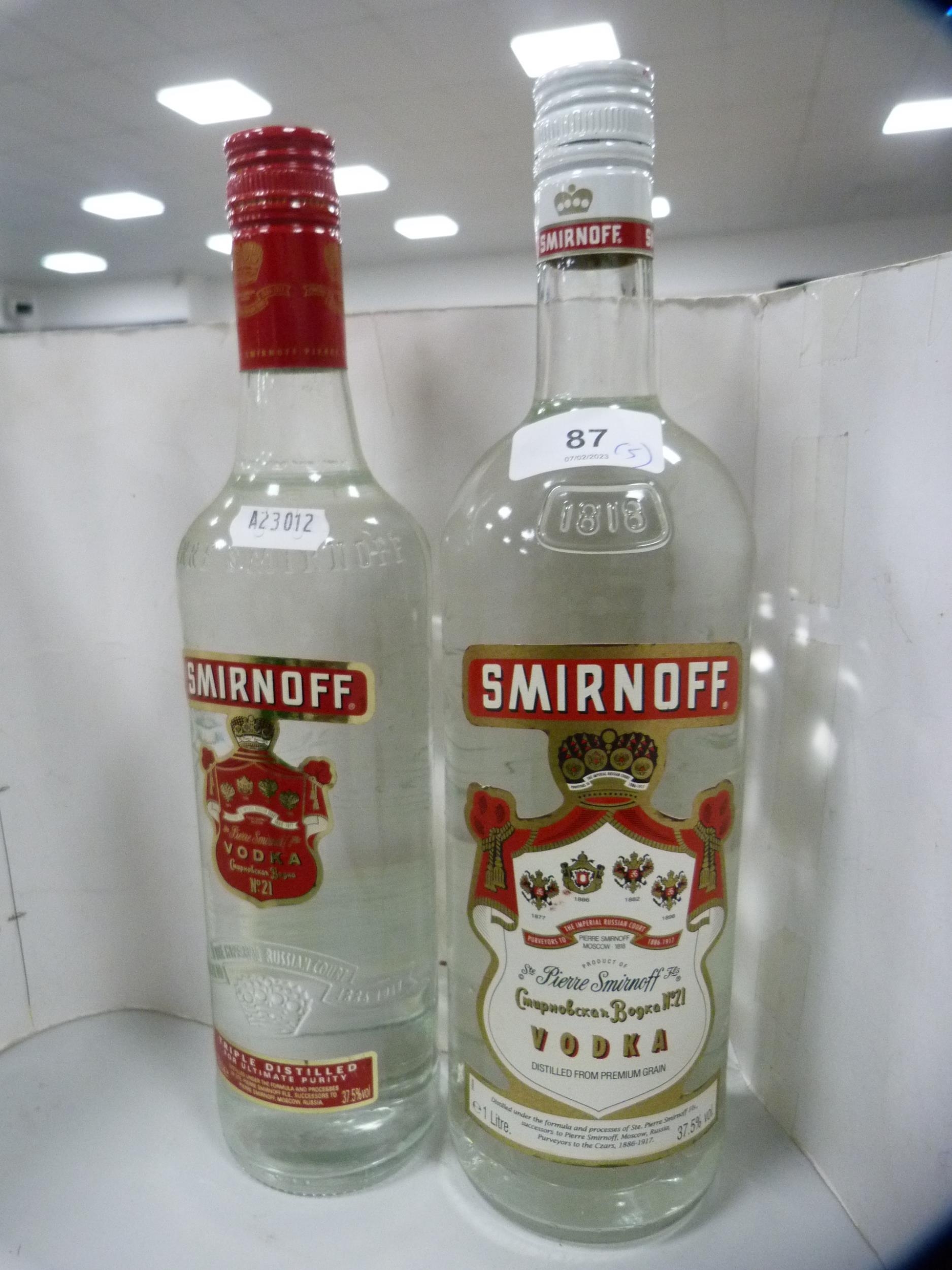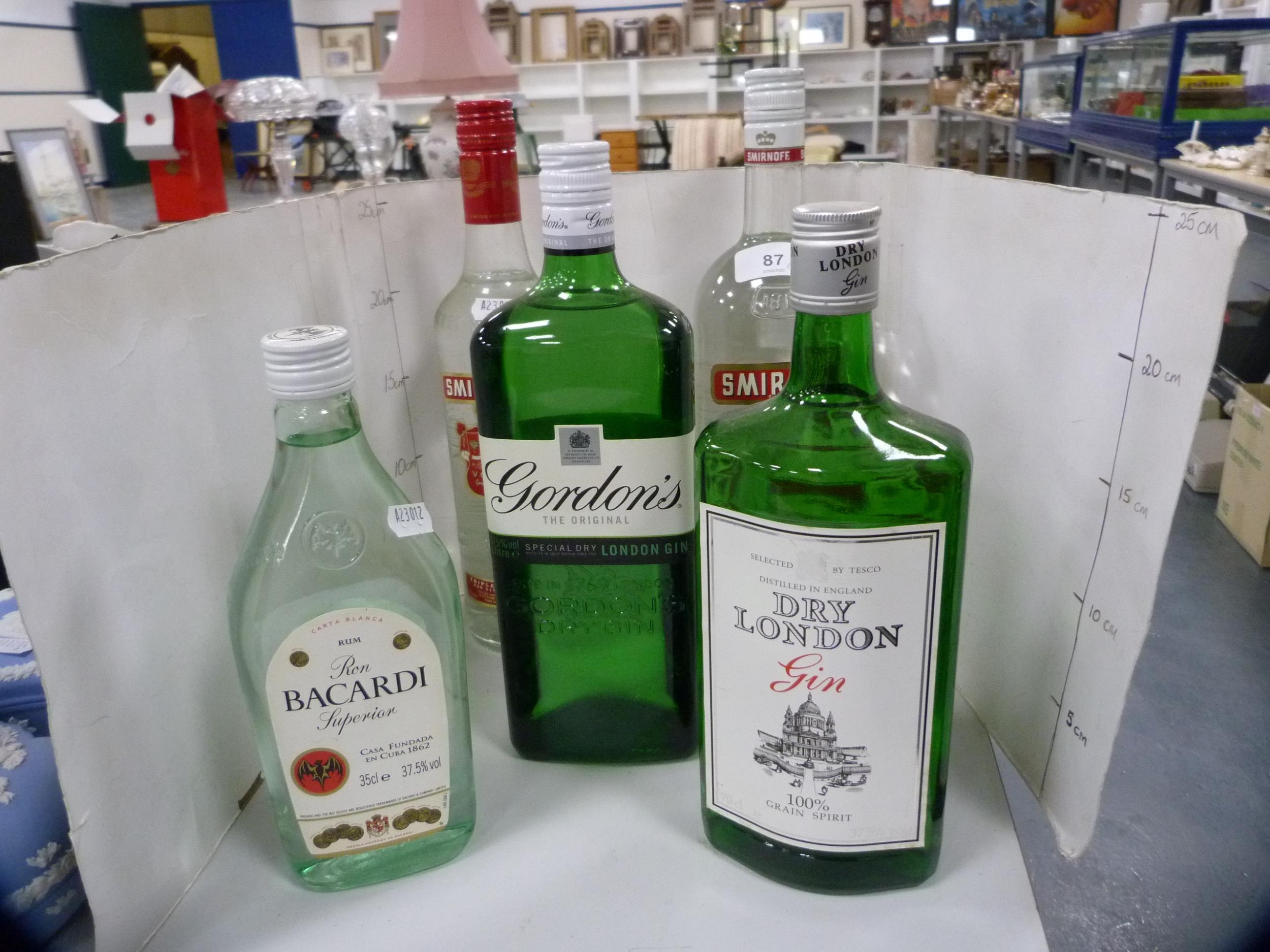 Smirnoff Vodka, 70cl and 1 litre, Gordon's Gin, 1 litre, London Dry Gin, 70cl, and a half bottle of Bacardi. (5)