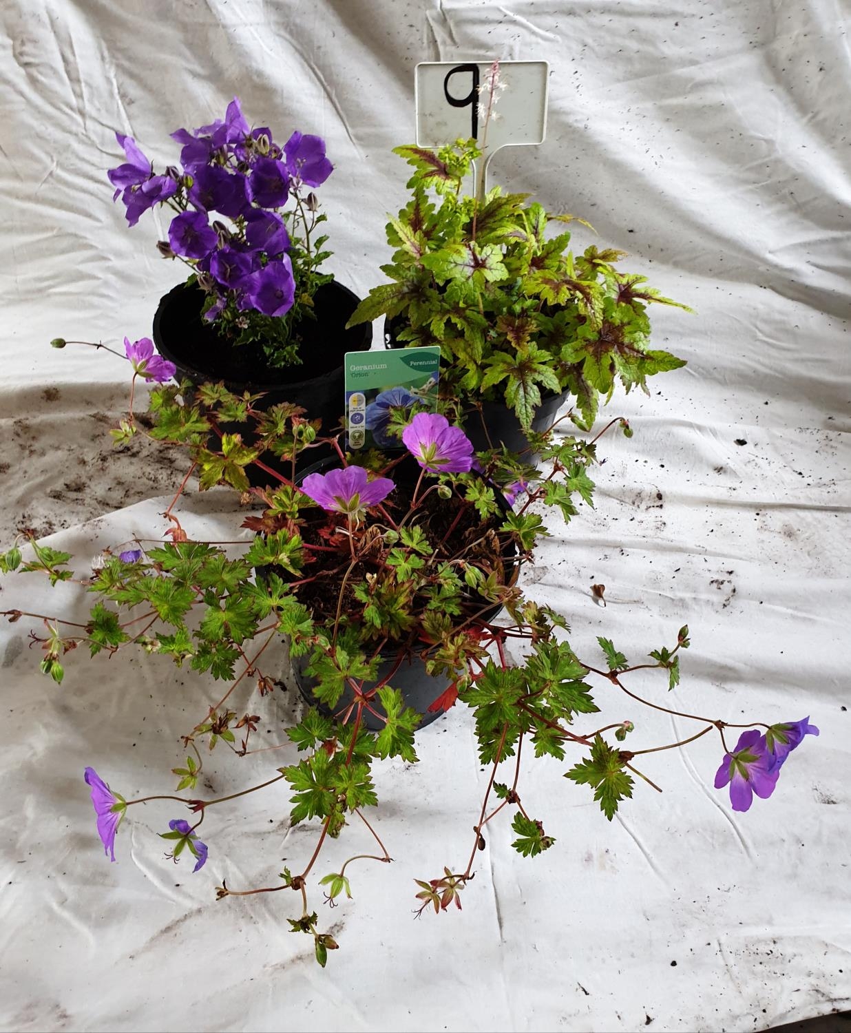Three perennials, Geranium Orion, Tiarella & Platycodon. This lot is not available for in-house P&P.