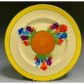 A Clarice Cliff Crocus pattern 25.5cm diameter plate, yellow rim, Wilkinsons marks