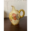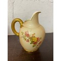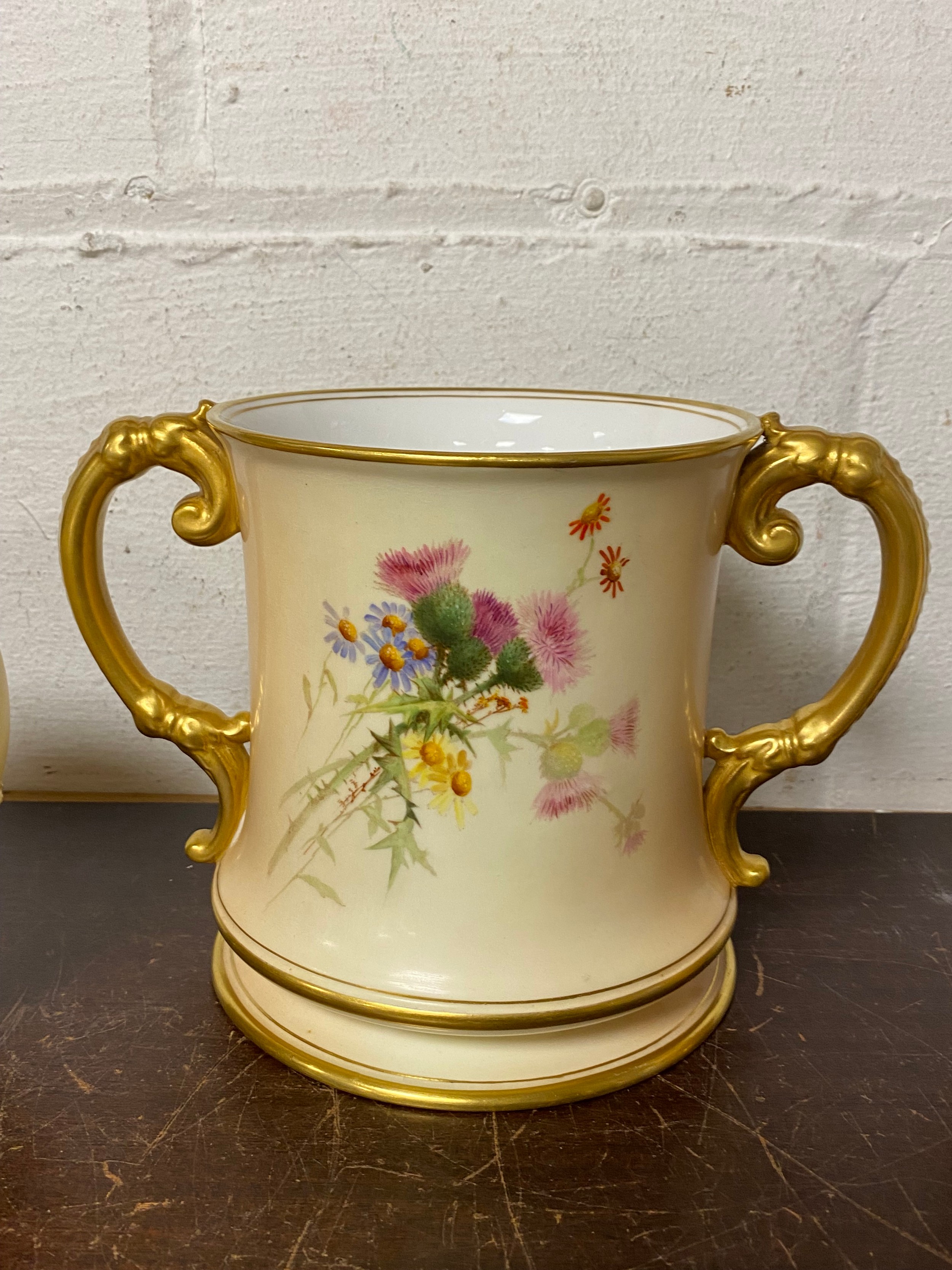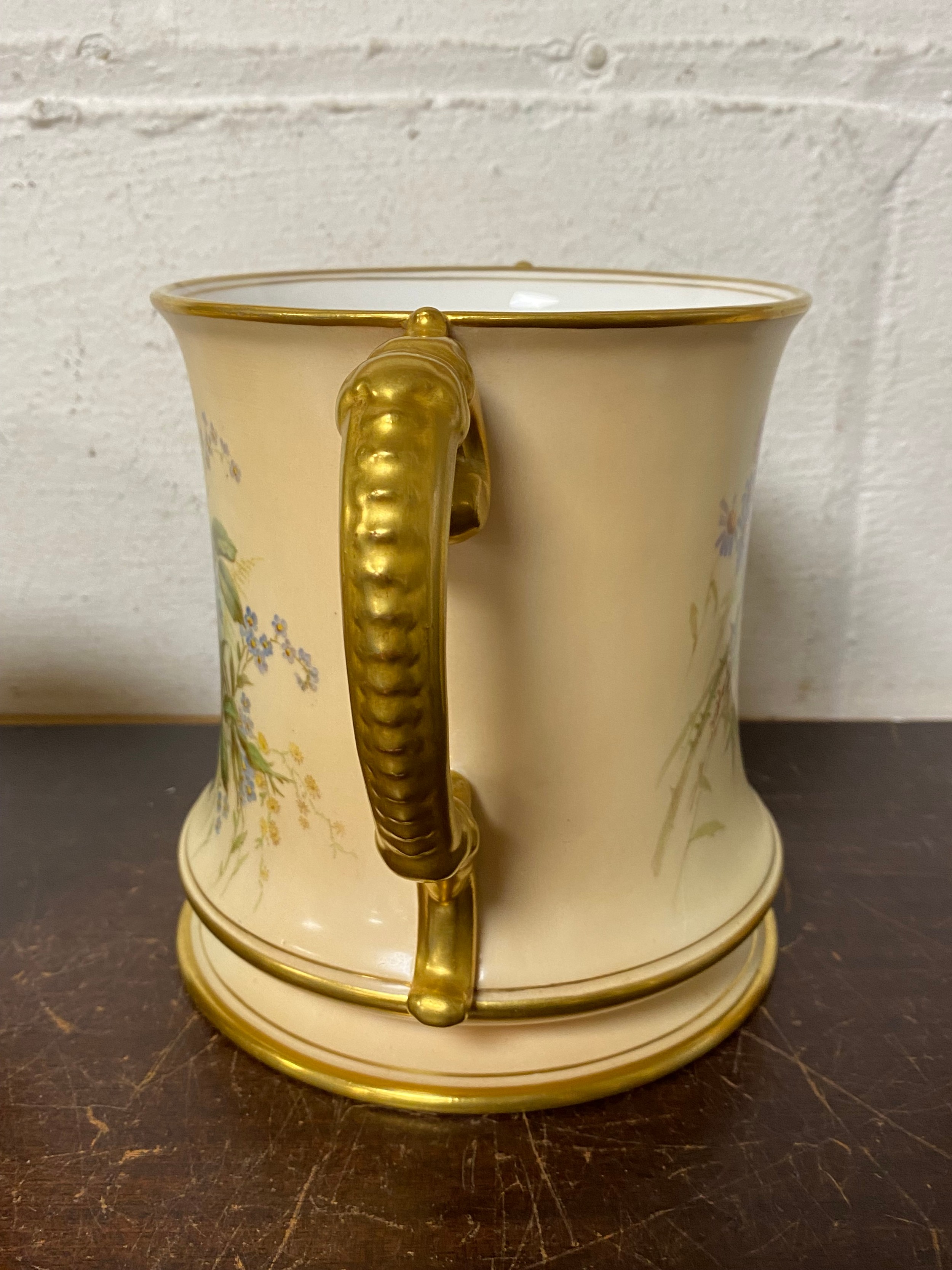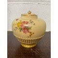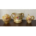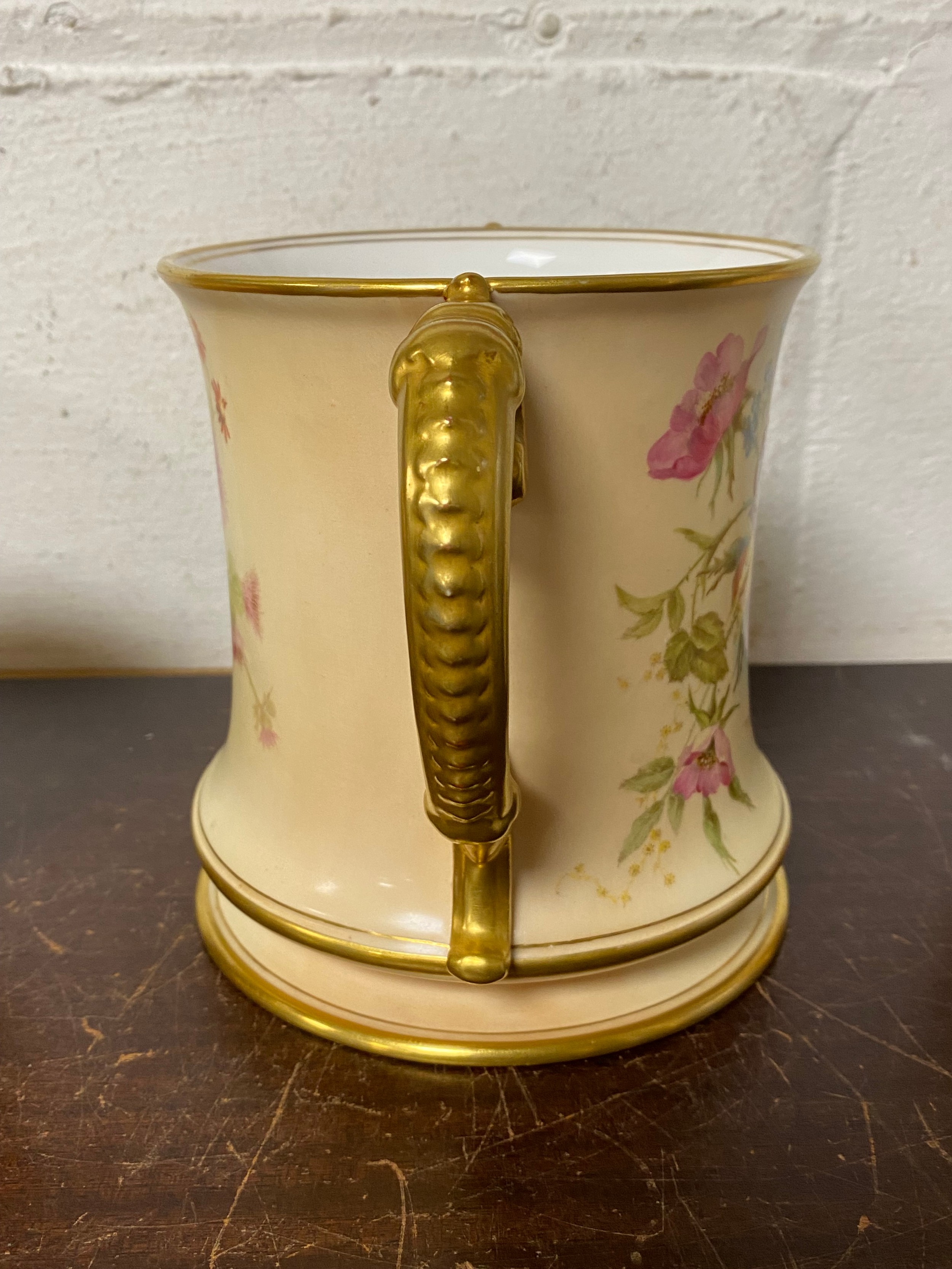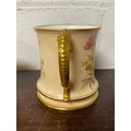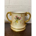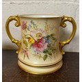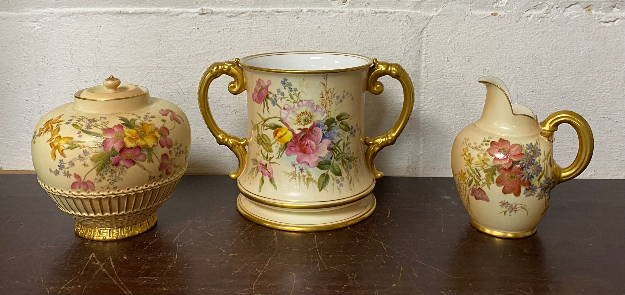 A large Royal Worcester two handled loving cup, painted with flowers on a blush ground, with gilded handles, together with a similar jug and jar and cover -