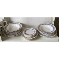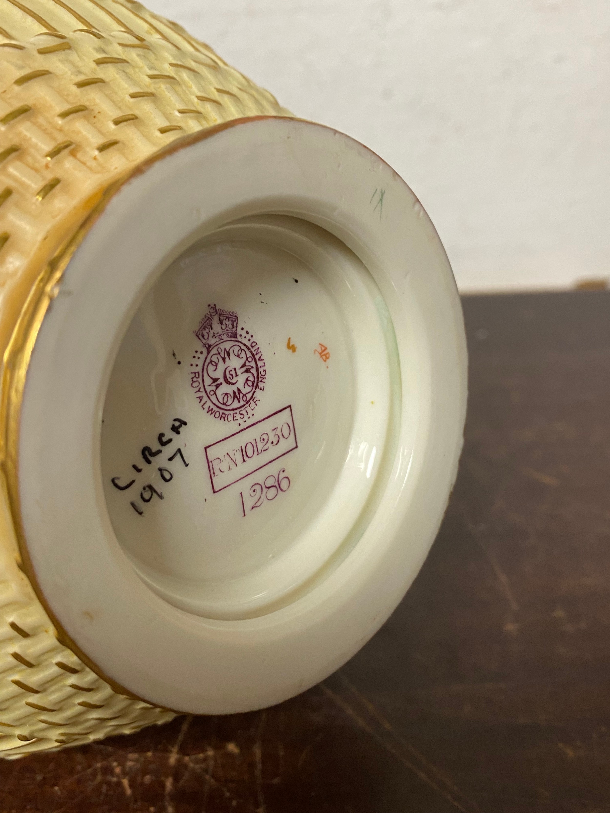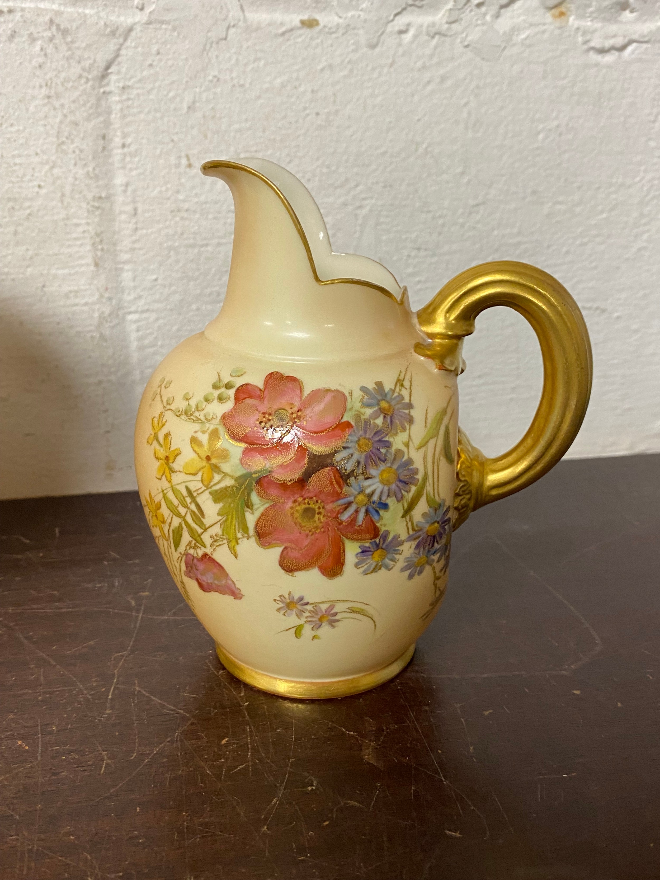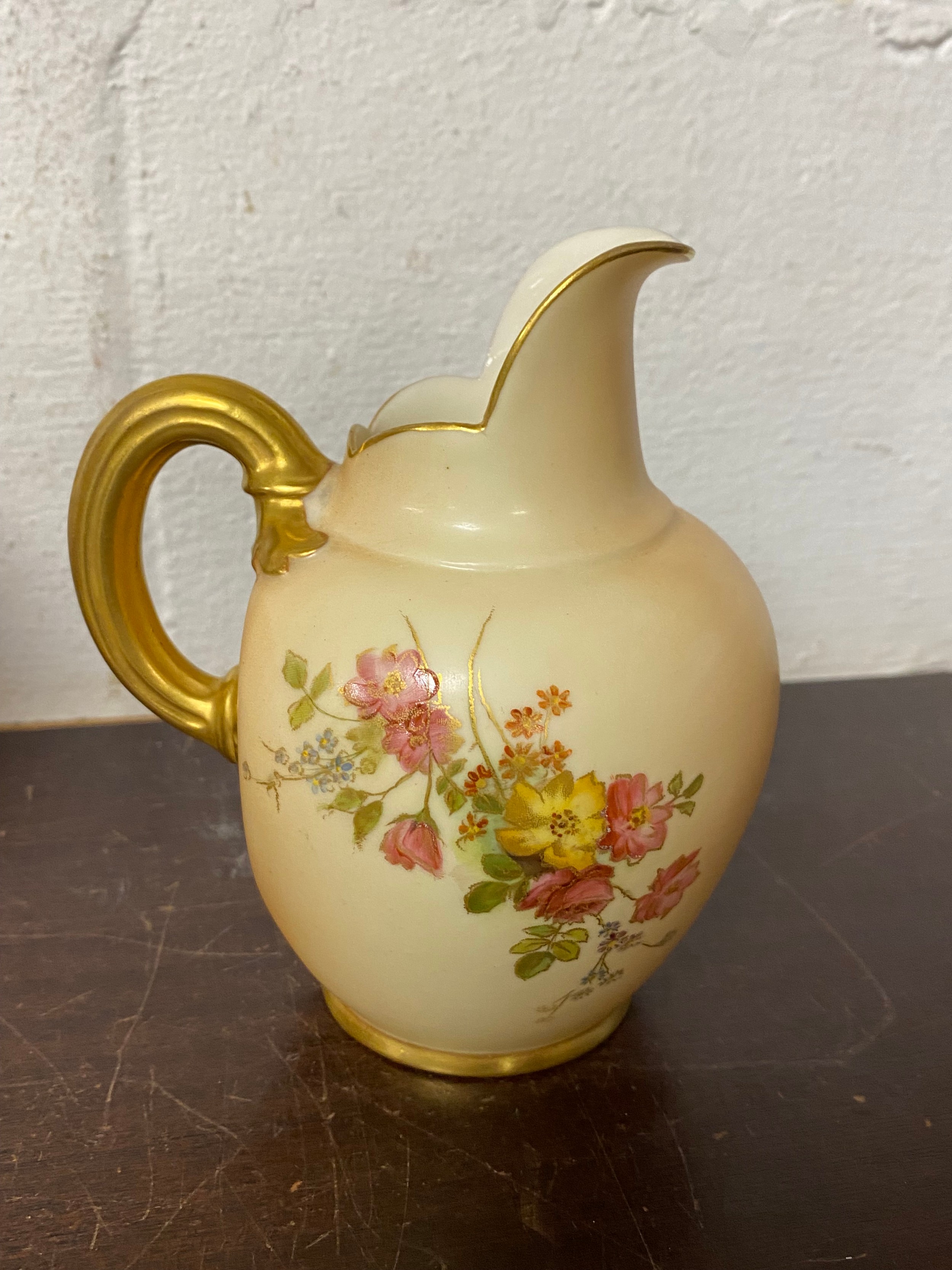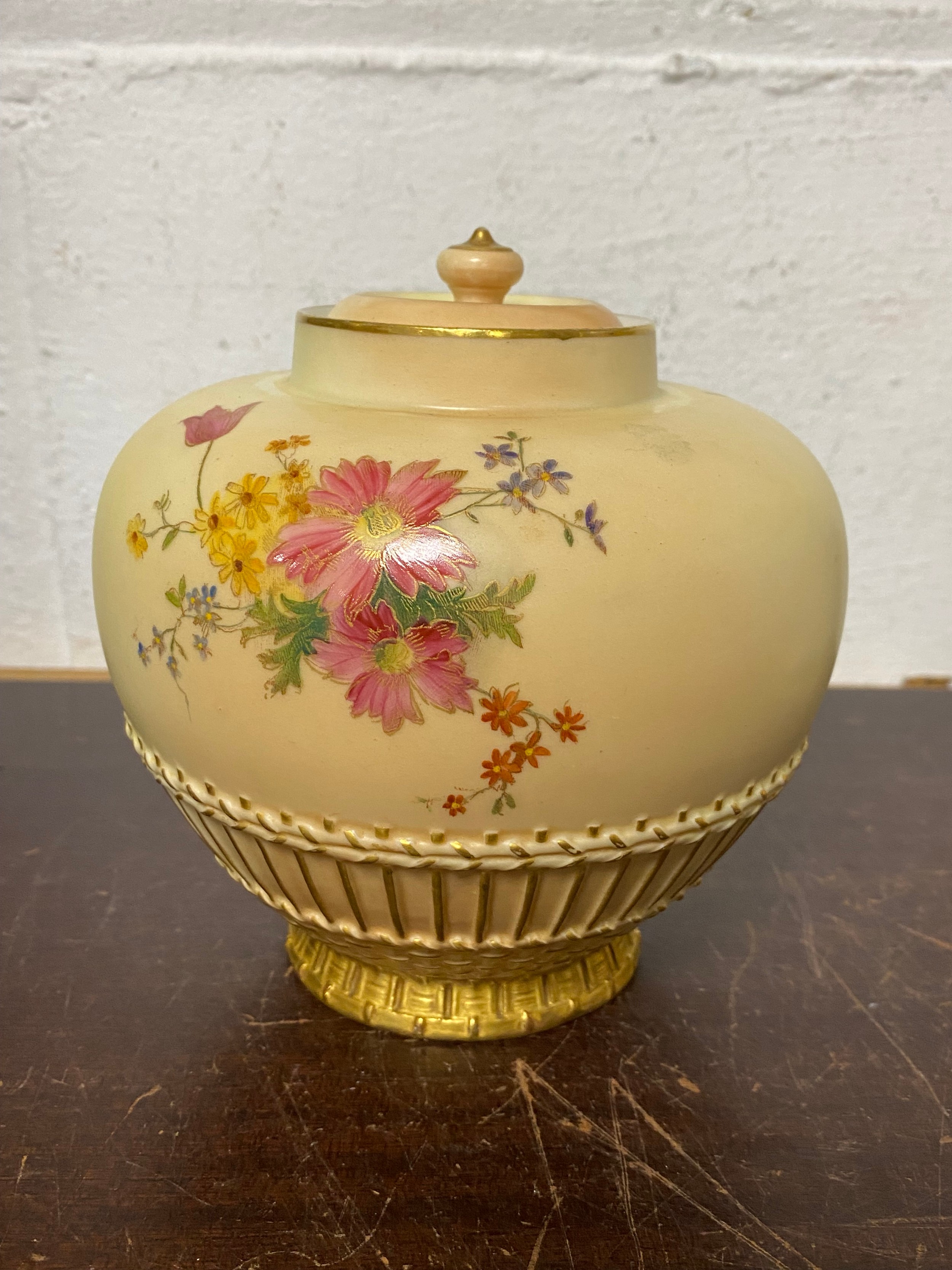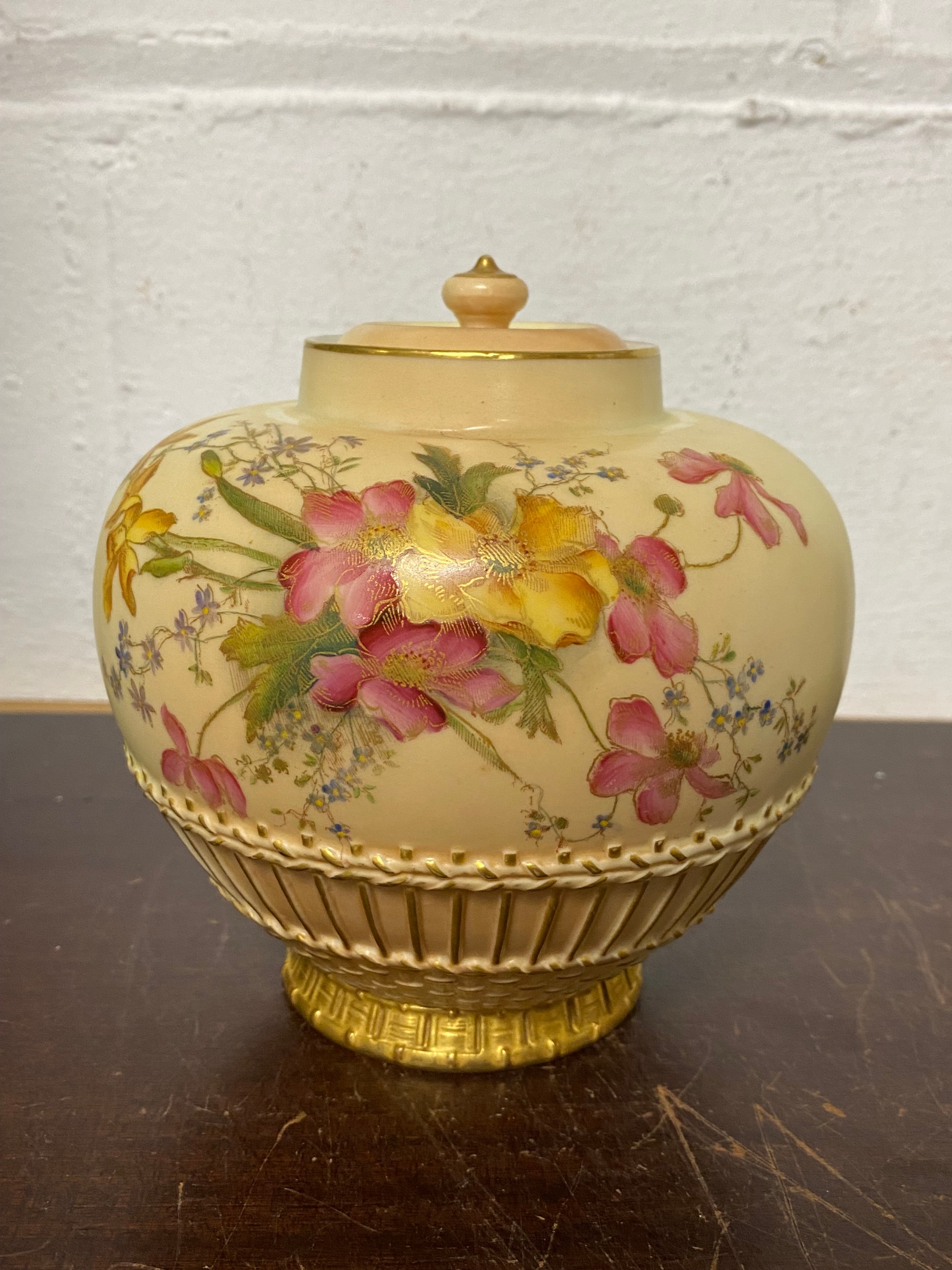A large Royal Worcester two handled loving cup, painted with flowers on a blush ground, with gilded handles, together with a similar jug and jar and cover -