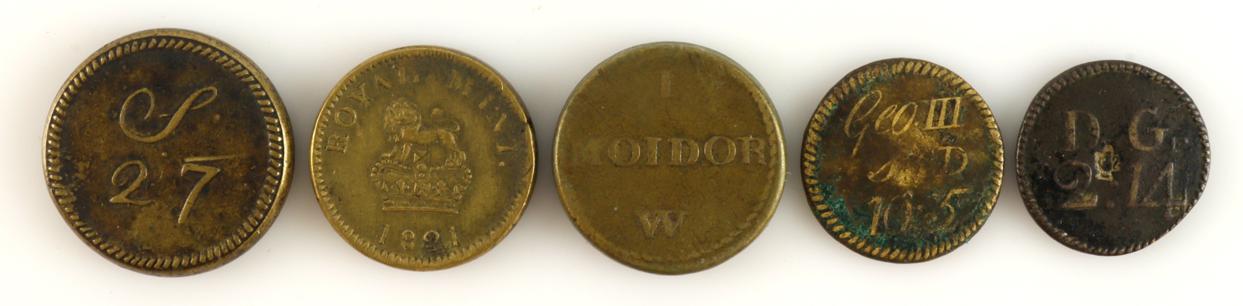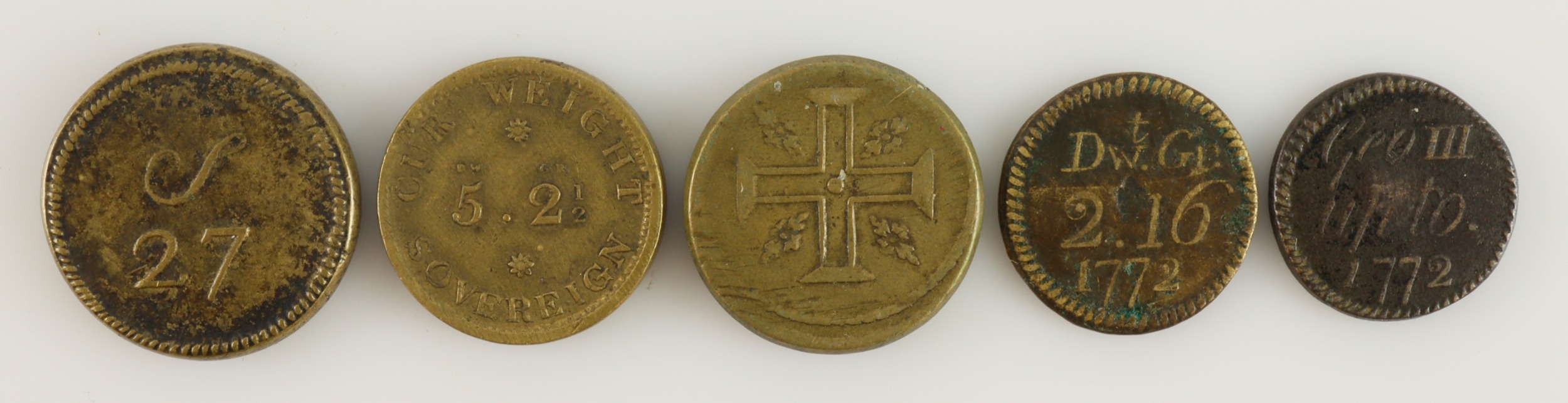 Coin Weights (5) 18th-19thC brass for English and Portuguese standards.