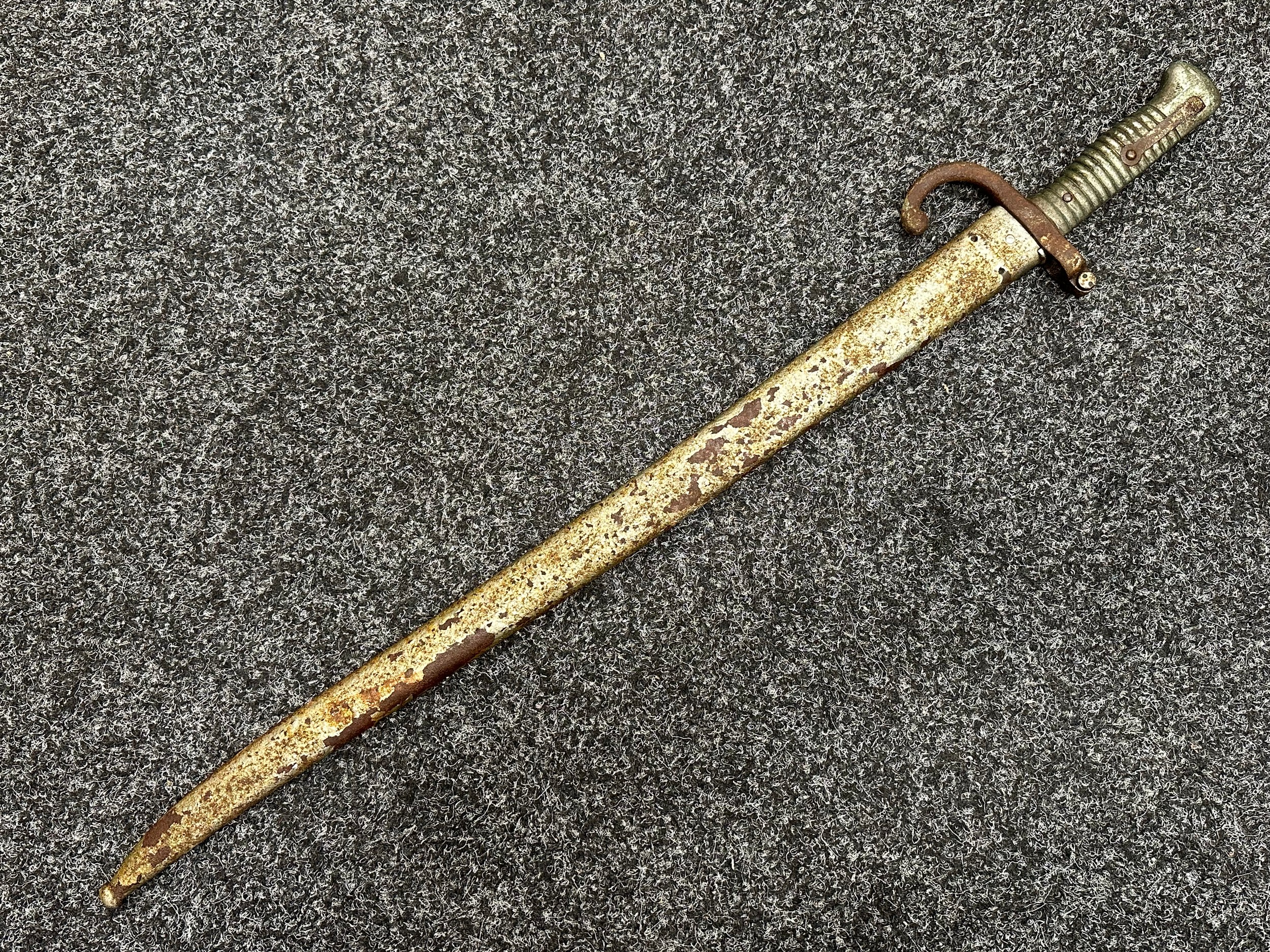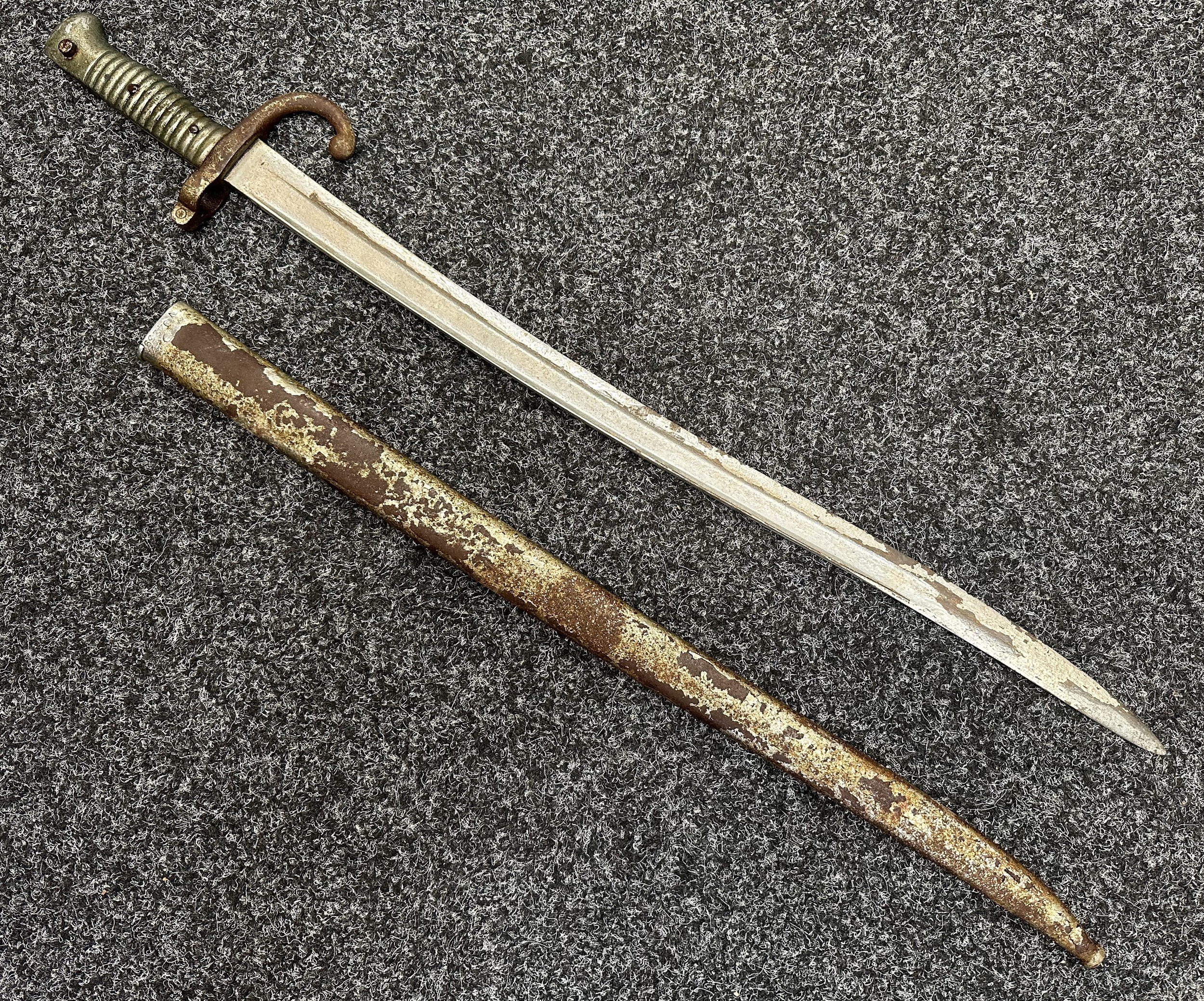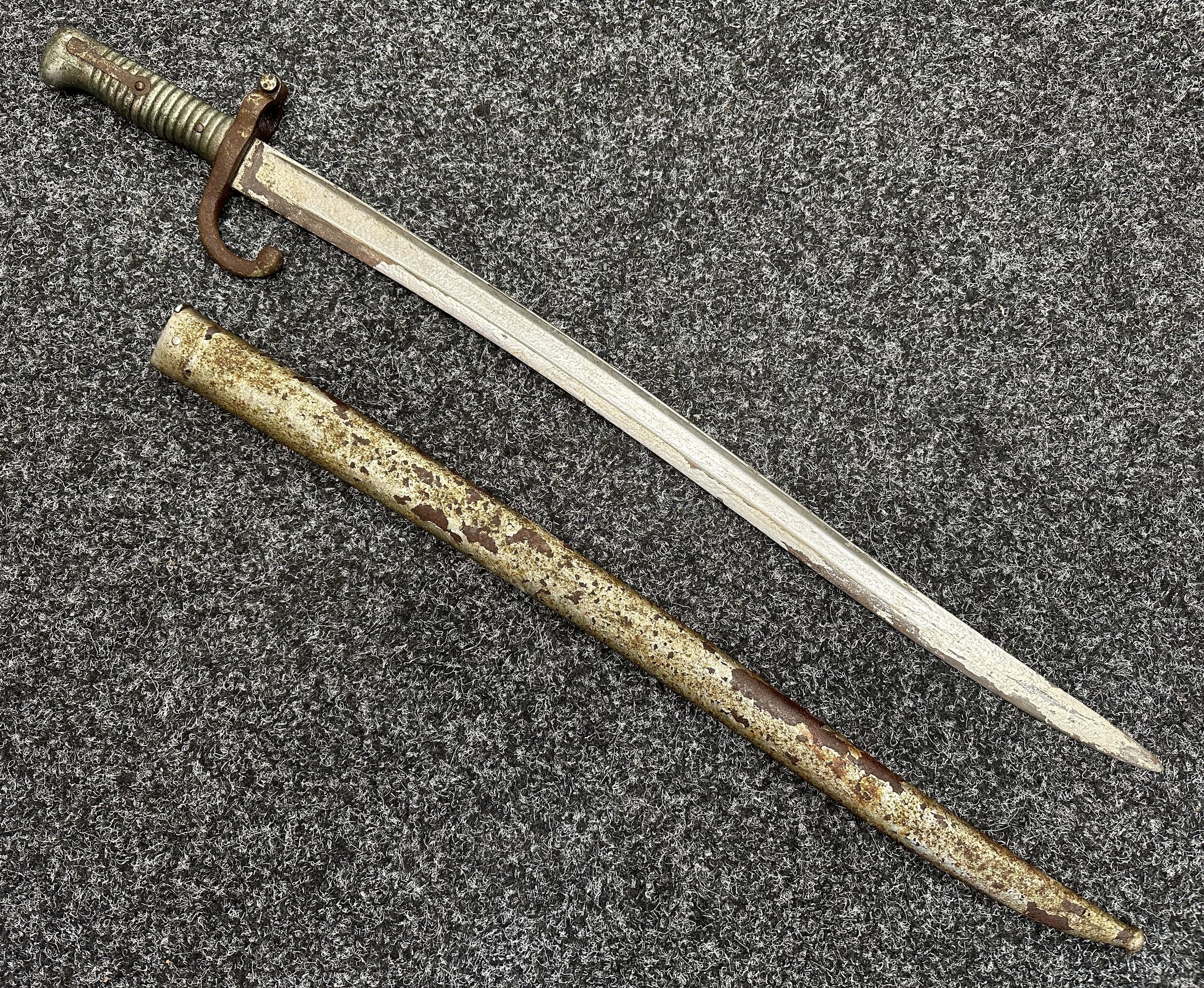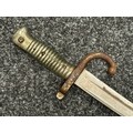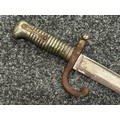 French 1866 pattern Chassepot Bayonet with single edged fullered blade 570mm in length. Working release catch. Overall length 695mm. Has been plated overall. Complete with scabbard which again has been plated.