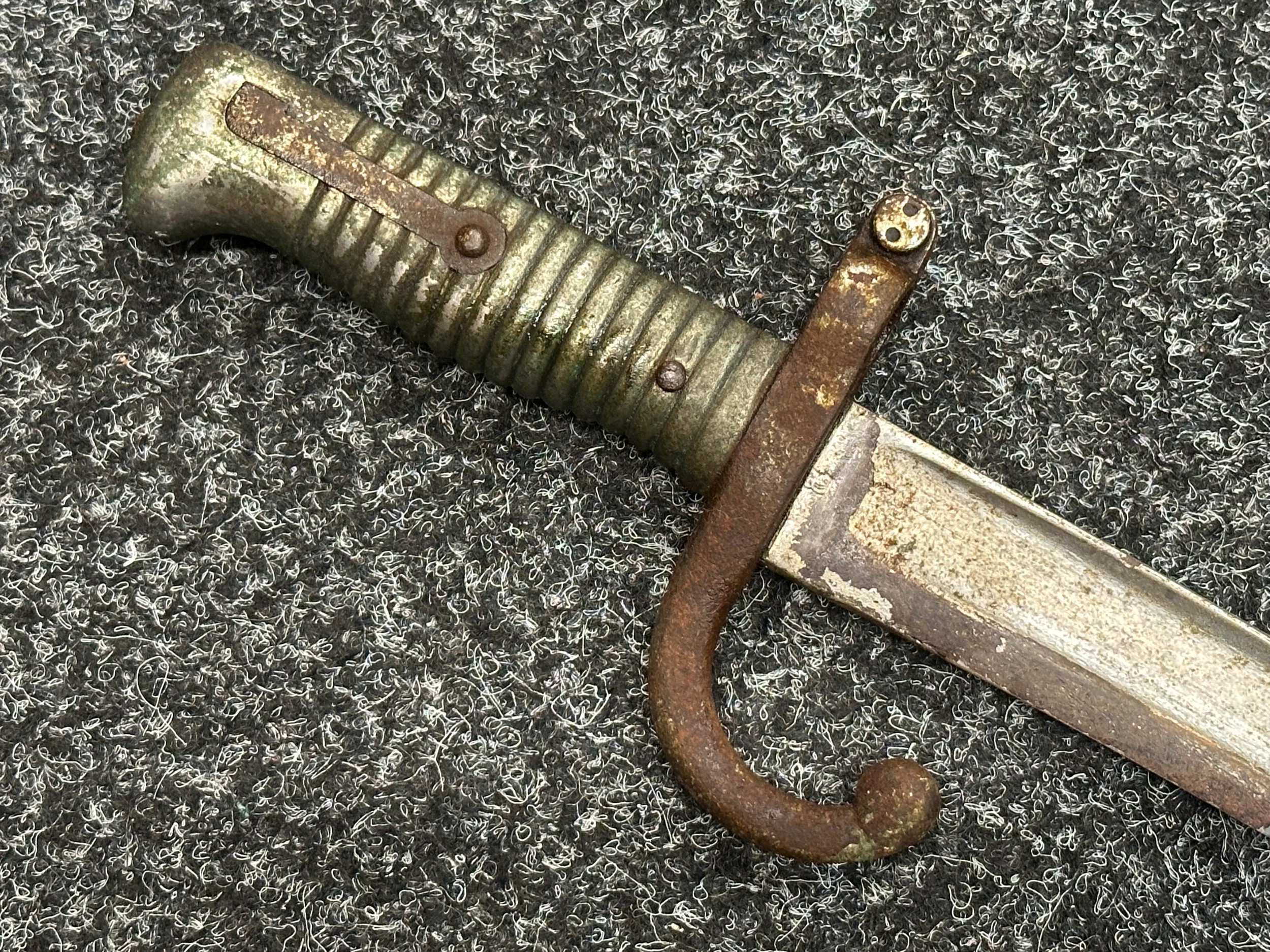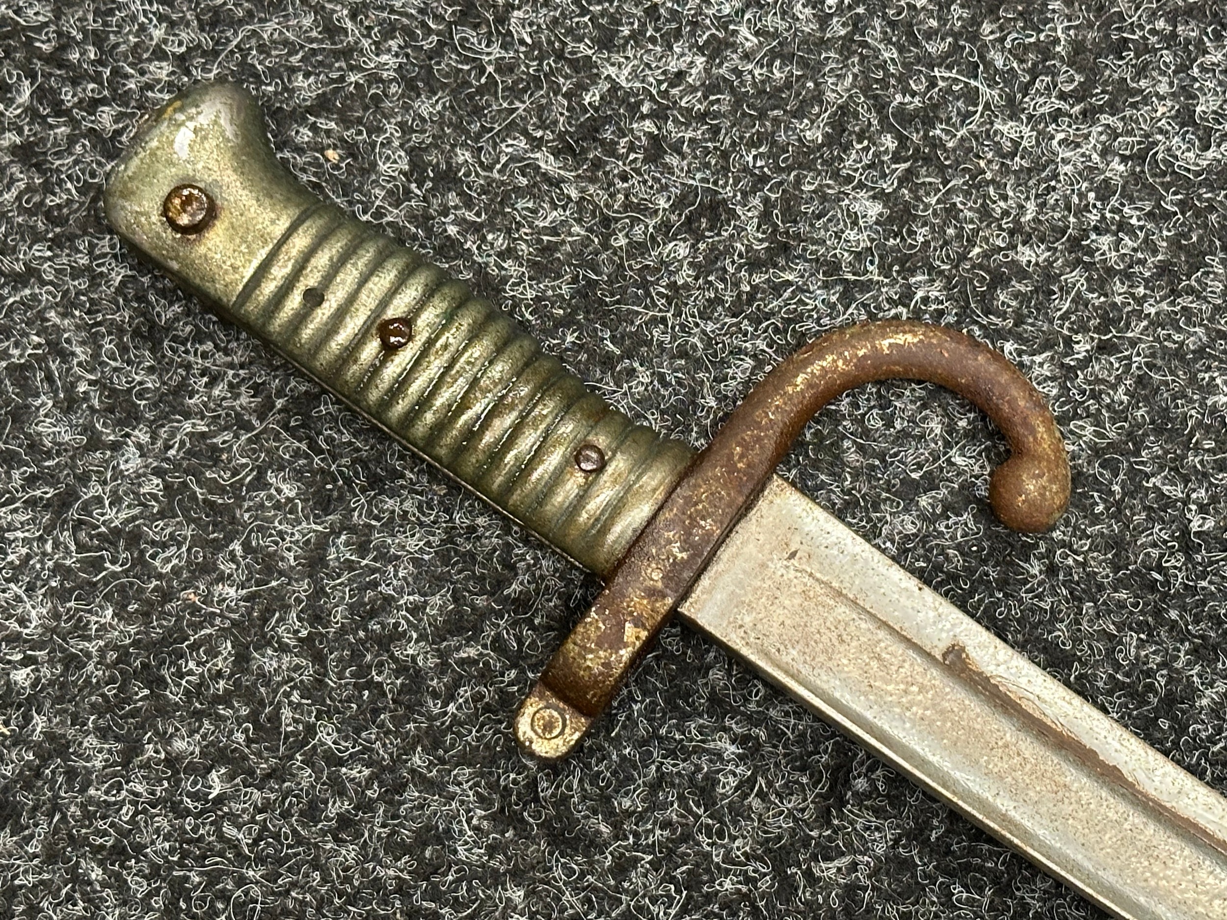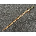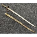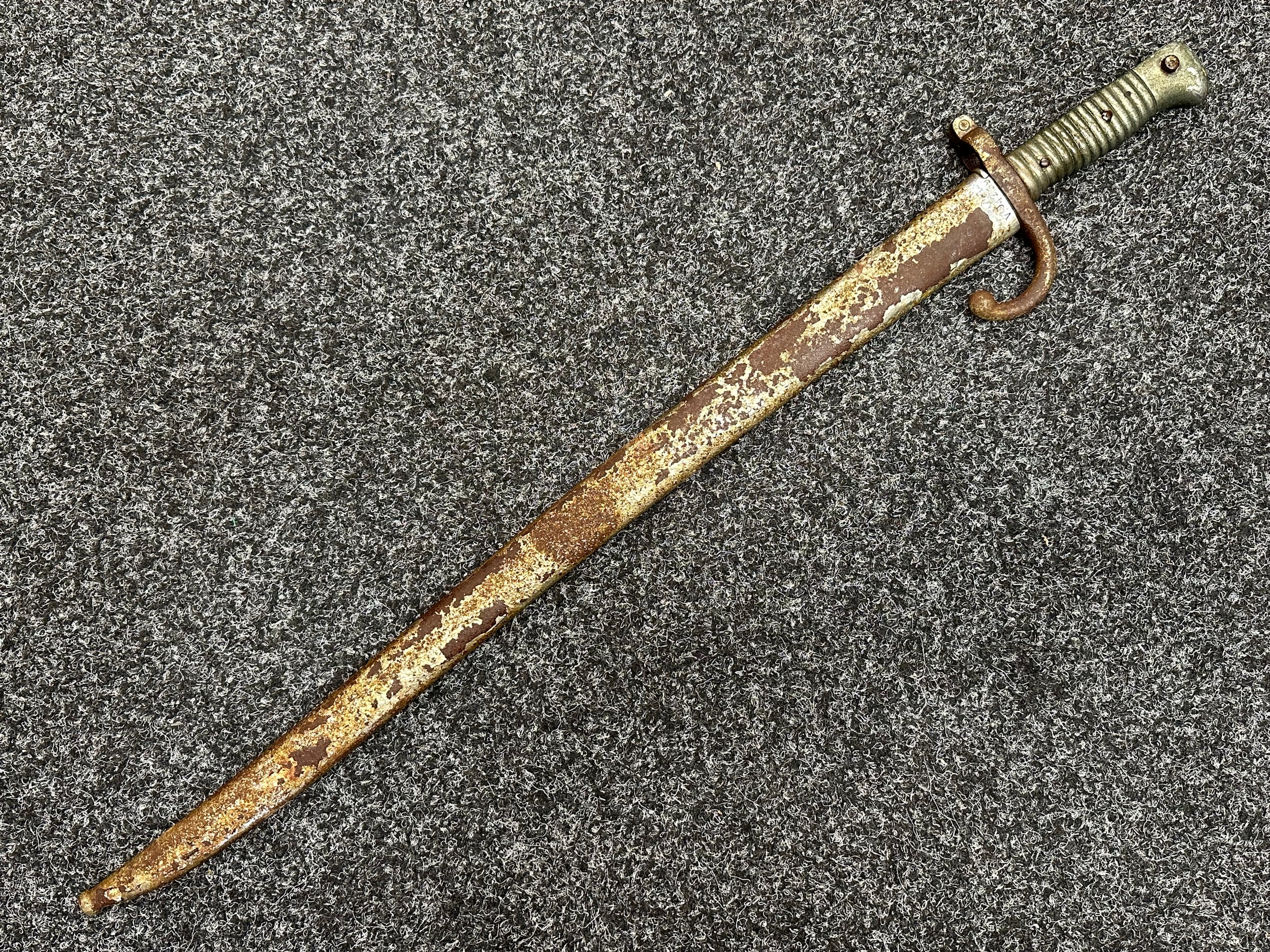 French 1866 pattern Chassepot Bayonet with single edged fullered blade 570mm in length. Working release catch. Overall length 695mm. Has been plated overall. Complete with scabbard which again has been plated.