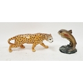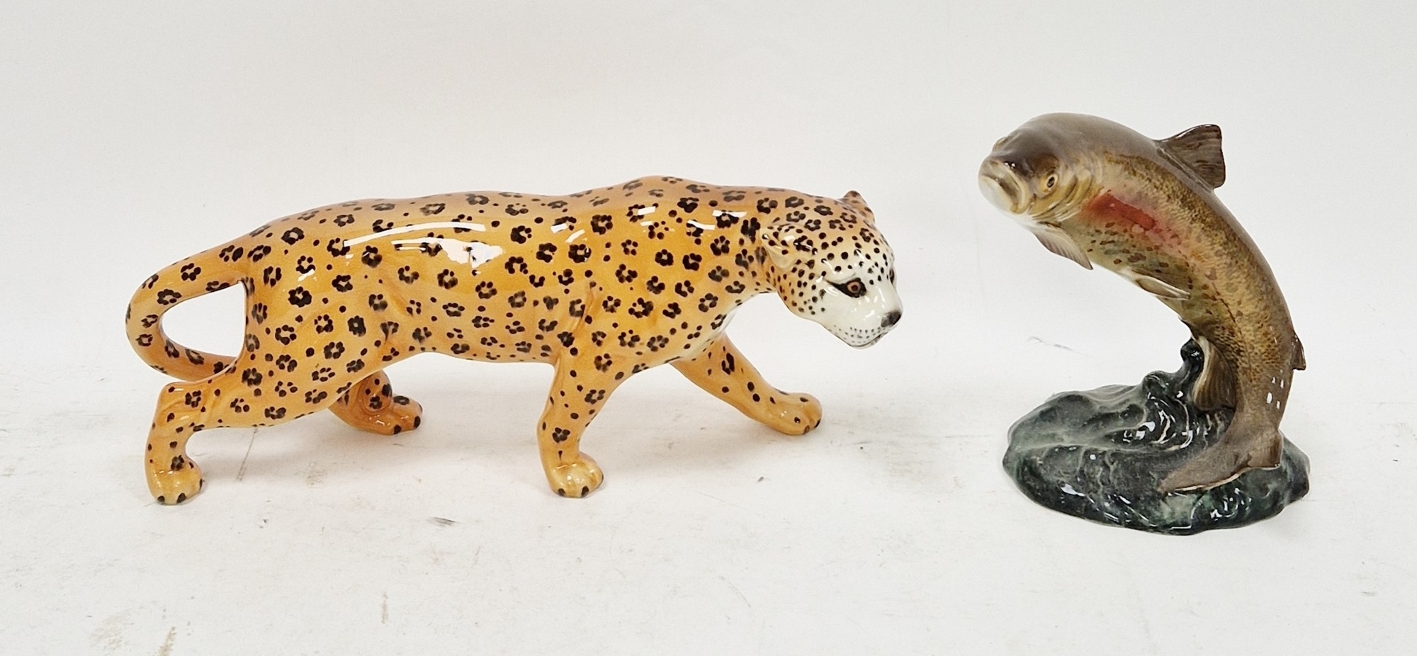 Beswick pottery model of a prowling leopard, printed black factory marks, 30cm long and a model of a leaping trout on wave moulded base, 16.3cm high, black factory marks, the trout with impressed shape no 1032 (2)