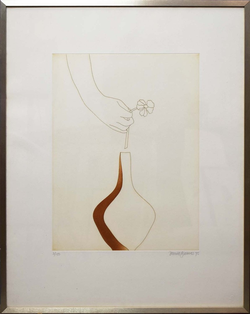 DERRICK GREAVES (BRITISH 1927-2002). HAND, FLOWER AND VASE. (d) lithograph, signed and numbered 2/150 in pencil, 80cm x 64cm, framed. (Subject to ARR - see Buyers Conditions).