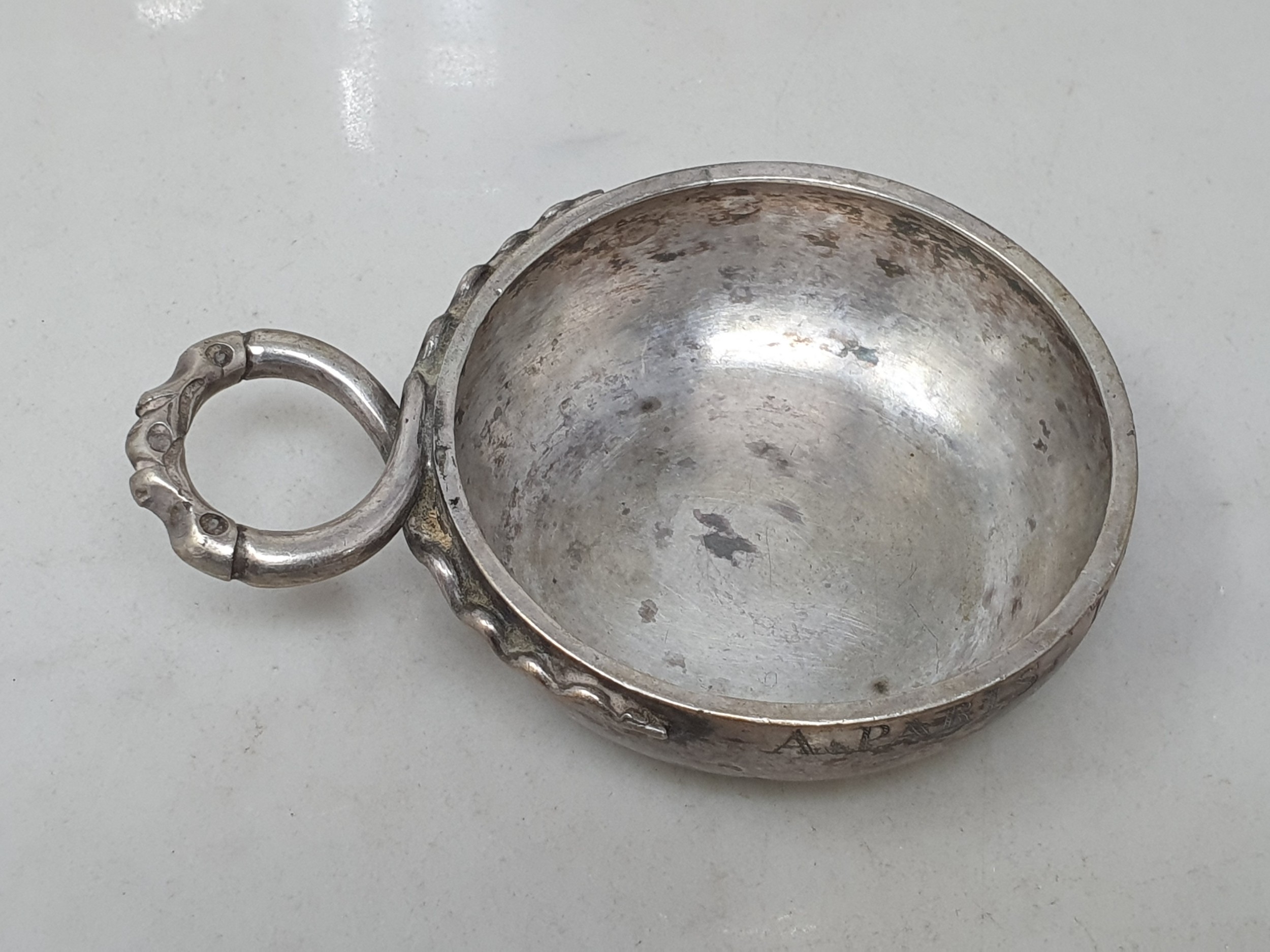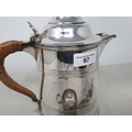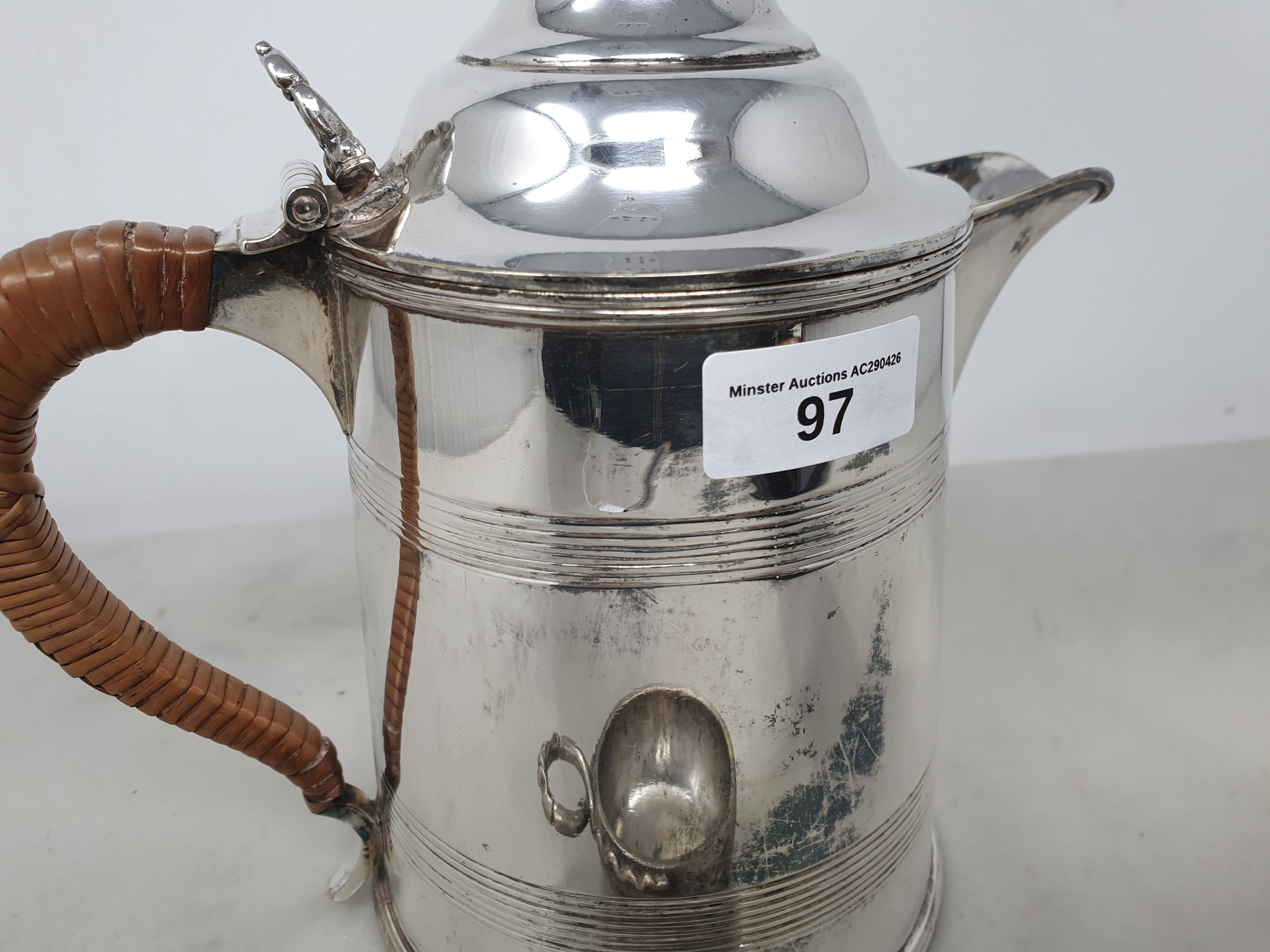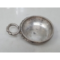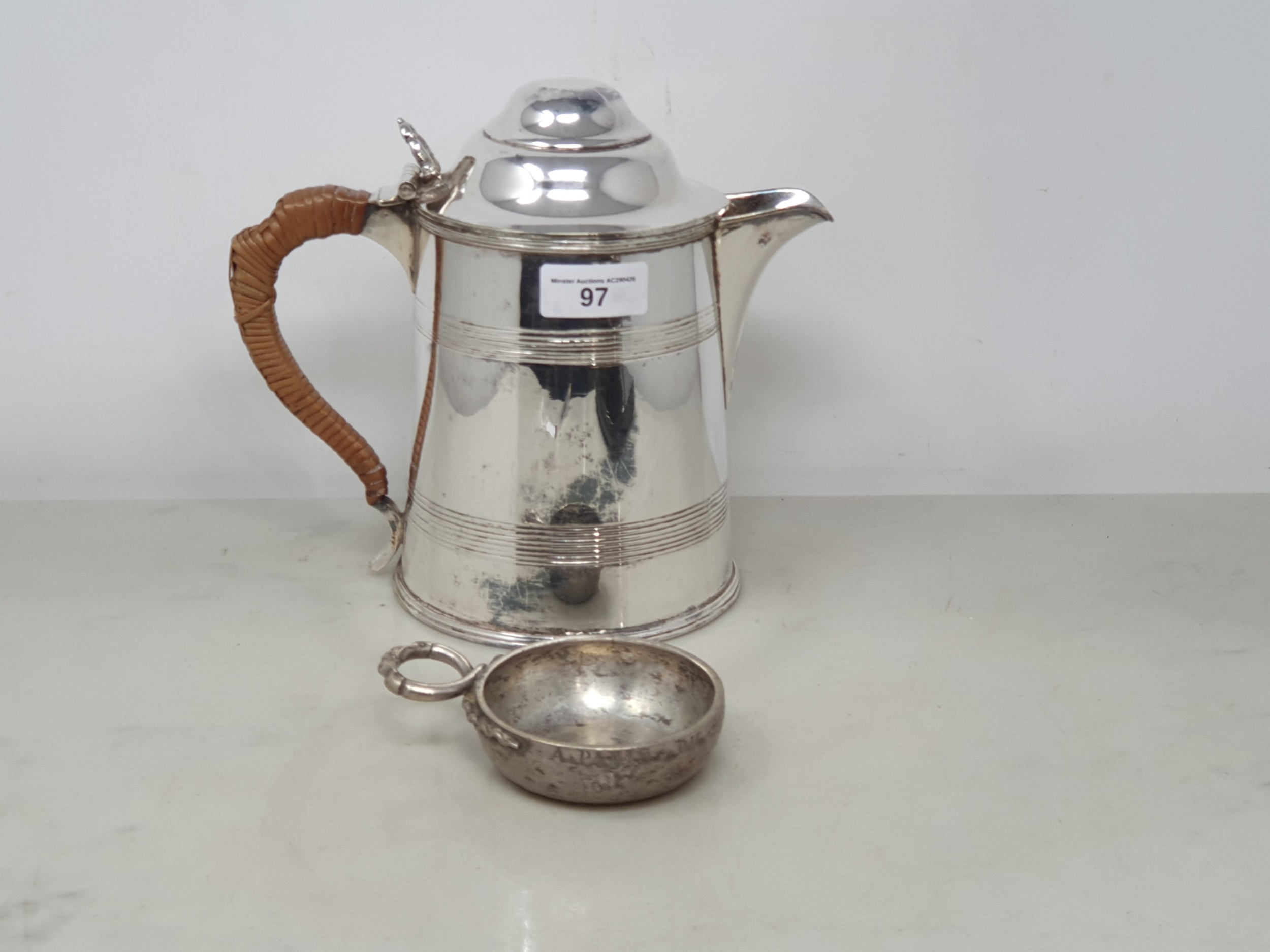 A Continental white metal circular Wine Taster with serpent handle, and a plated Wine Jug with domed lid and reeded bands
