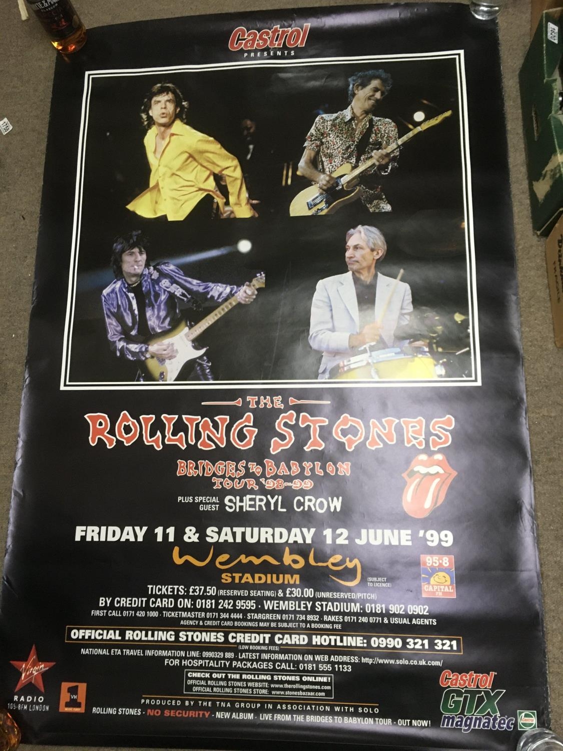 Two bus stop posters for The Rolling Stones 'Bridges To Babylon' tour 1998-99, approx 102cm x 155cm, together with a vintage poster of Mick Jagger approx 148cm x 105cm, and one of The Who in concert, approx 107cm x 147cm.
