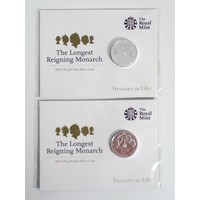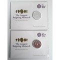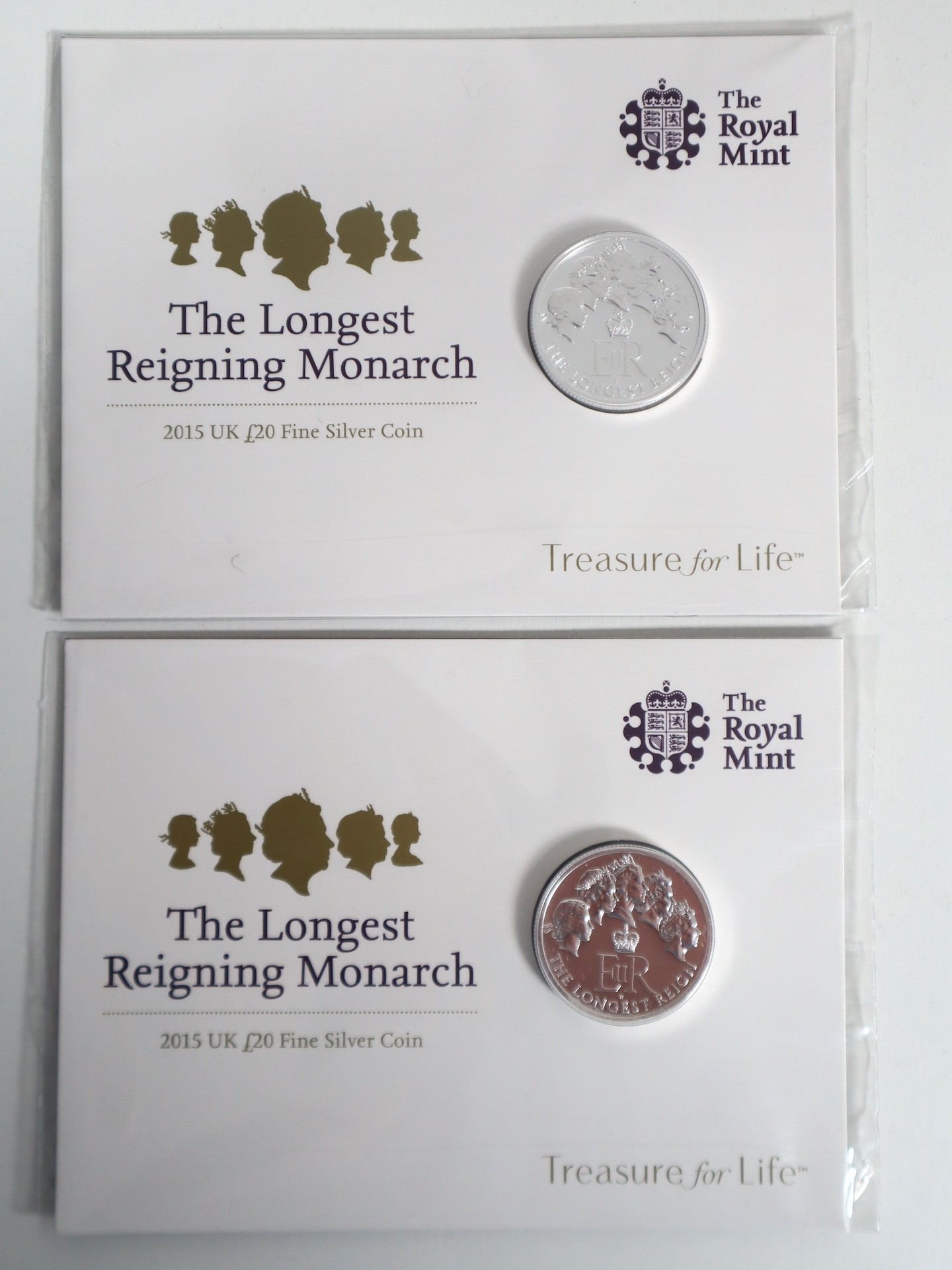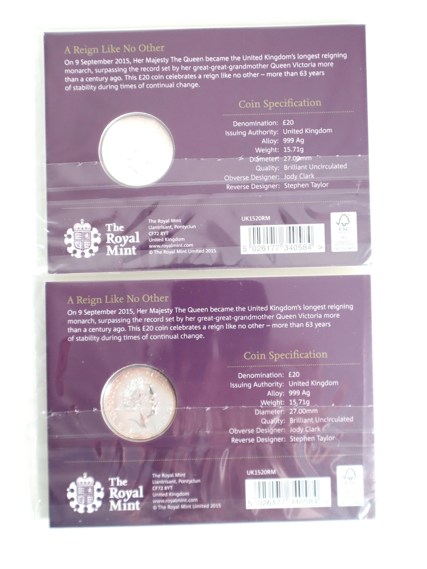 Two The Longest Reigning Monarch 2015 UK £20 Fine Silver Brilliant Uncirculated Coins 999Ag 15.71g each