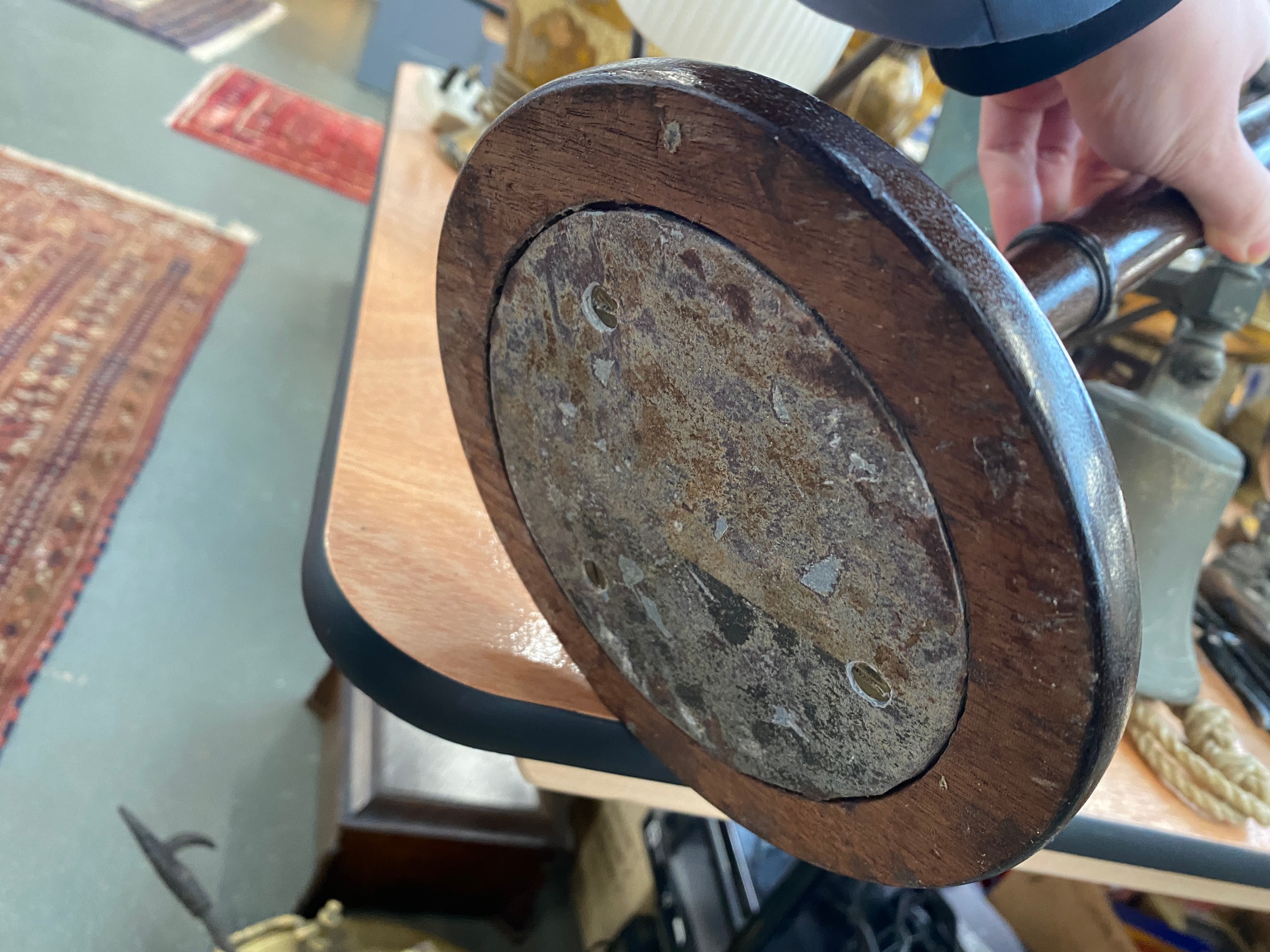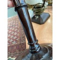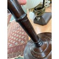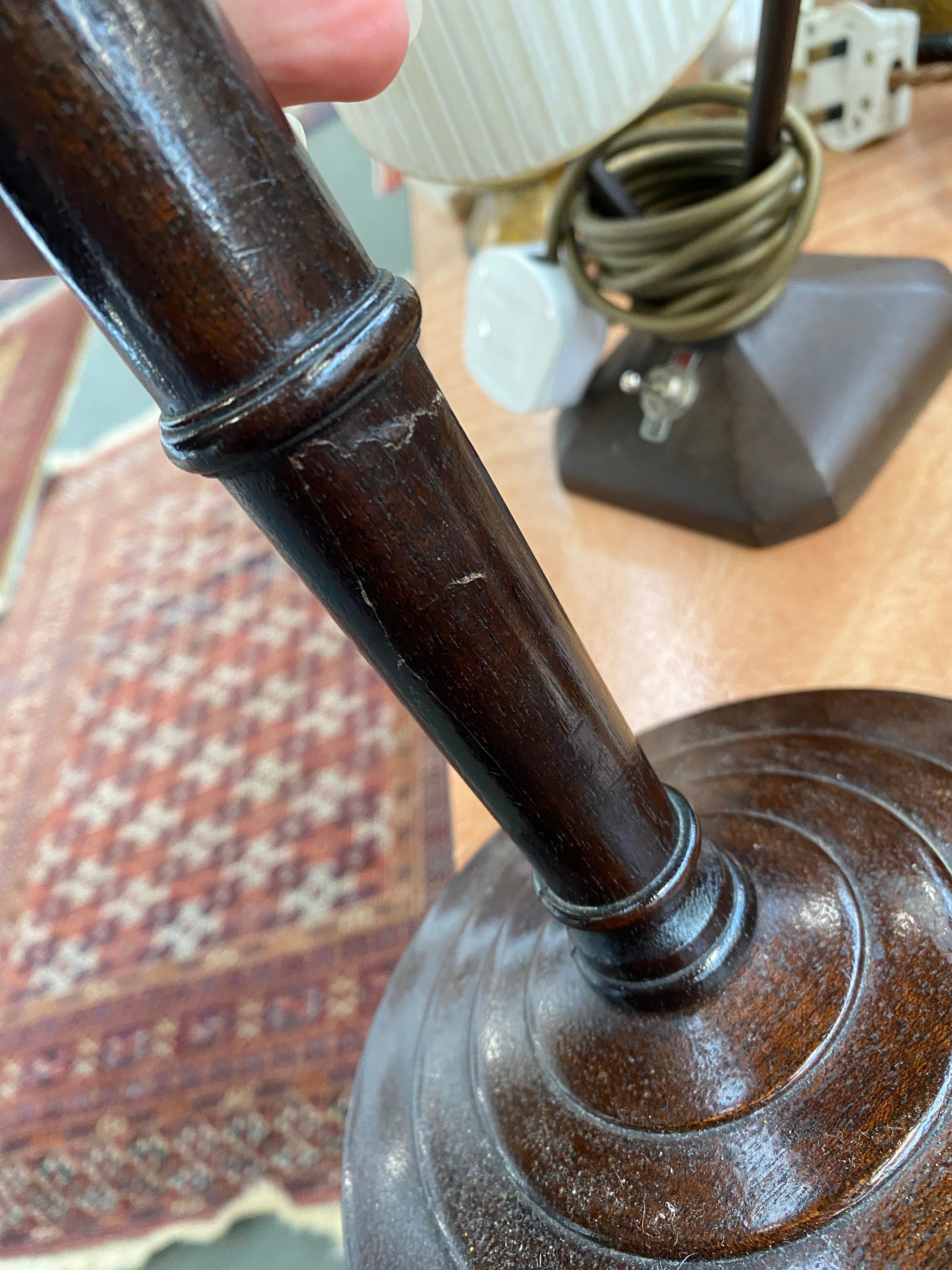 A turned wood table lamp (af, repaired), 36cmH to base of fitting