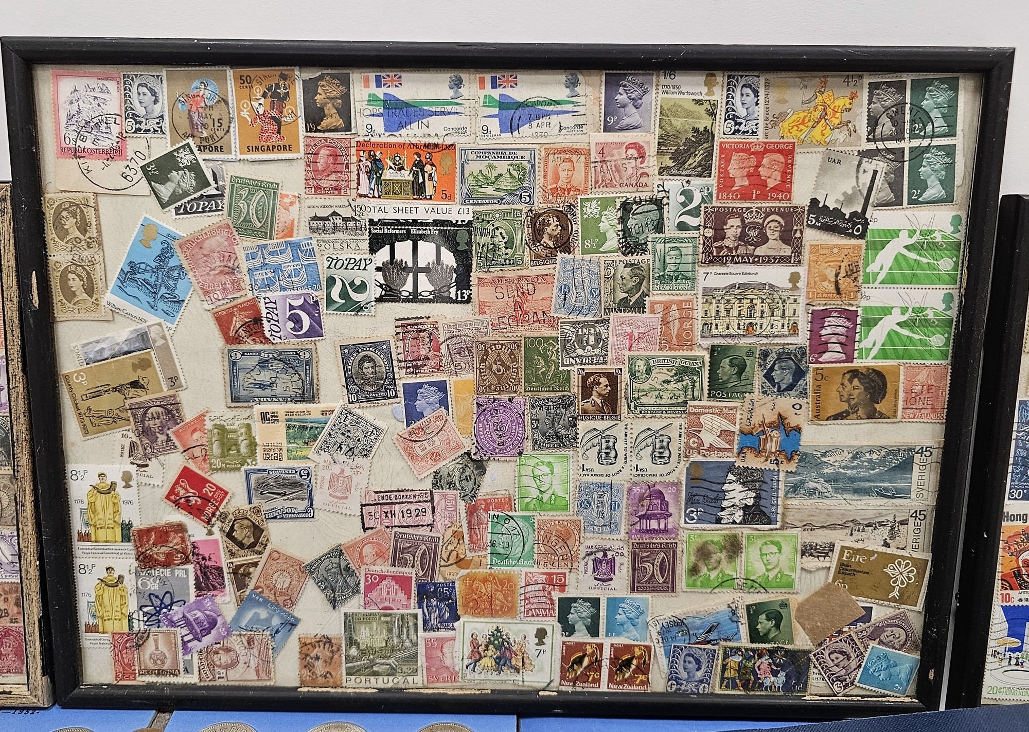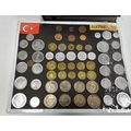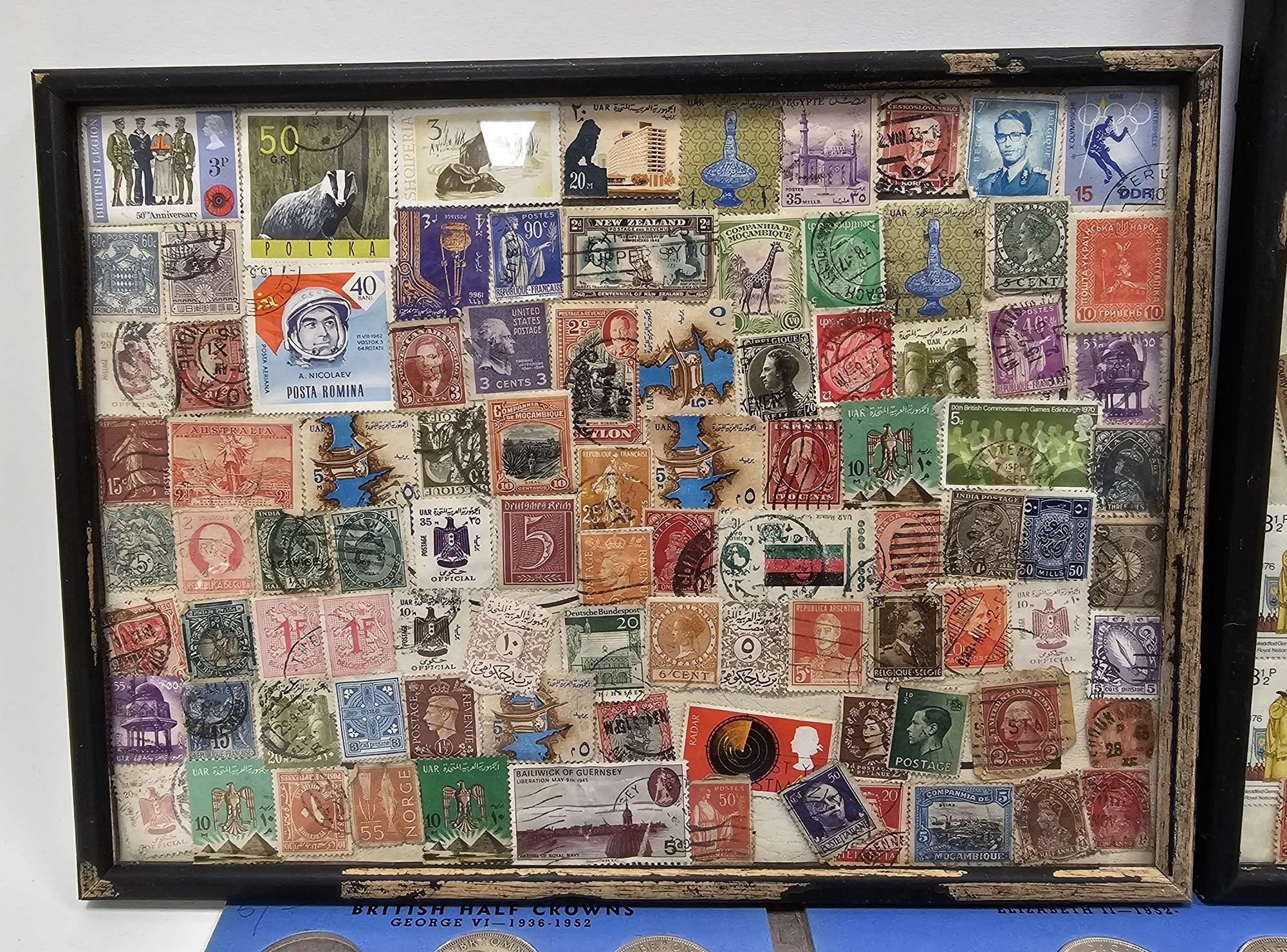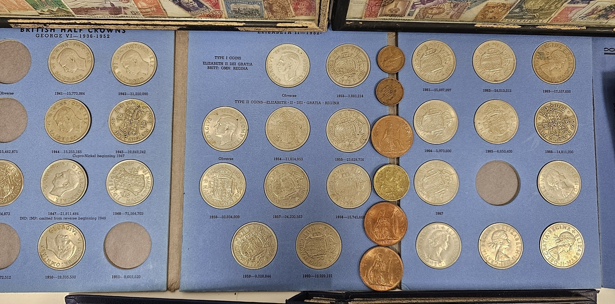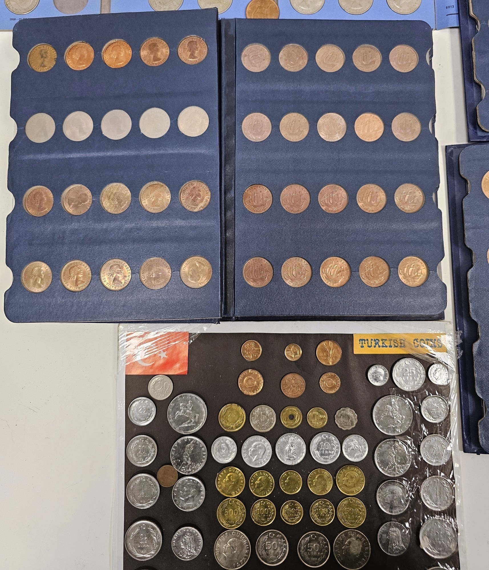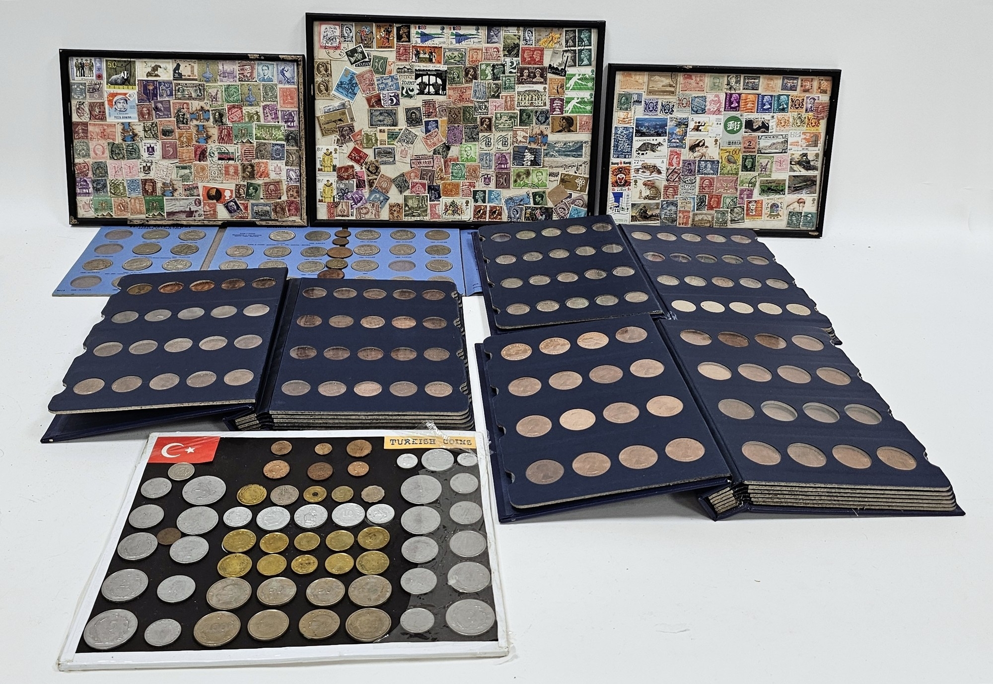 Collection of coins and stamps including three Sandhill coin library albums, one containing half penny coins from 1950's onwards, another containing penny coins from 1960's onwards, and the other containing a mix of shilling coins and penny coins together with partially complete Great Britain half crowns collection from 1941, collection of Turkish coins and three framed, glazed and mounted collections of used stamps