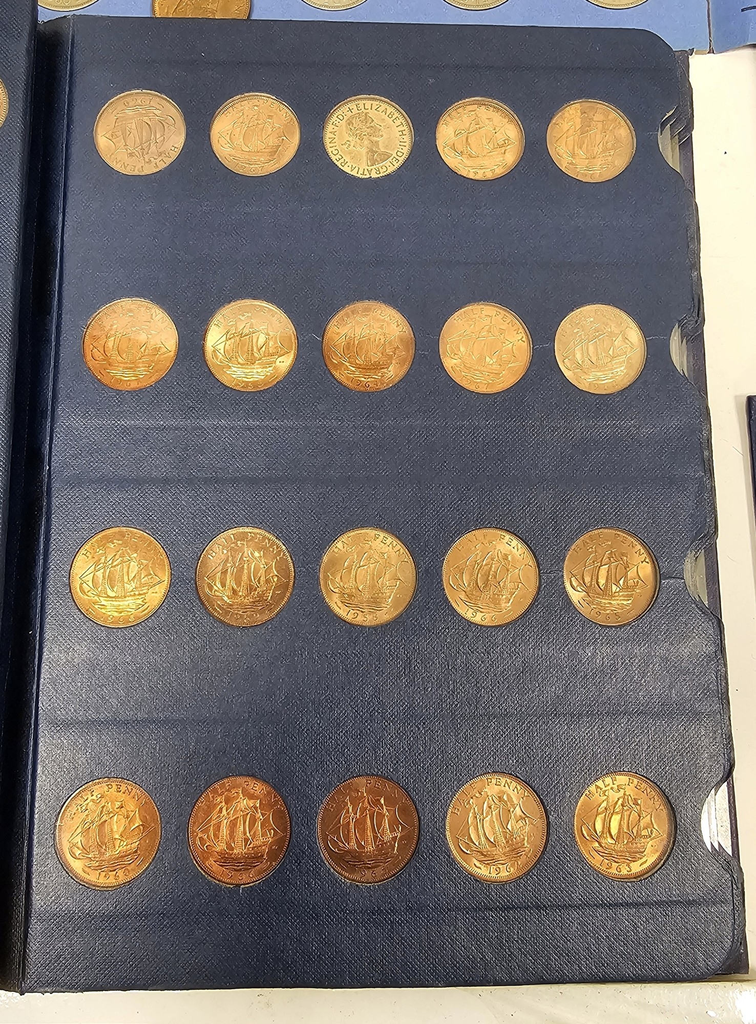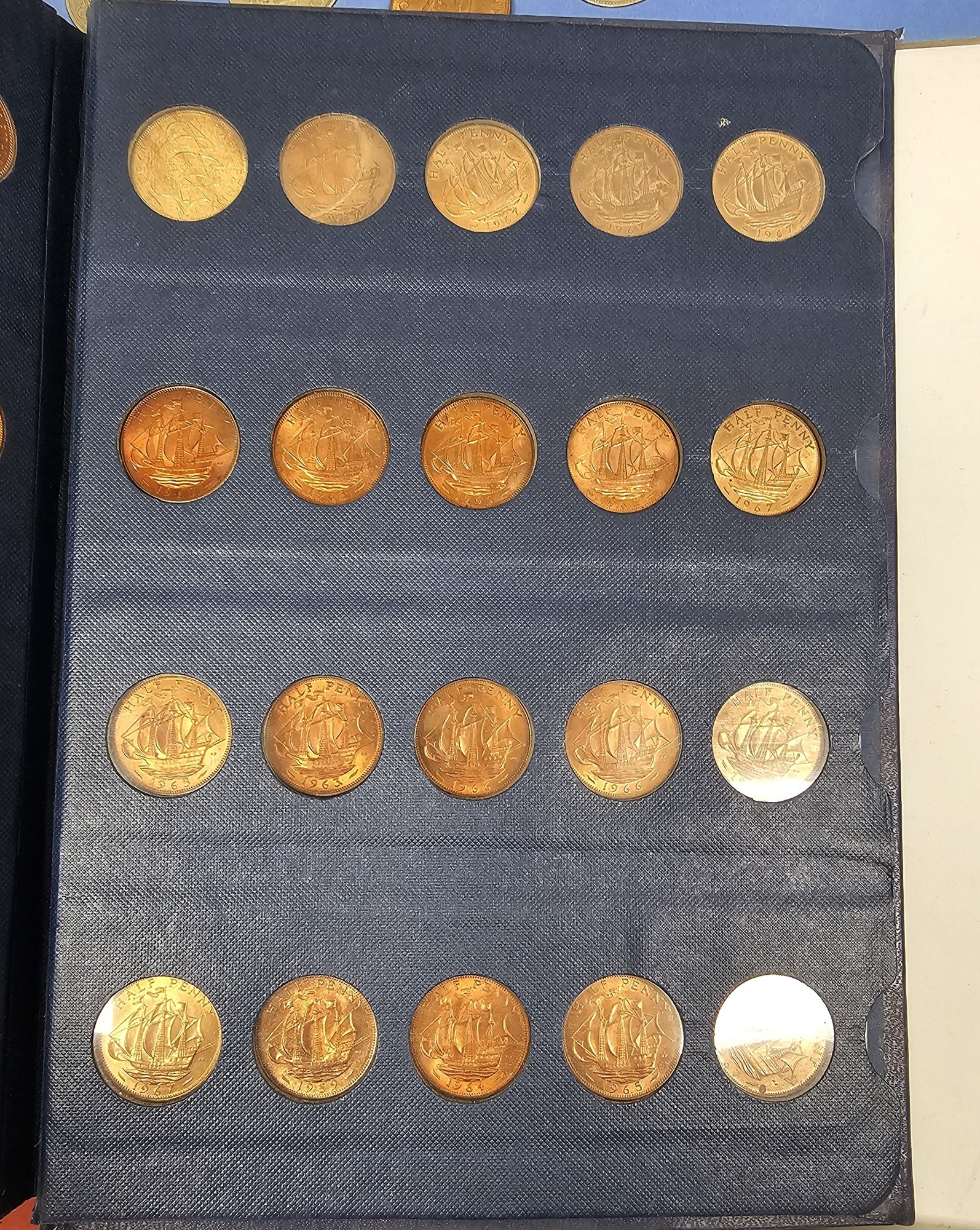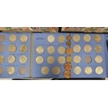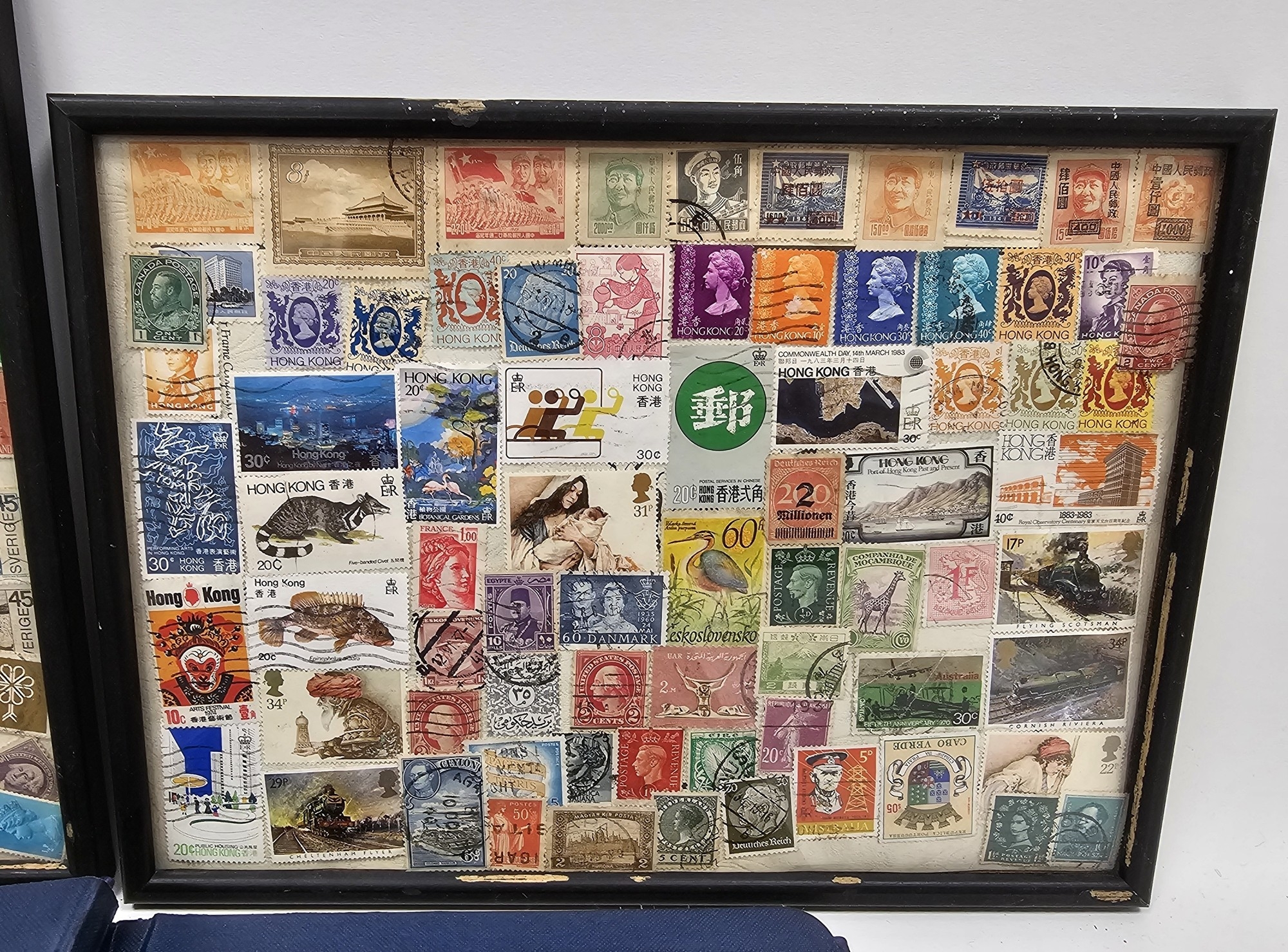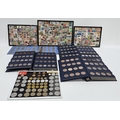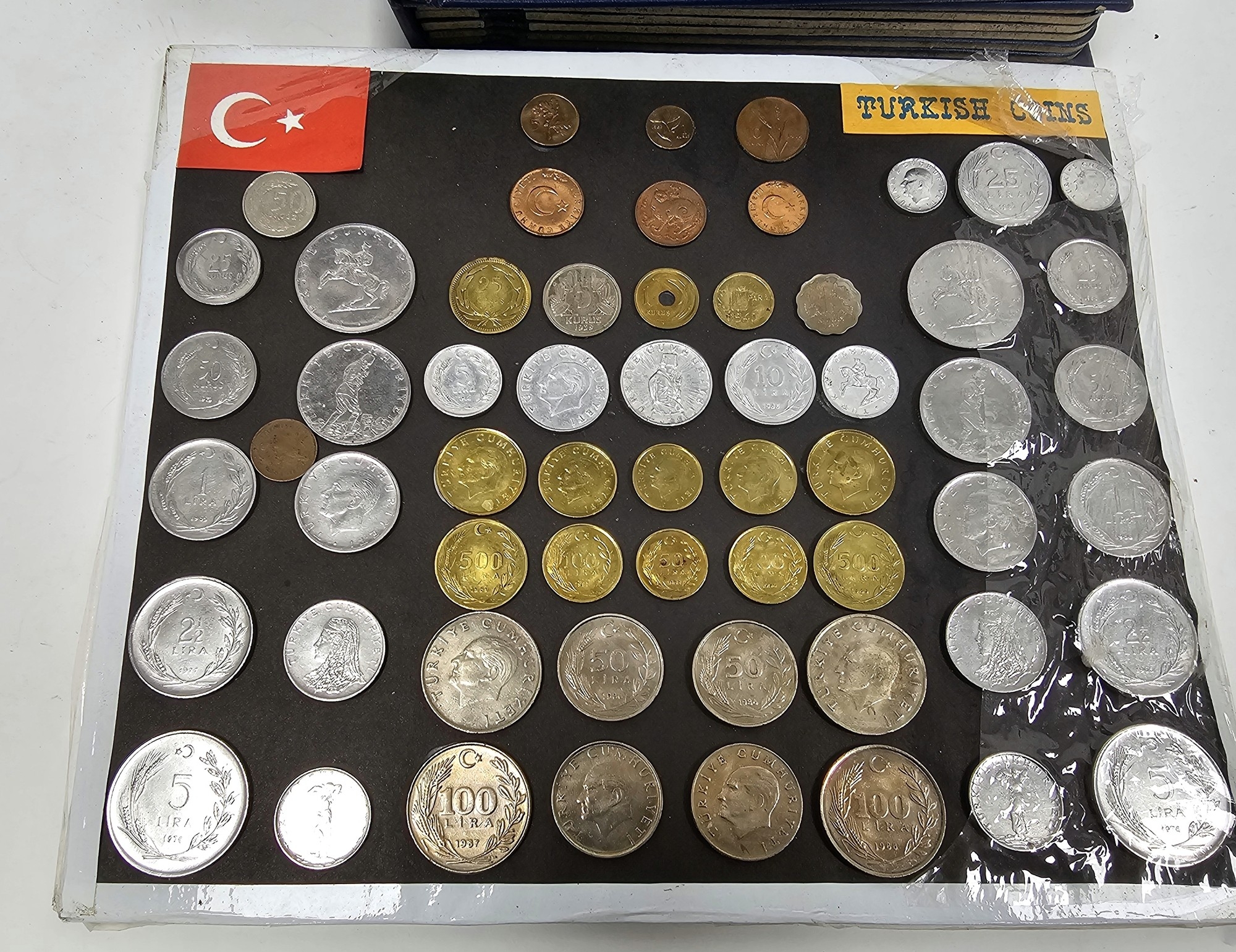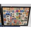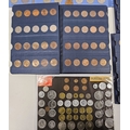Collection of coins and stamps including three Sandhill coin library albums, one containing half penny coins from 1950's onwards, another containing penny coins from 1960's onwards, and the other containing a mix of shilling coins and penny coins together with partially complete Great Britain half crowns collection from 1941, collection of Turkish coins and three framed, glazed and mounted collections of used stamps