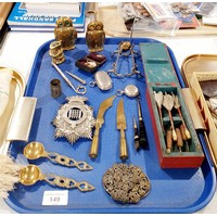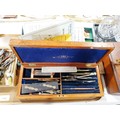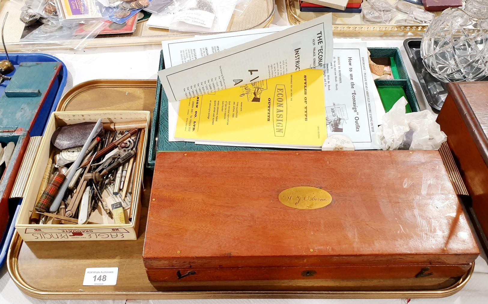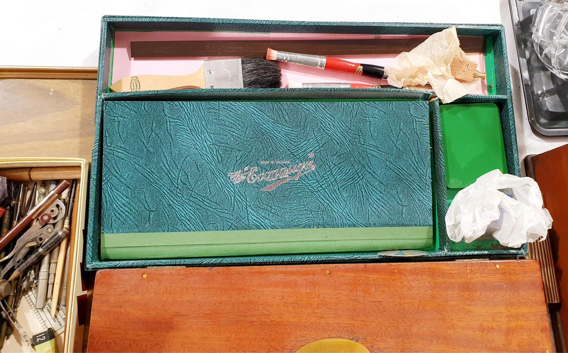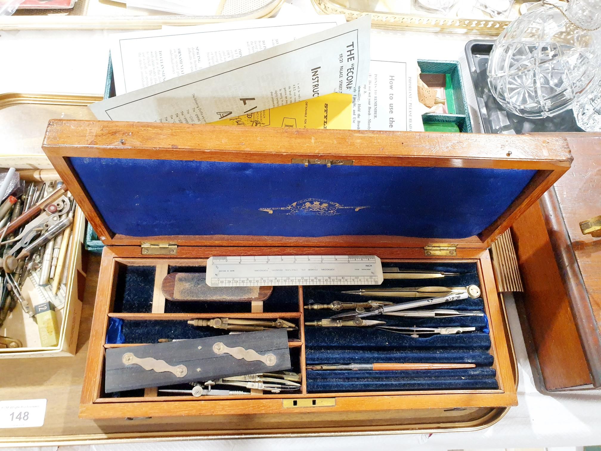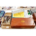 A tray of assorted including a draughtsman’s set and a tartan ware nib holder. In house shipping available excluding the United States of America.