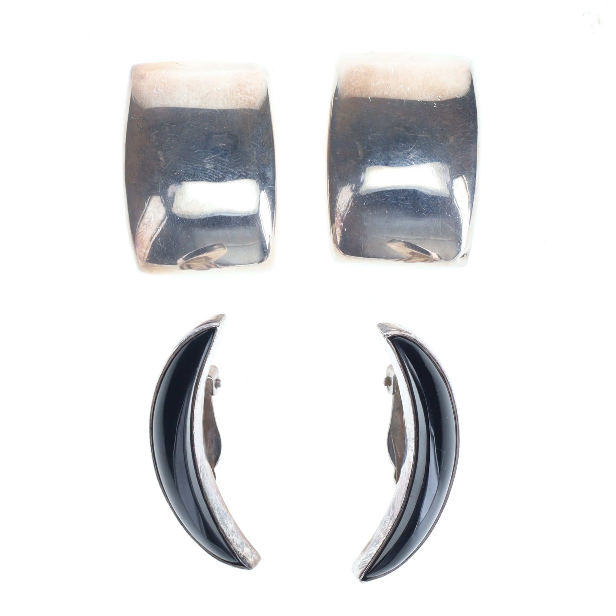 Modernist Silver Clip On Earrings Collection. Each are stamped sterling silver. Minor surface scratches, hinges are secure and in working order, stones are secure. Weighs in total 39.4g.
