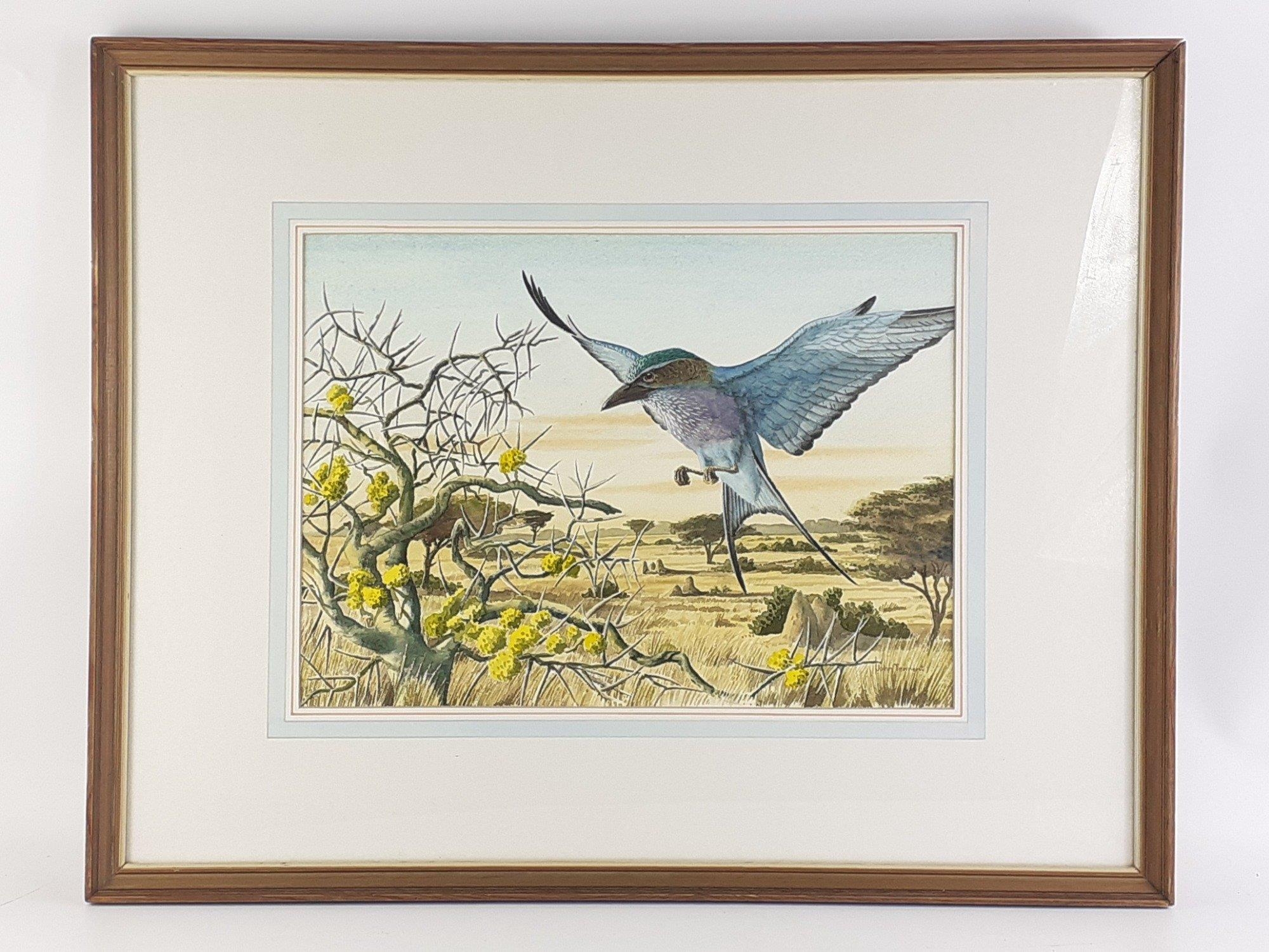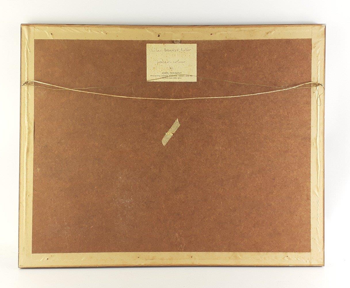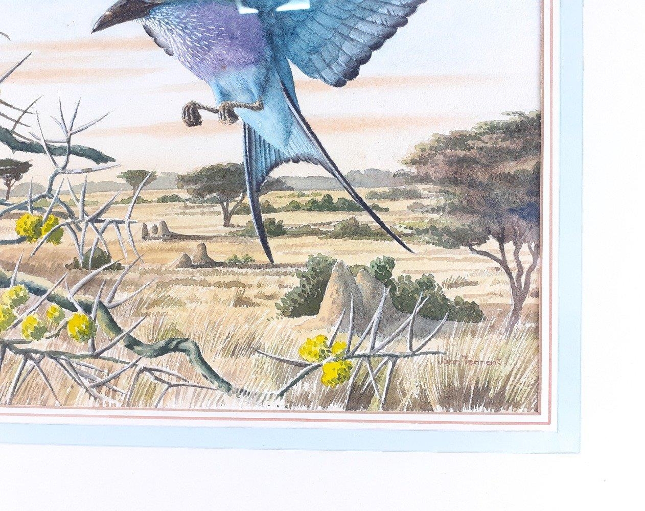 An original watercolour by JOHN TENNENT titled Lilac-Breasted Roller. Frames measures 61 x 49cm approx and visible work 37 x 27cm approx.