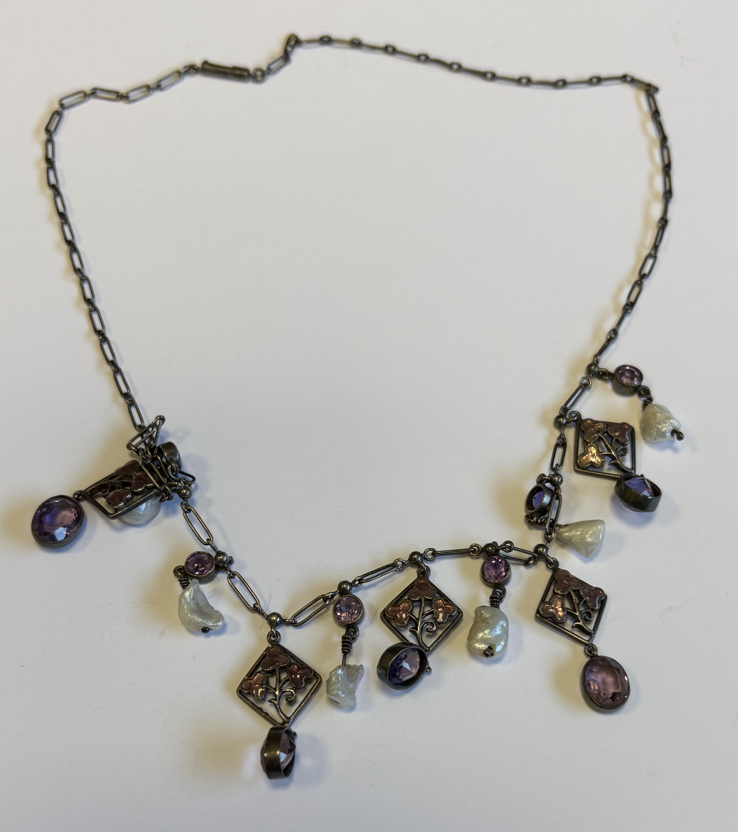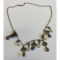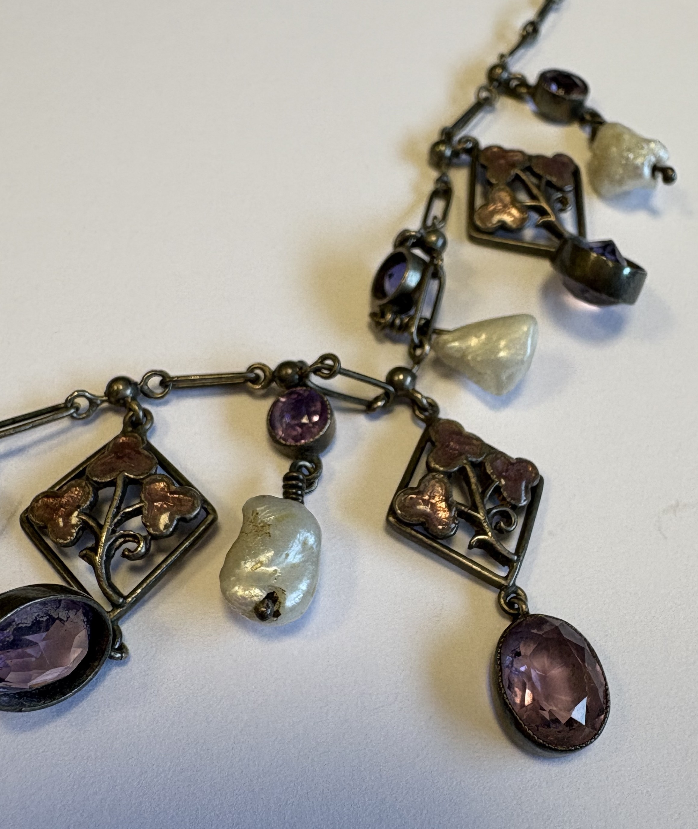 A stylish silver and pearl-drop necklace with enamel decoration. Approx. 14 grams. Est. £30 - £50.