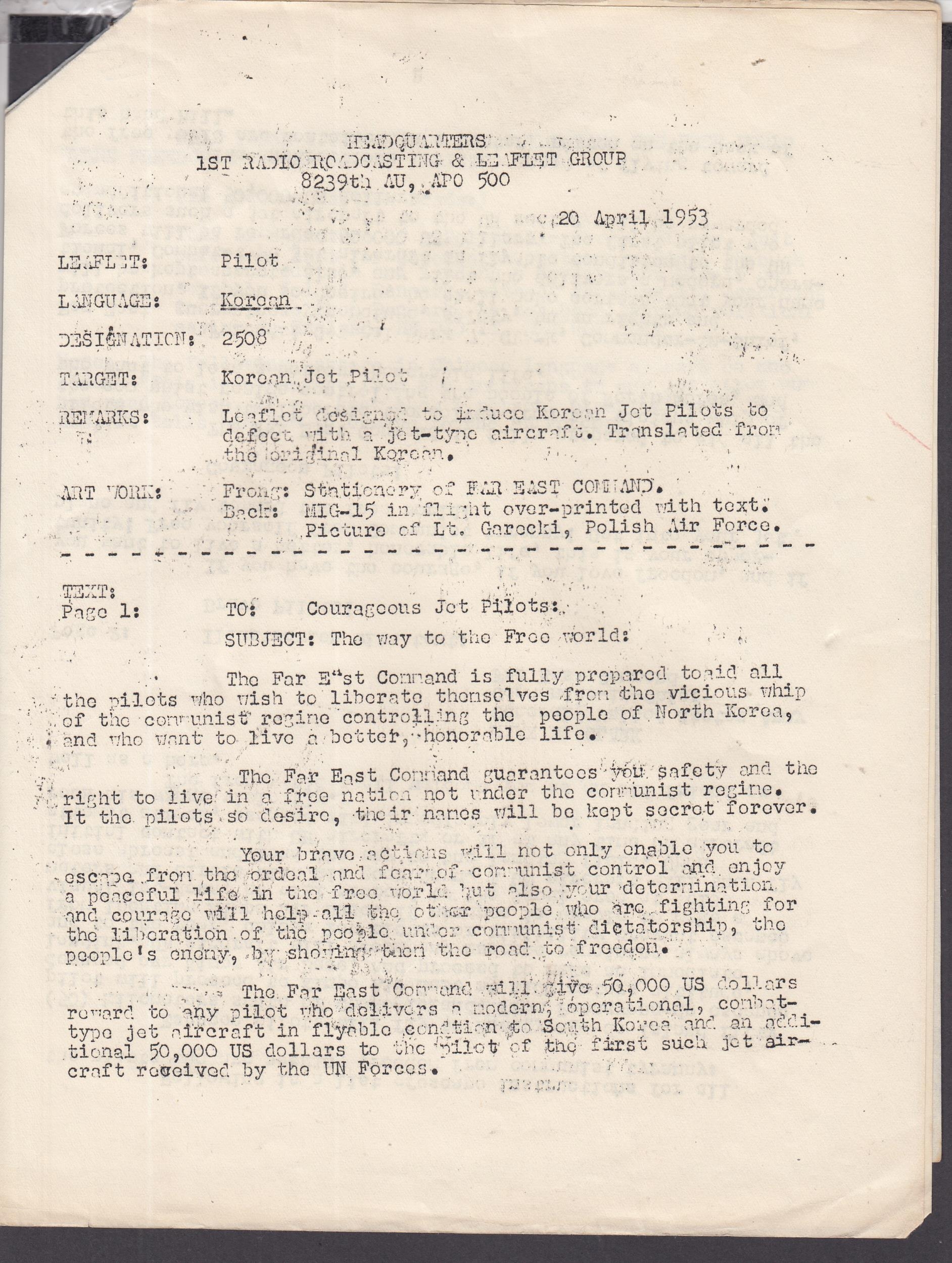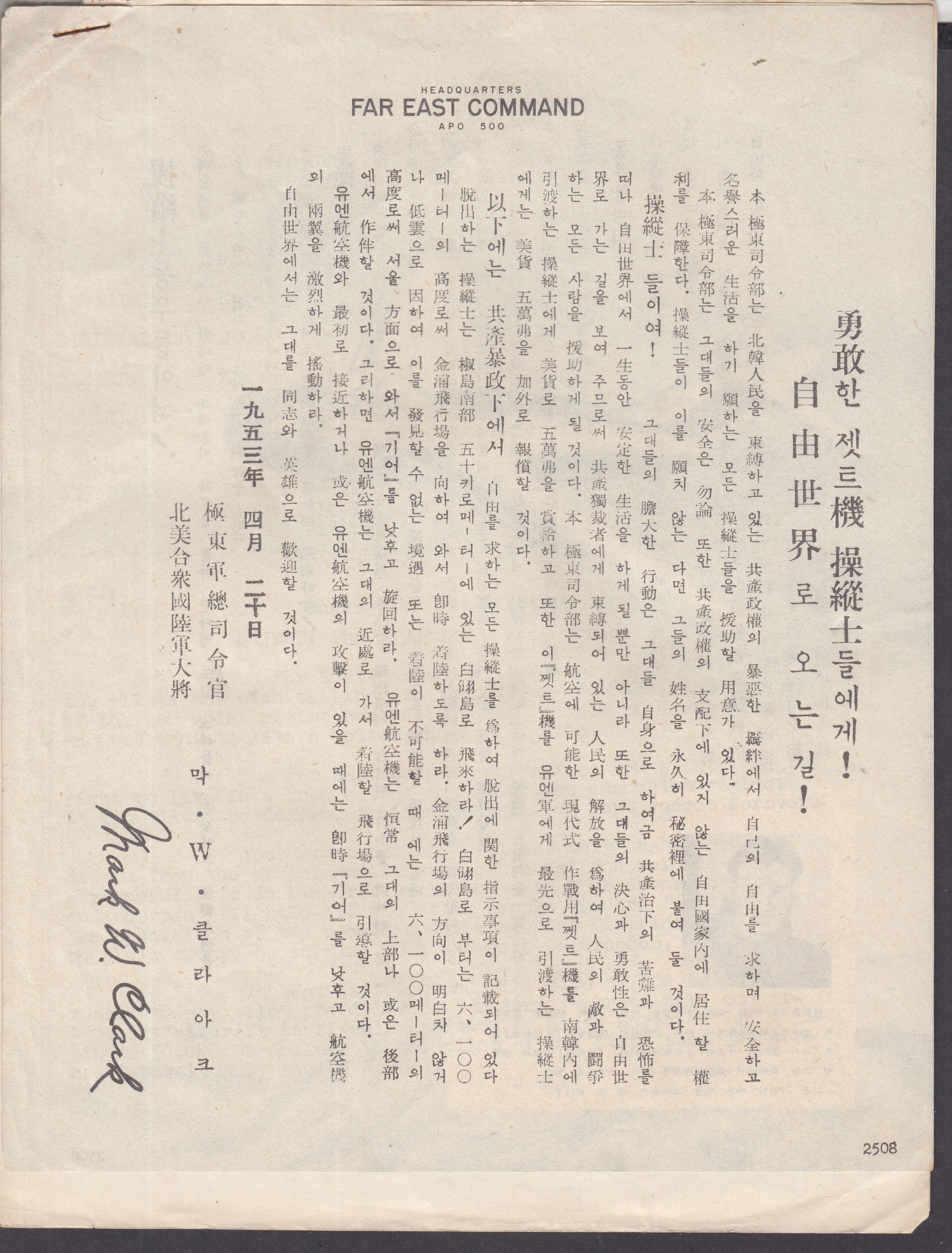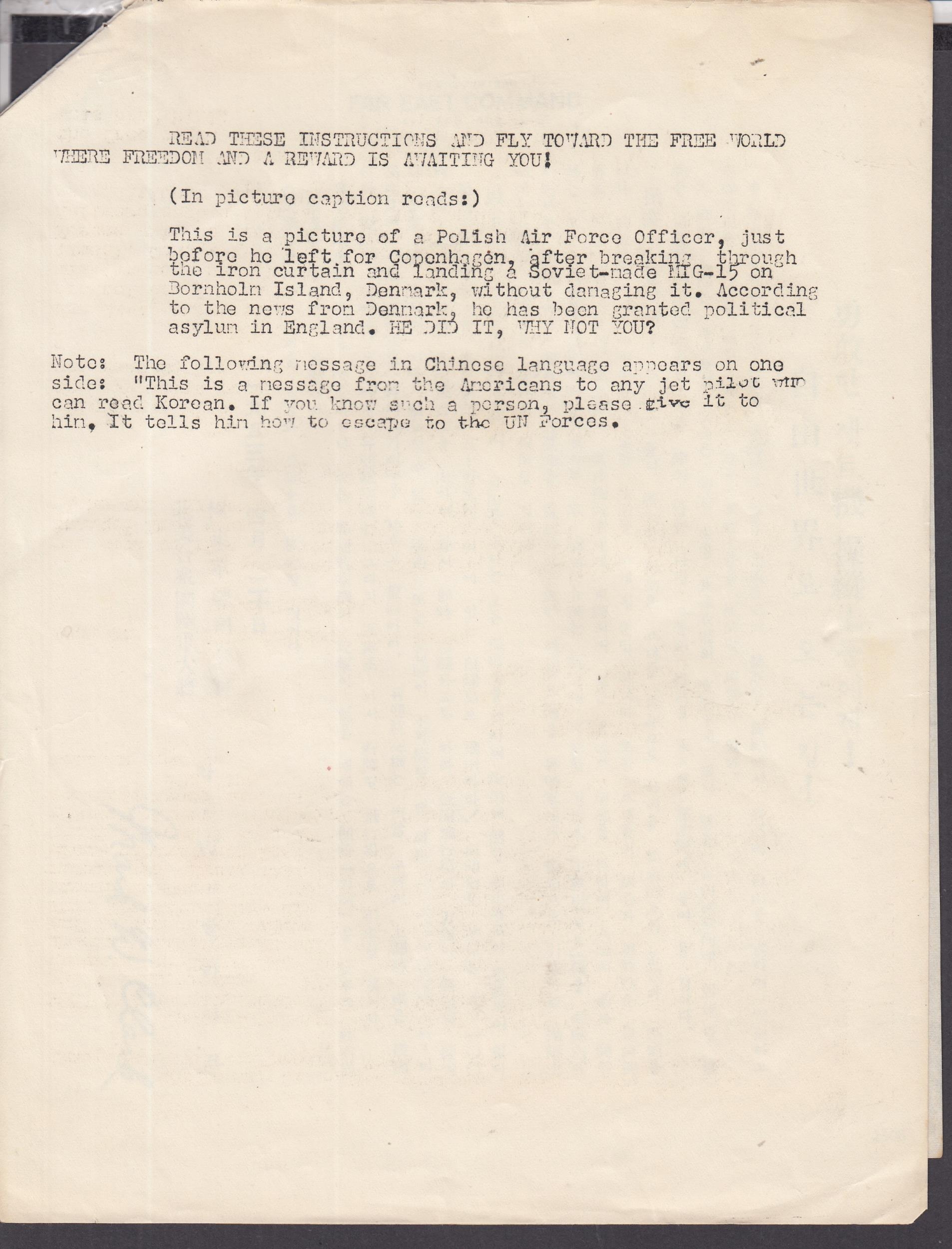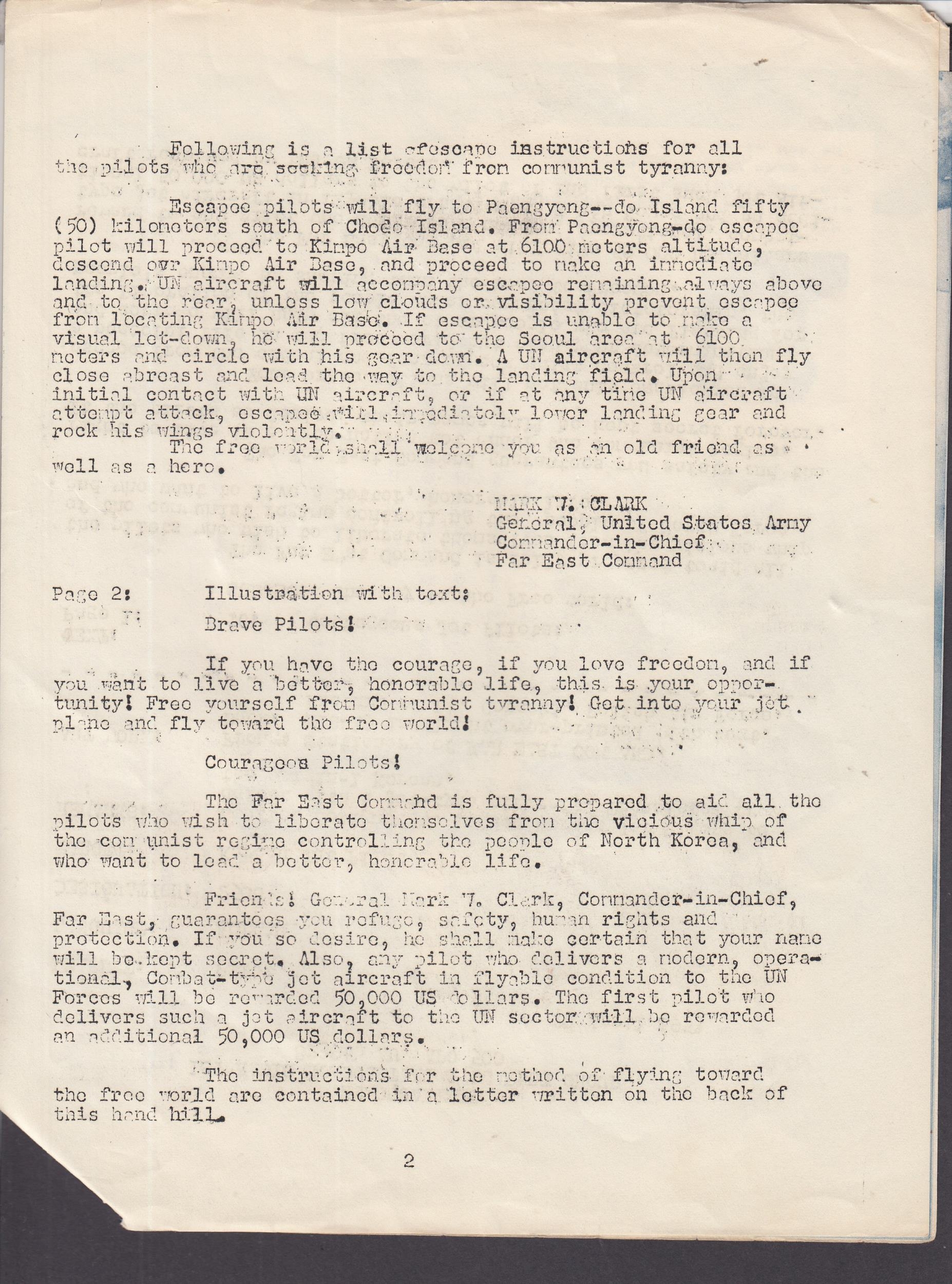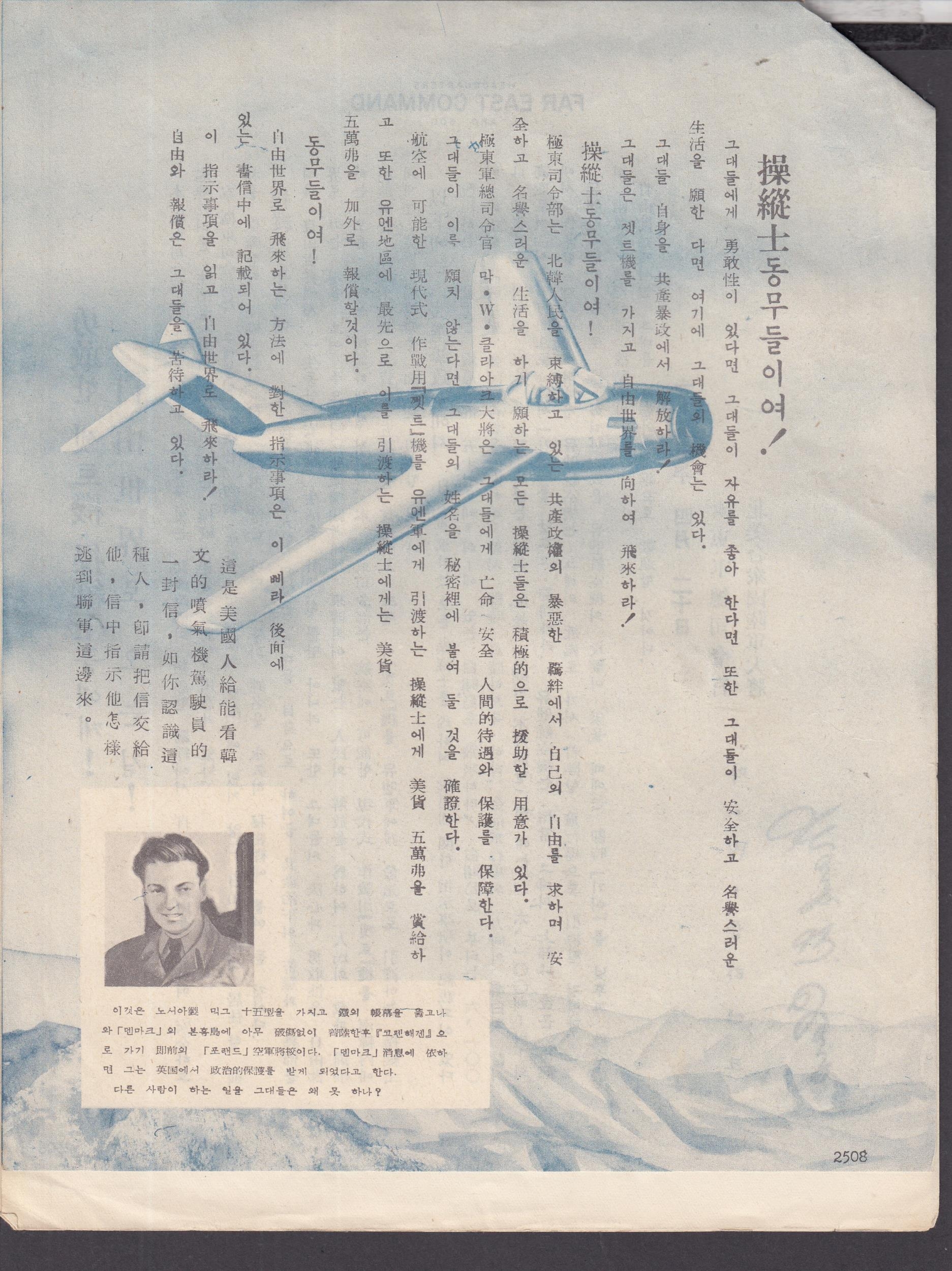 A Korean War Propaganda Letter dropped in North Korea to persuade DPRK pilots to defect.
