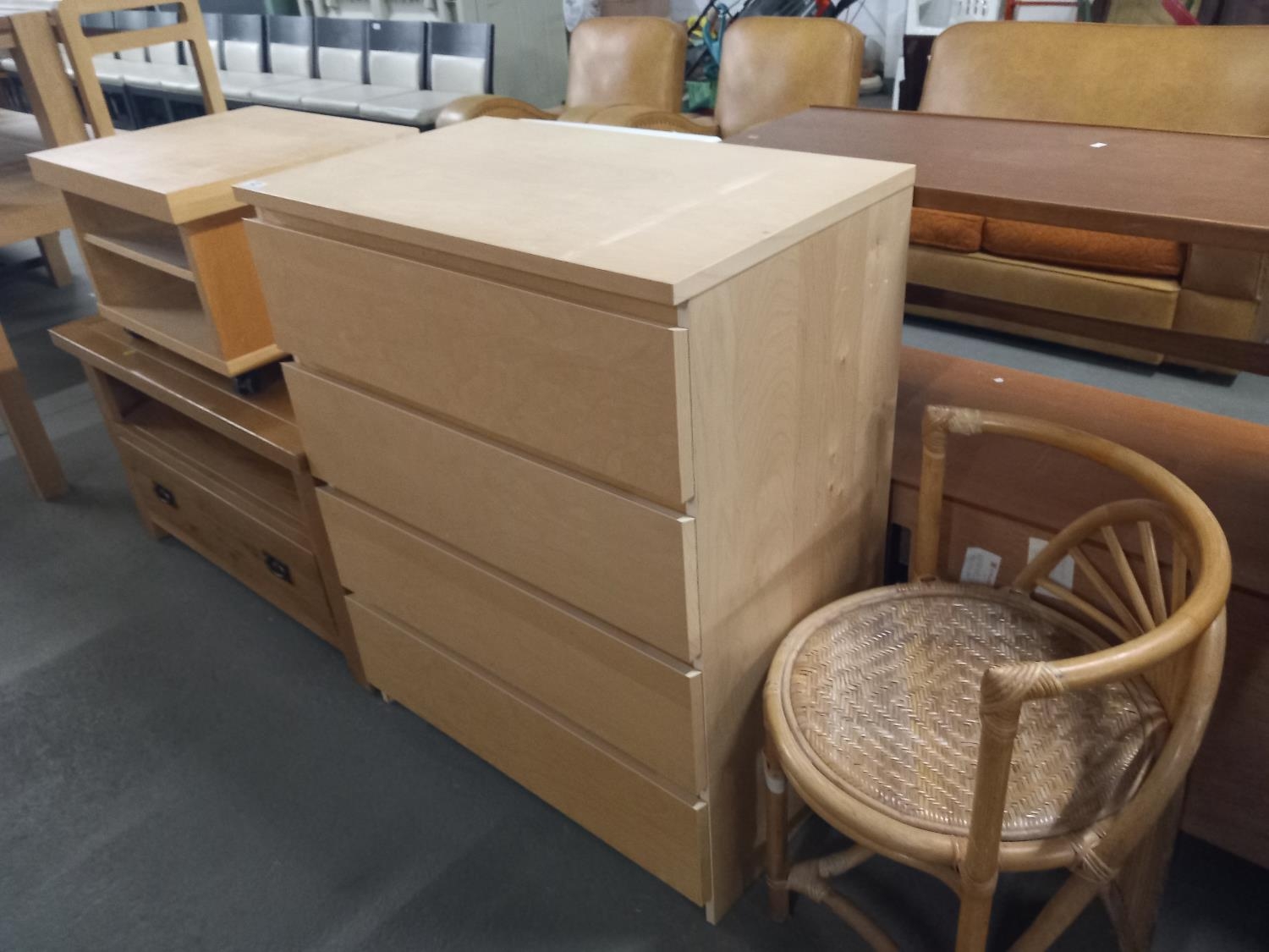 A chest of drawers, corner chair and two media cabinets