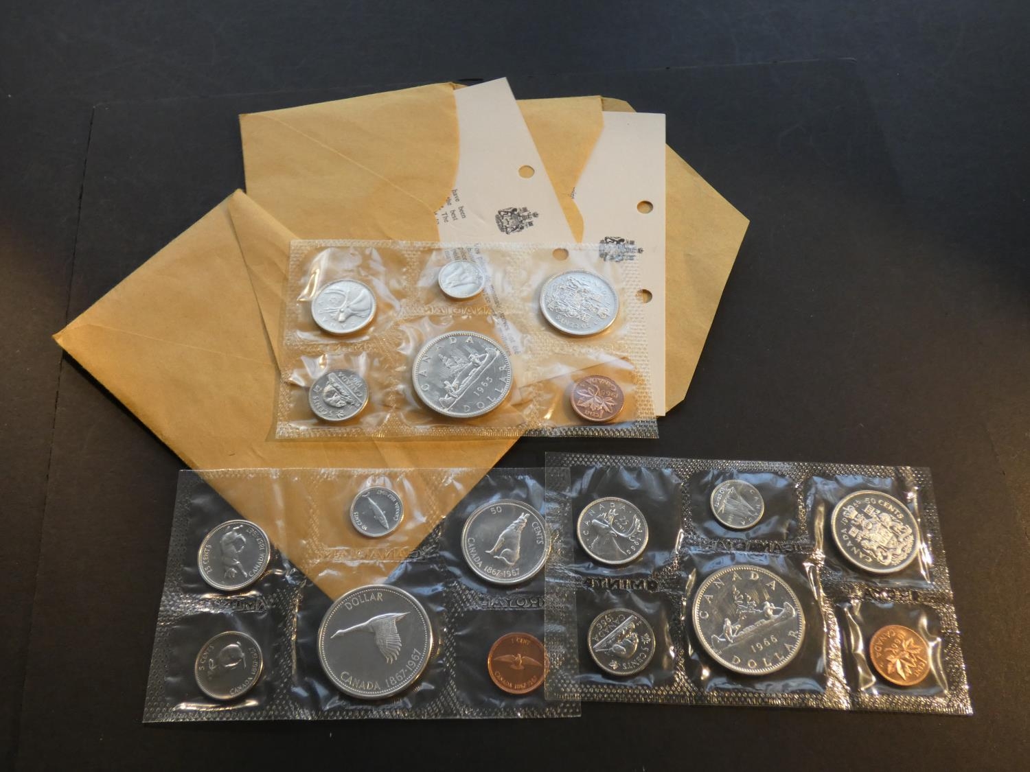 CANADA. Royal Canadian Mint, Prooflike UNC sets x3, each 6 coins, 1c to $1, including; 1965 (1$ is small beads, blunt 5 variety, type II, medal rotation), 1966 ($1 is large beads variety) and 1967 ($1 has medal alignment), UNC in original pliofilm. (3)