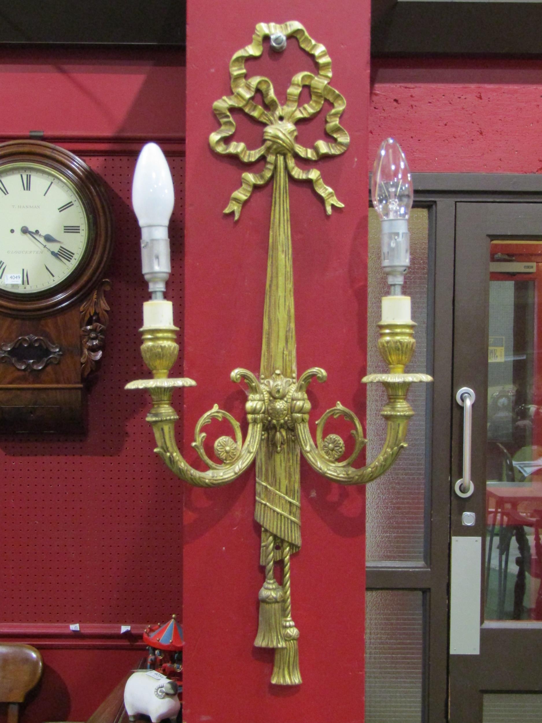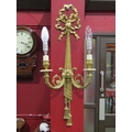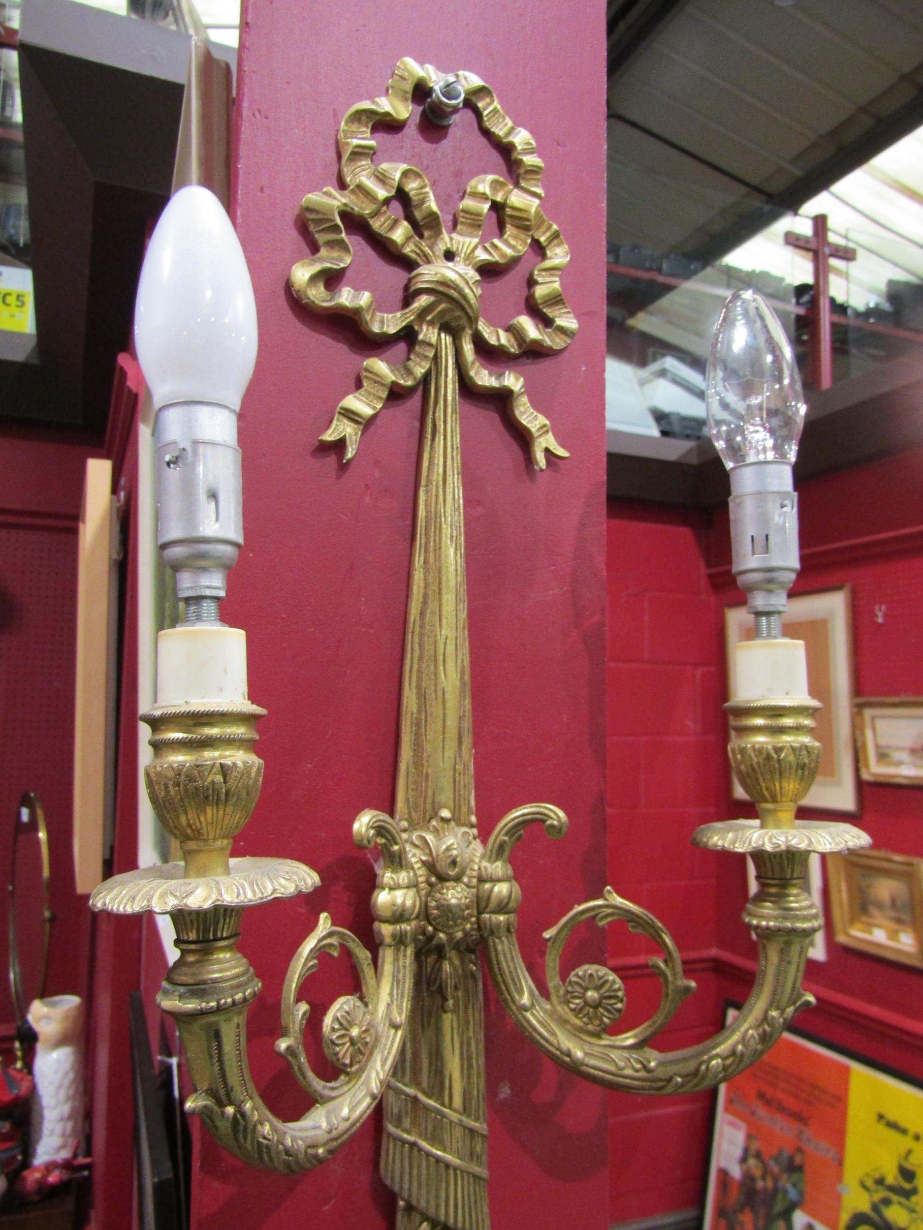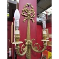 A pair of gilt metal ribbon and swag twin arm wall sconces, 60cm tall