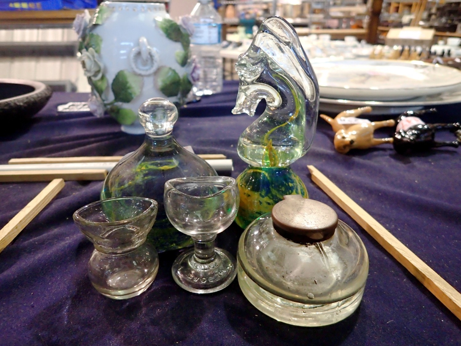 Small selection of collectable glass, including two Mdina paperweights, two vintage eyebath's and an inkwell. Not available for in-house P&P