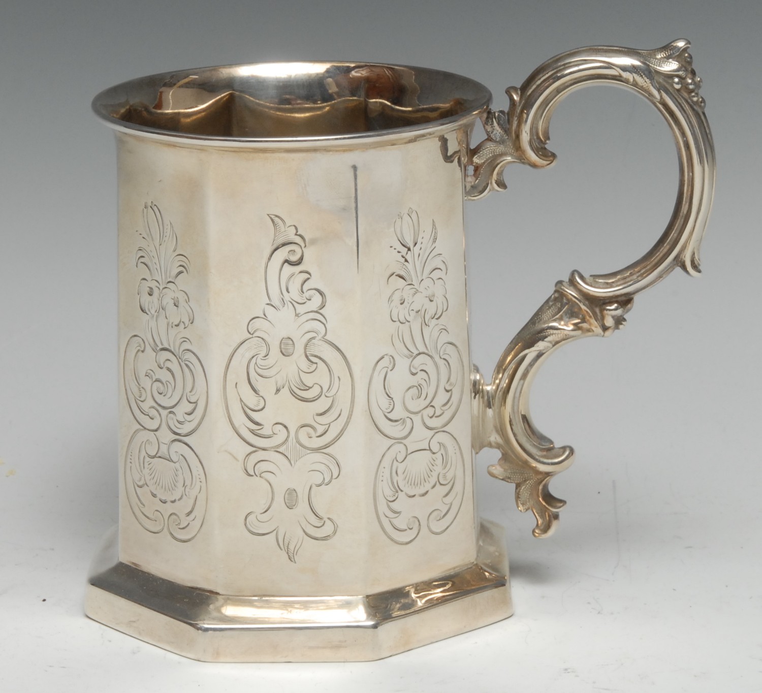 A Victorian Gothic Revival silver octagonal mug, engraved with leafy C-scrolls and cartouches, foliate double-scroll handle, skirted base, 13cm high, Henry Wilkinson & Co, Sheffield 1850, 9.5oz