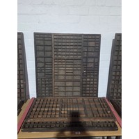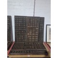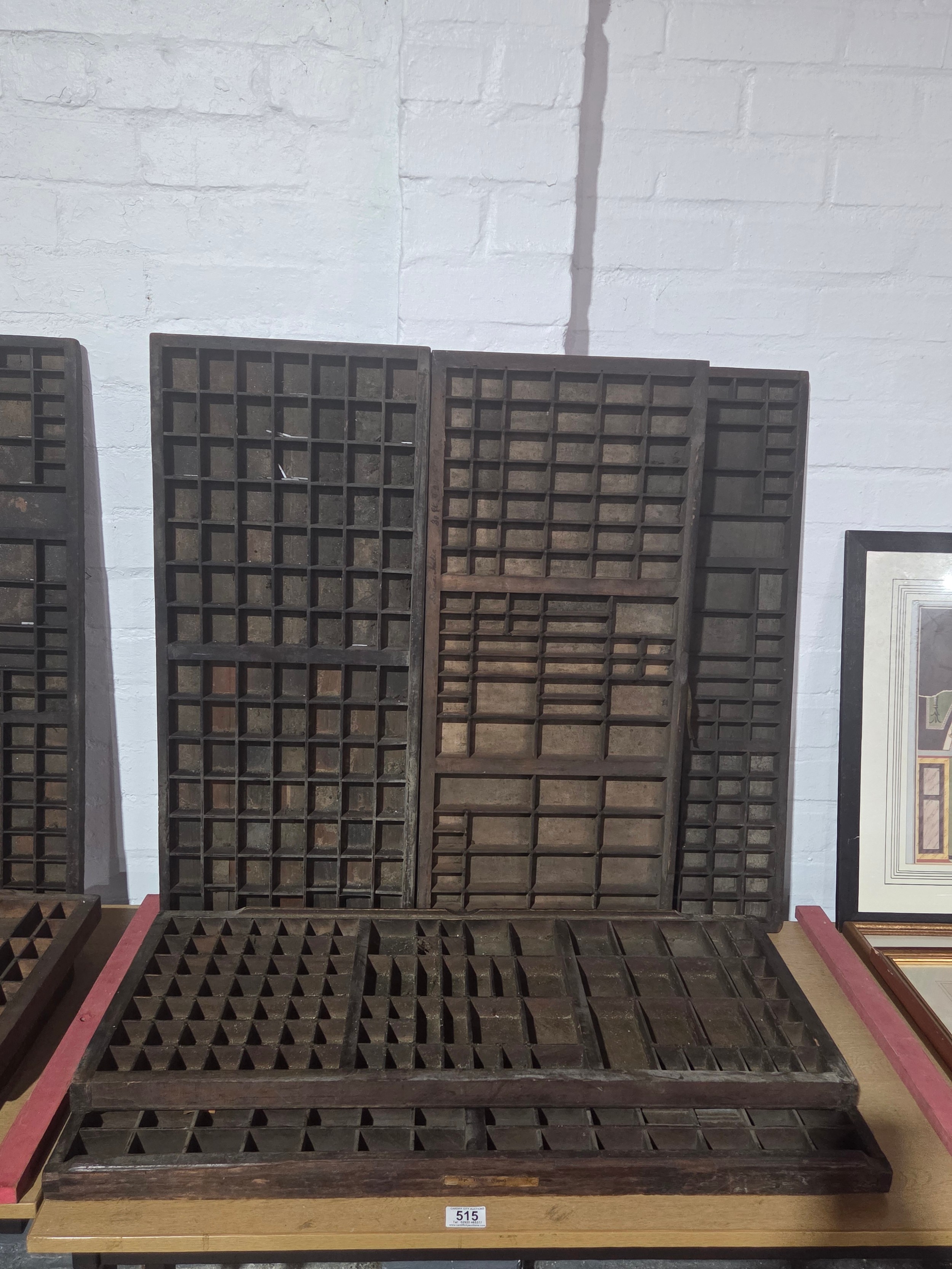 Five wooden printer's trays with compartments