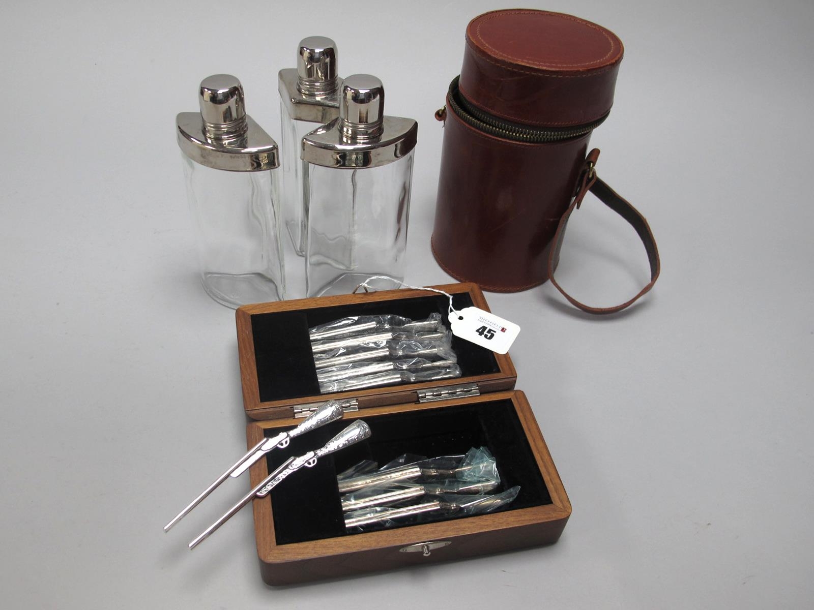 A Set of Ten Hallmarked Silver Shot Gun Shooting Markers, RC, Sheffield 2008, each with engraved decoration and numbered 1 to 10, approximately 12.5cm long, in original fitted case; Together with A Set of Three Hunting Flasks, in cylindrical carry case (height of case 18.5cm). (2)