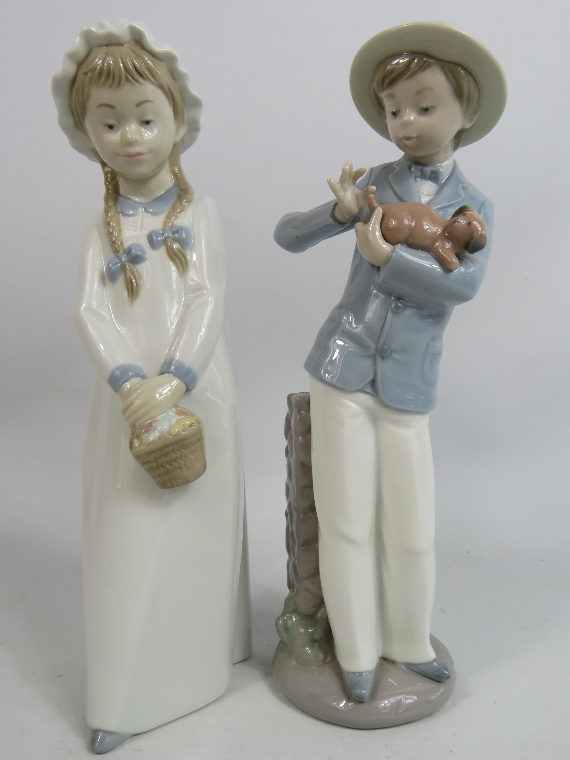 2 Nao figurines, Boy with a puppy and girl with basket. Approx 10" tall.