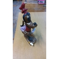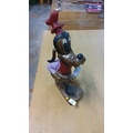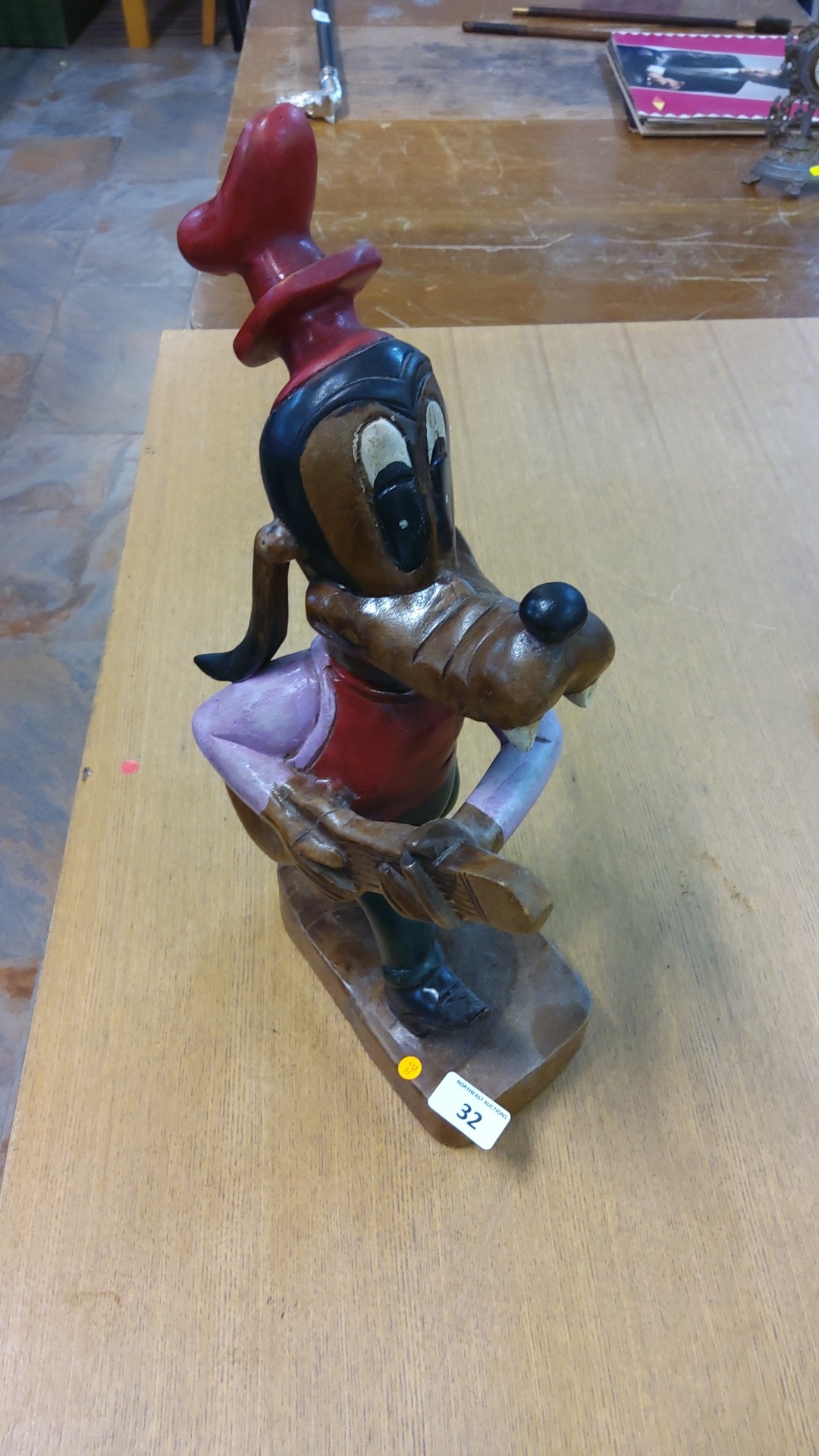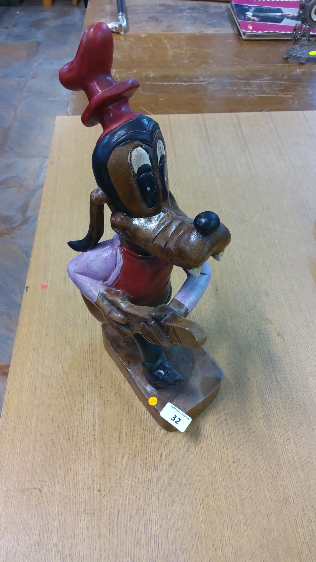 Carved and polychrome-painted wooden figure of Disney’s Goofy holding a guitar, wearing tall red hat, on integral base.