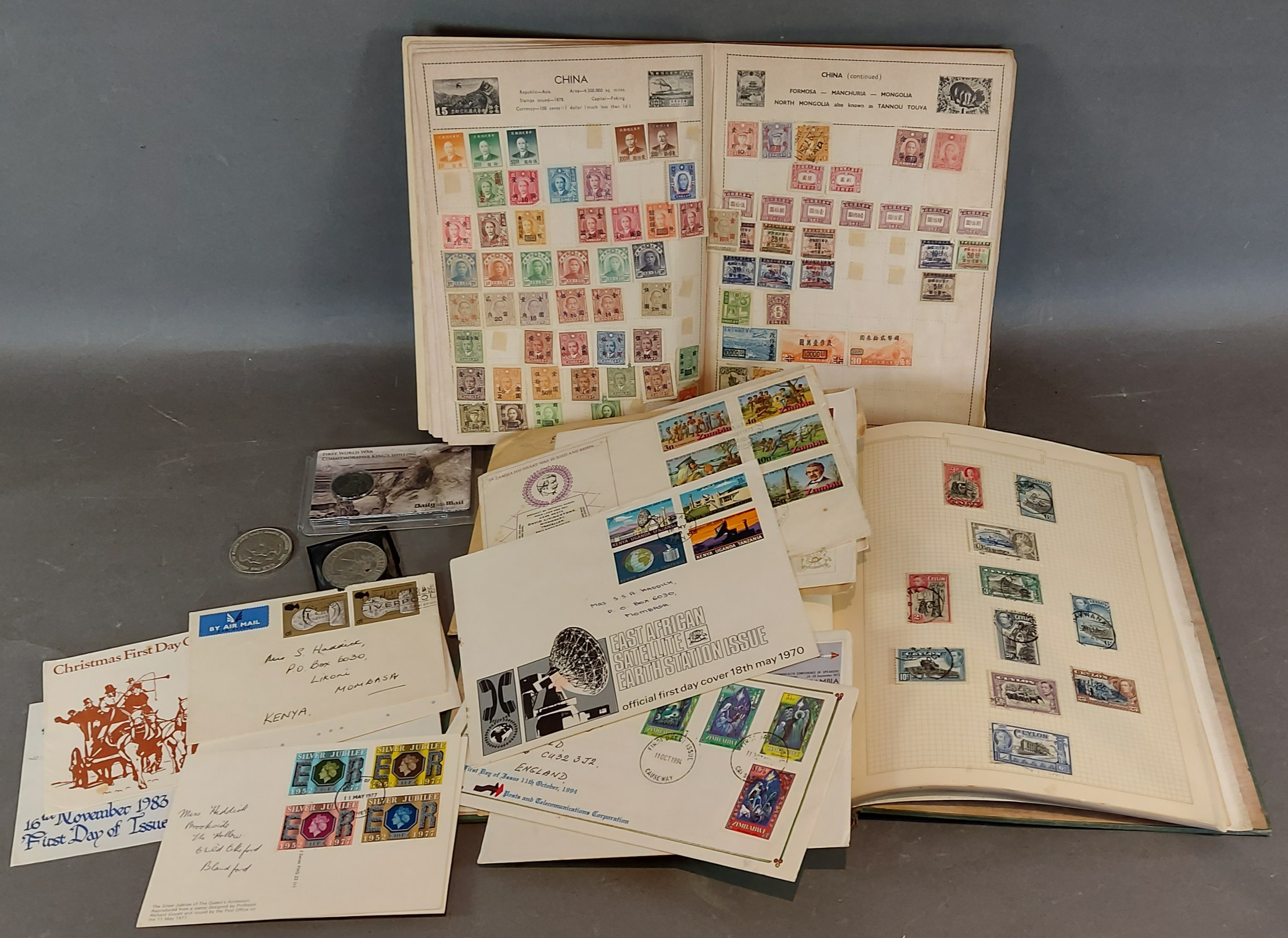 A stamp collection within albums and loose to include British and Foreign together with three commemorative coins