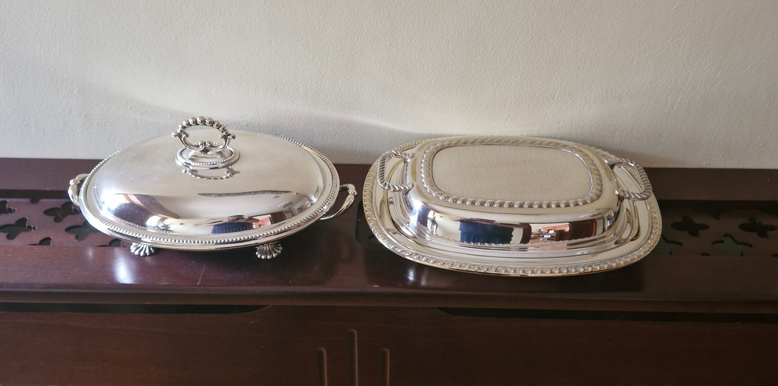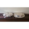 A pair of silver plated entree dishes.
