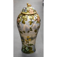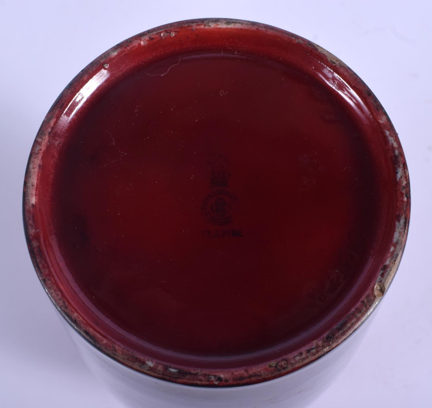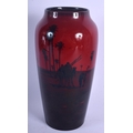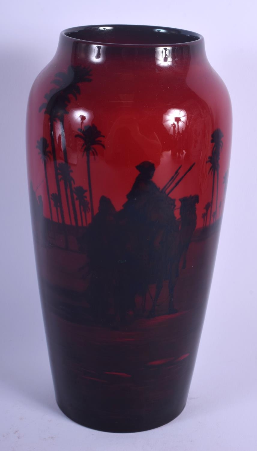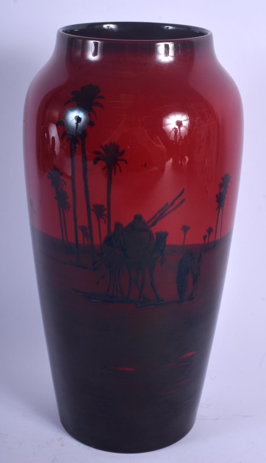 AN UNUSUAL EARLY 20TH CENTURY ROYAL DOULTON FLAMBE VASE painted with camels in an Eastern landscape. 24 cm high.
