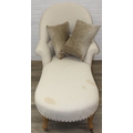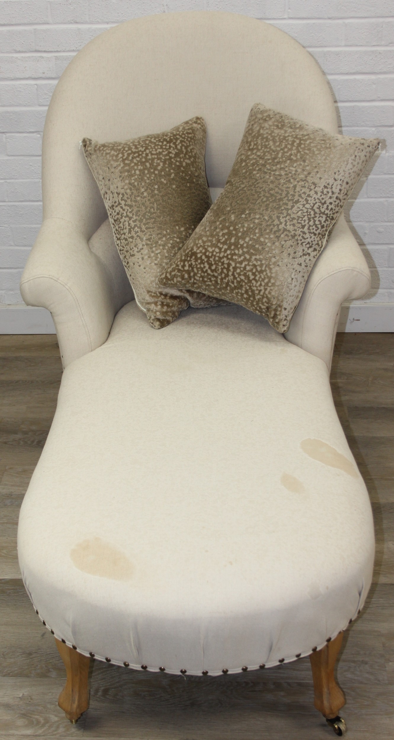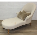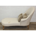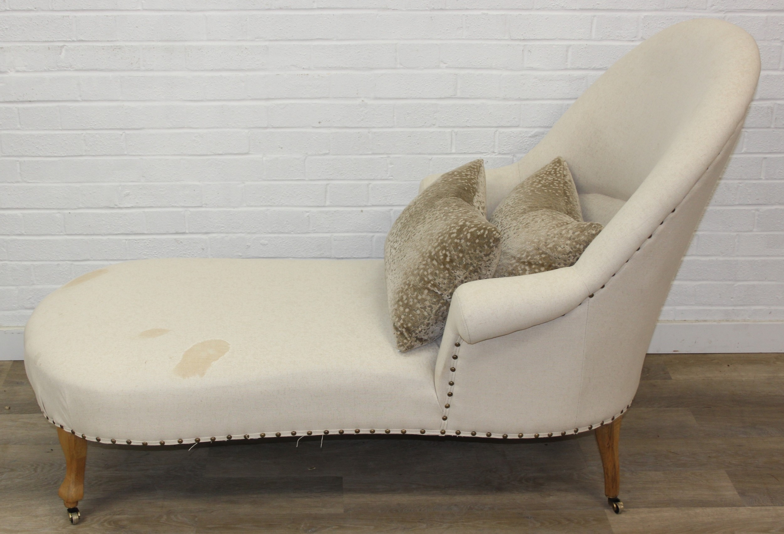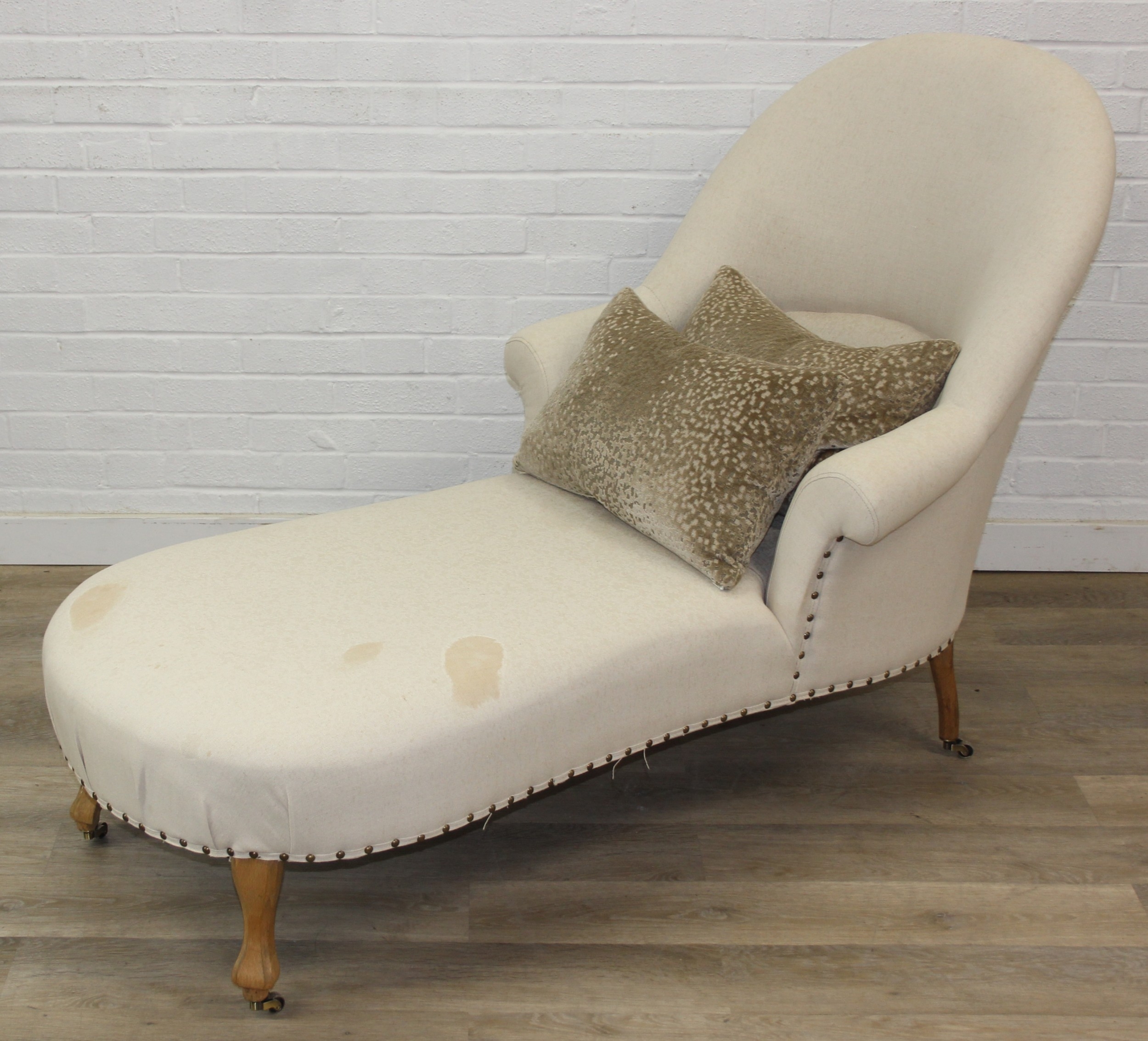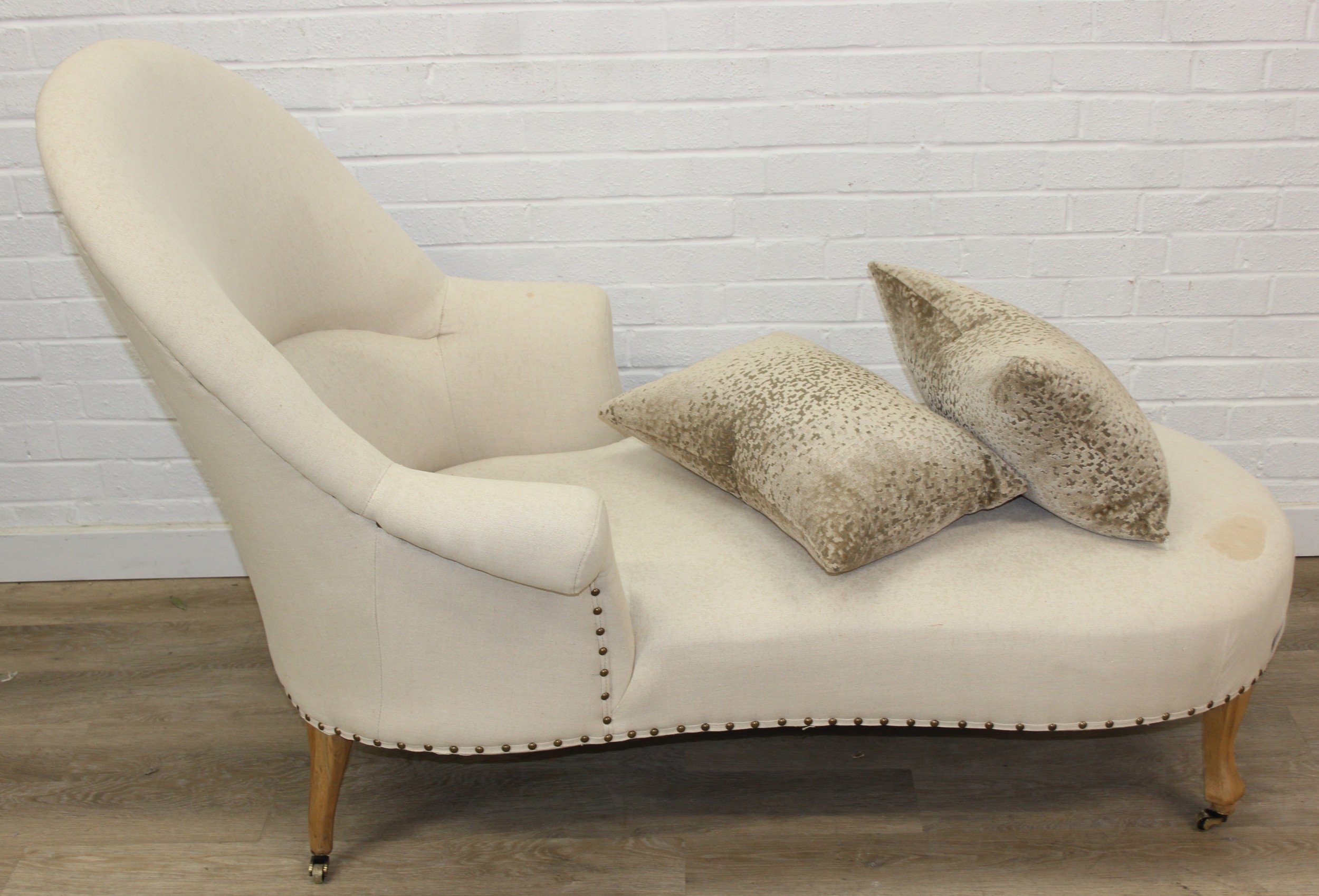 Modern chaise lounge in cream upholstery, raised on blonde wood legs with brass castors, 150cm x 80cm x 105cm
