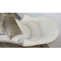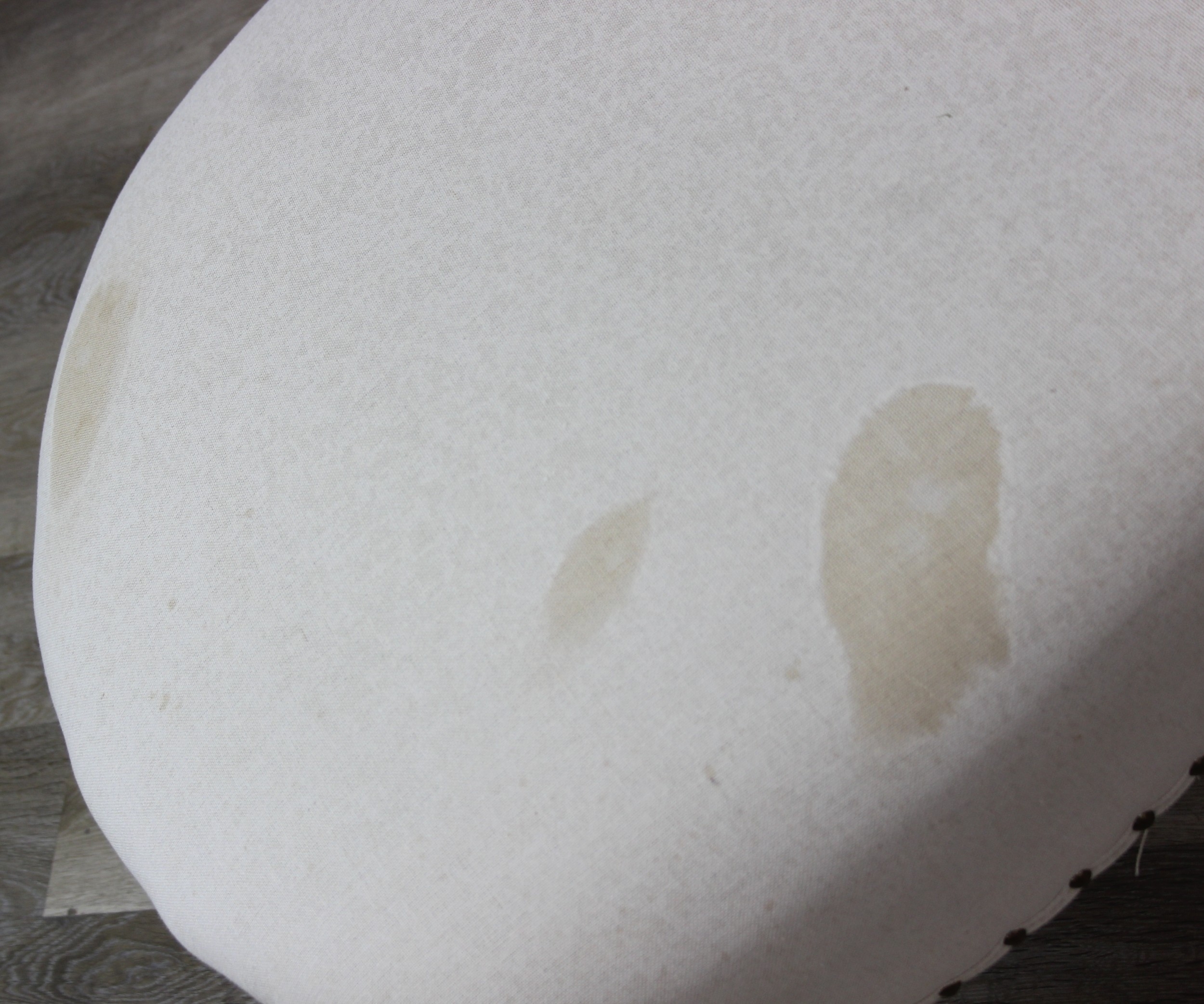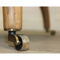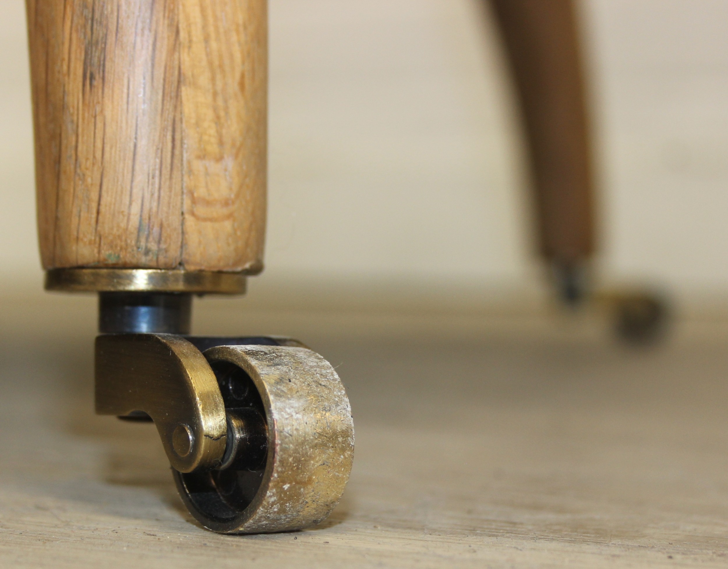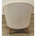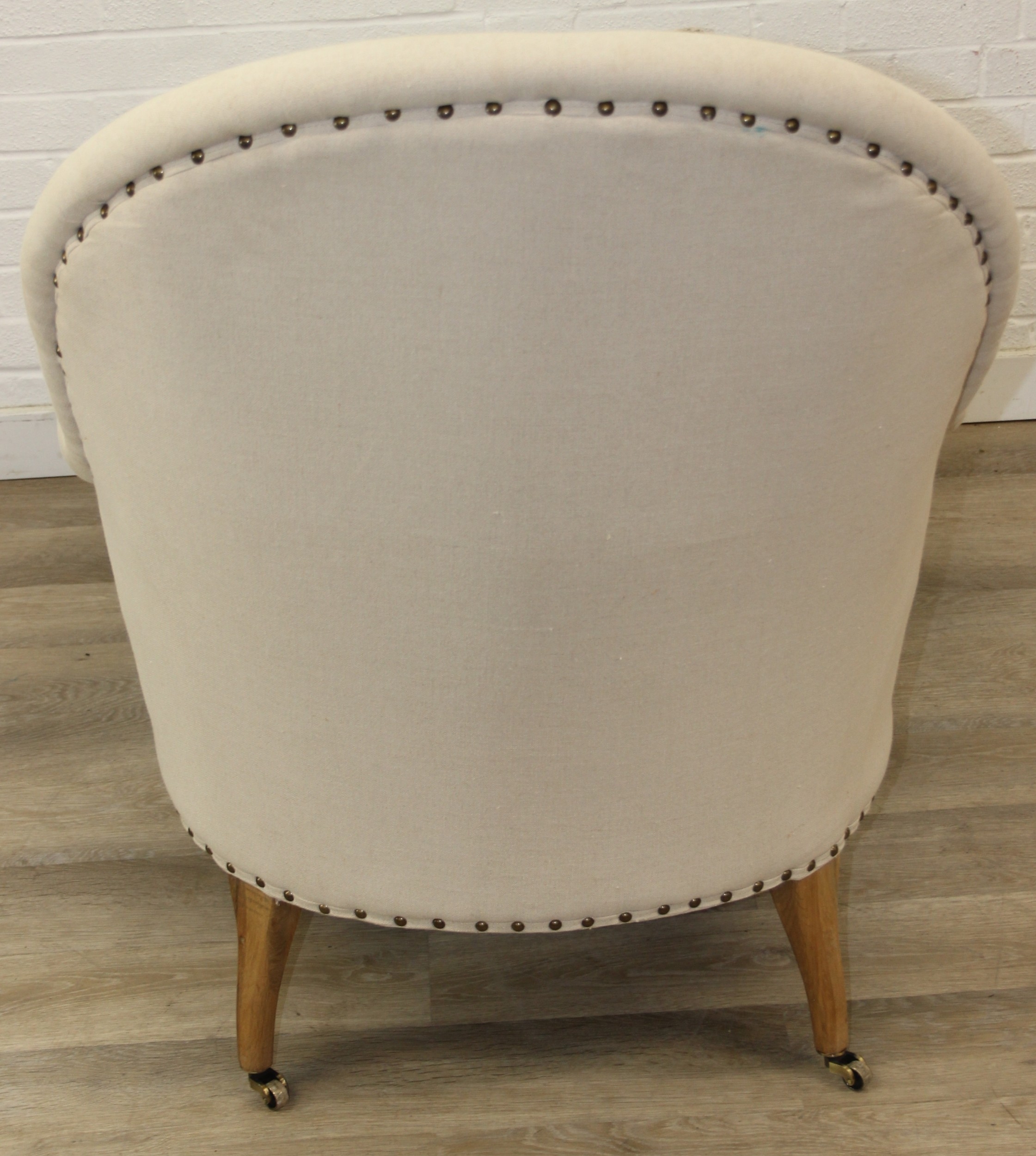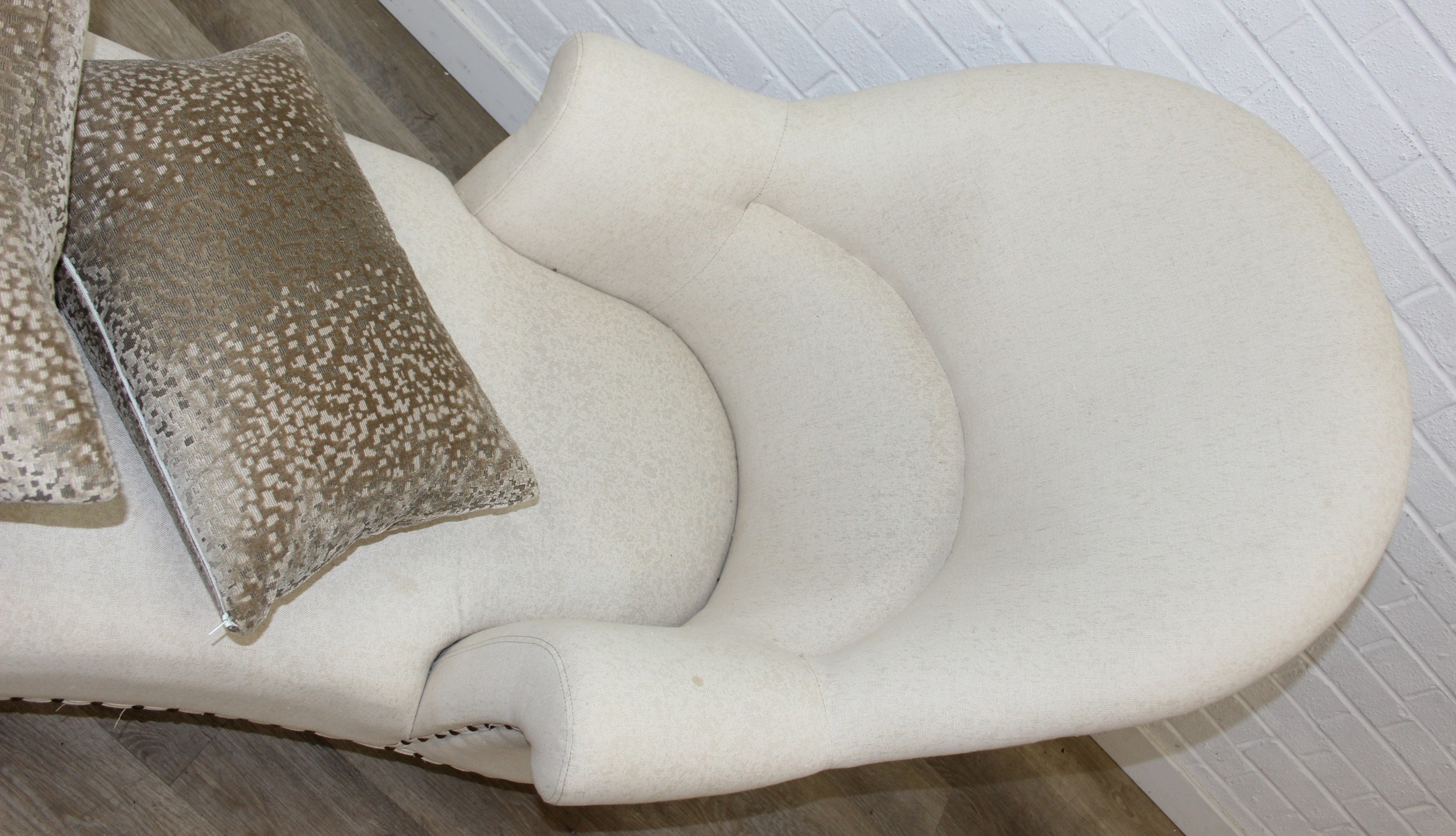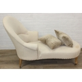 Modern chaise lounge in cream upholstery, raised on blonde wood legs with brass castors, 150cm x 80cm x 105cm