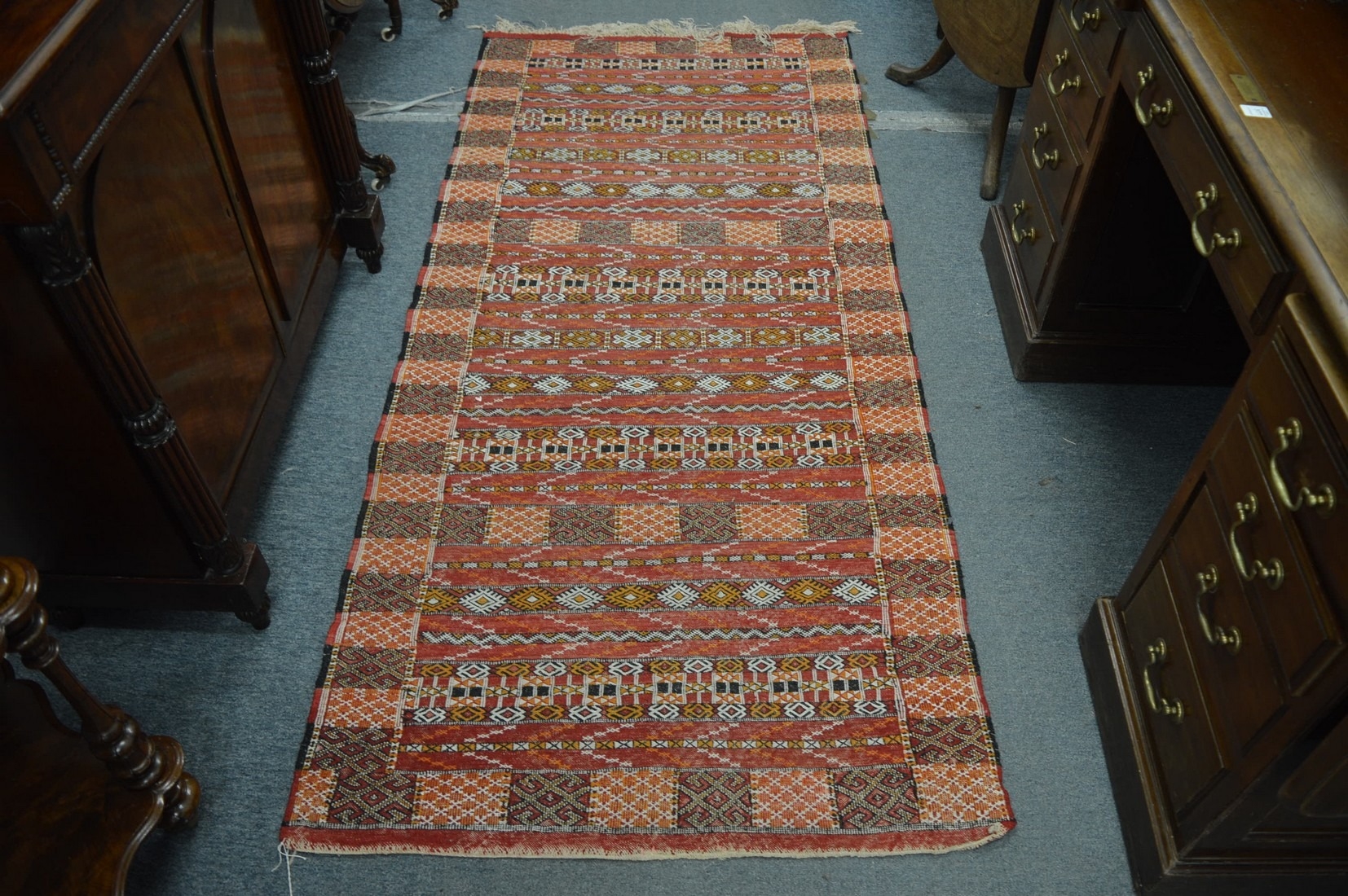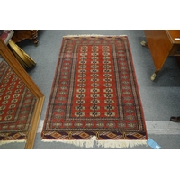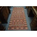 An Eastern rug, red ground with geometric decoration, 211cm x 95cm.